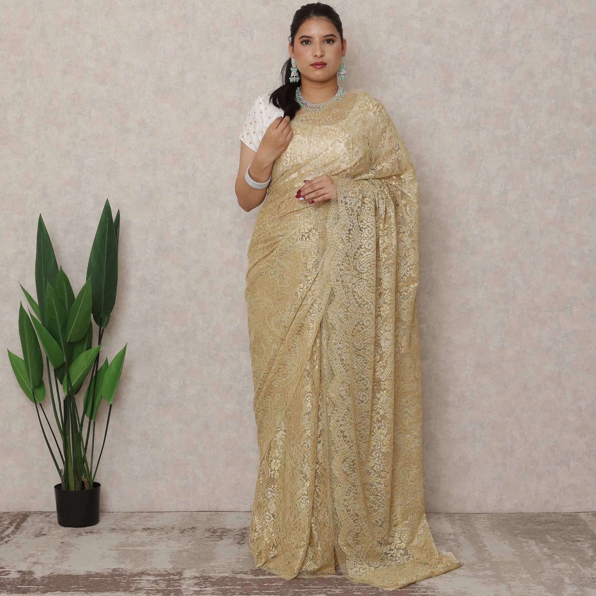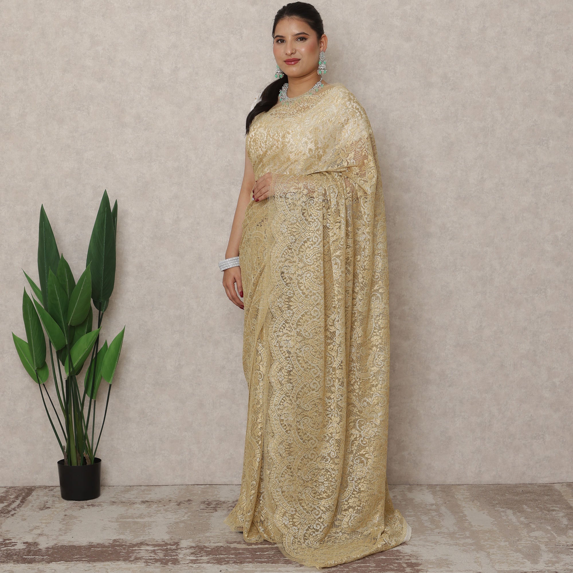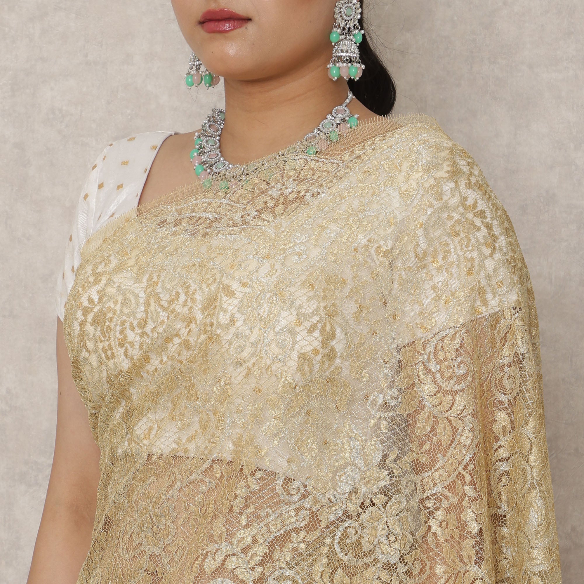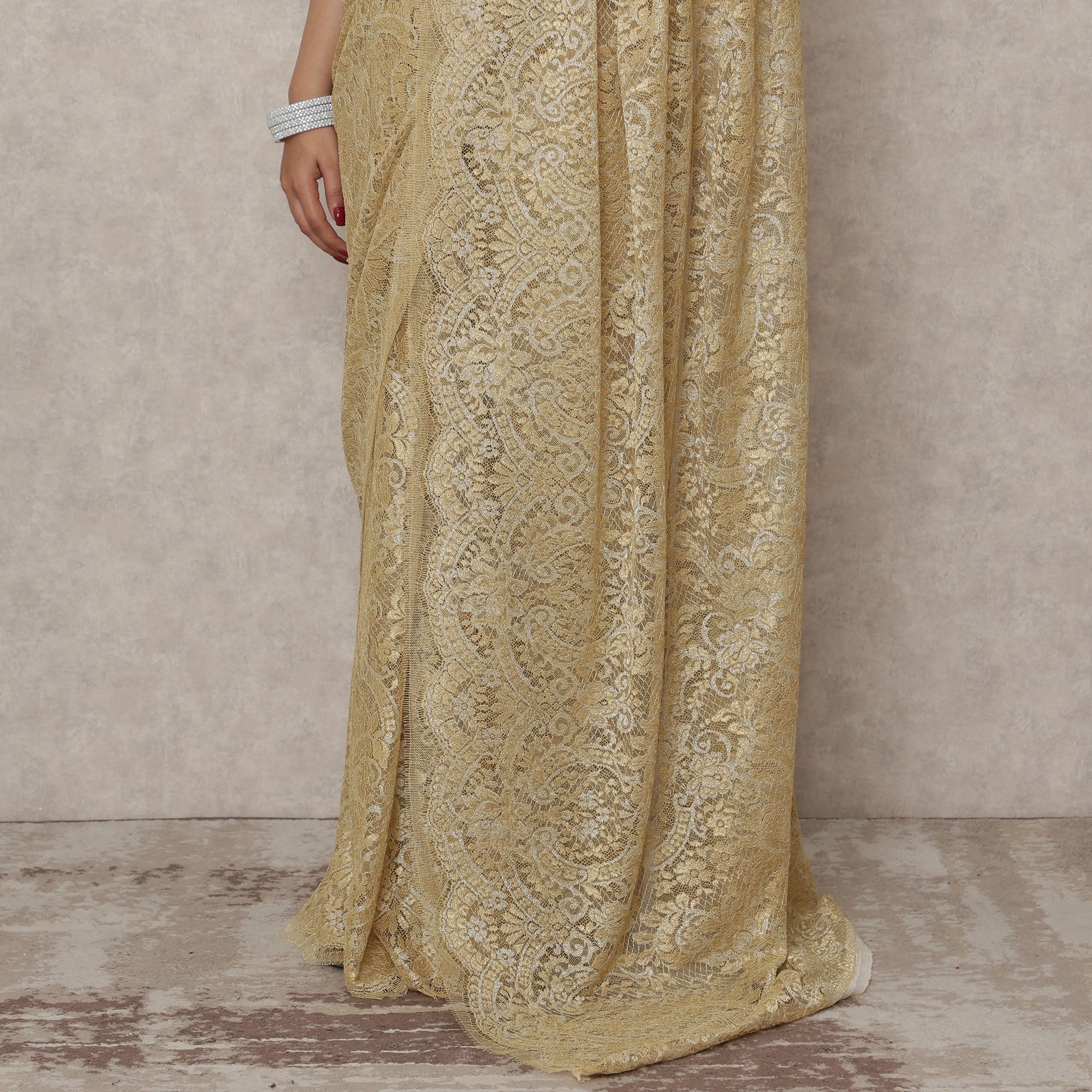 استمتعي بالفخامة مع هذا الساري الفرنسي المعدني الفاخر من دانتيل شانتيلي الذهبي العتيق، وهو قطعة فنية رائعة مصنوعة في فرنسا لمن يبحثن عن رقيّ خالد. بطول 5.5 أمتار وعرض 110 سم، يتميز هذا الساري بزخارف نباتية ونباتية متقنة منسوجة في دانتيل شانتيلي فاخر، مشبعة بخيوط معدنية ذهبية تتألق برشاقة مع كل حركة. يضفي اللون الذهبي العتيق لمسة من السحر الكلاسيكي، مع الحفاظ على طابع ملكي متعدد الاستخدامات لفساتين الزفاف والمناسبات الاحتفالية والاحتفالات الراقية. توفر الحرفية الدقيقة والملمس خفيف الوزن الراحة وجاذبية راقية، مما يجعله مثاليًا للارتداء برشاقة. أناقته الشفافة هي مزيج مثالي من التقاليد الهندية والرقي الفرنسي، مثالية للمرأة العصرية. لا يشمل المنتج بلوزة. اشتريه عبر الإنترنت الآن وعززي خزانة ملابسك التقليدية بهذه التحفة الفنية.