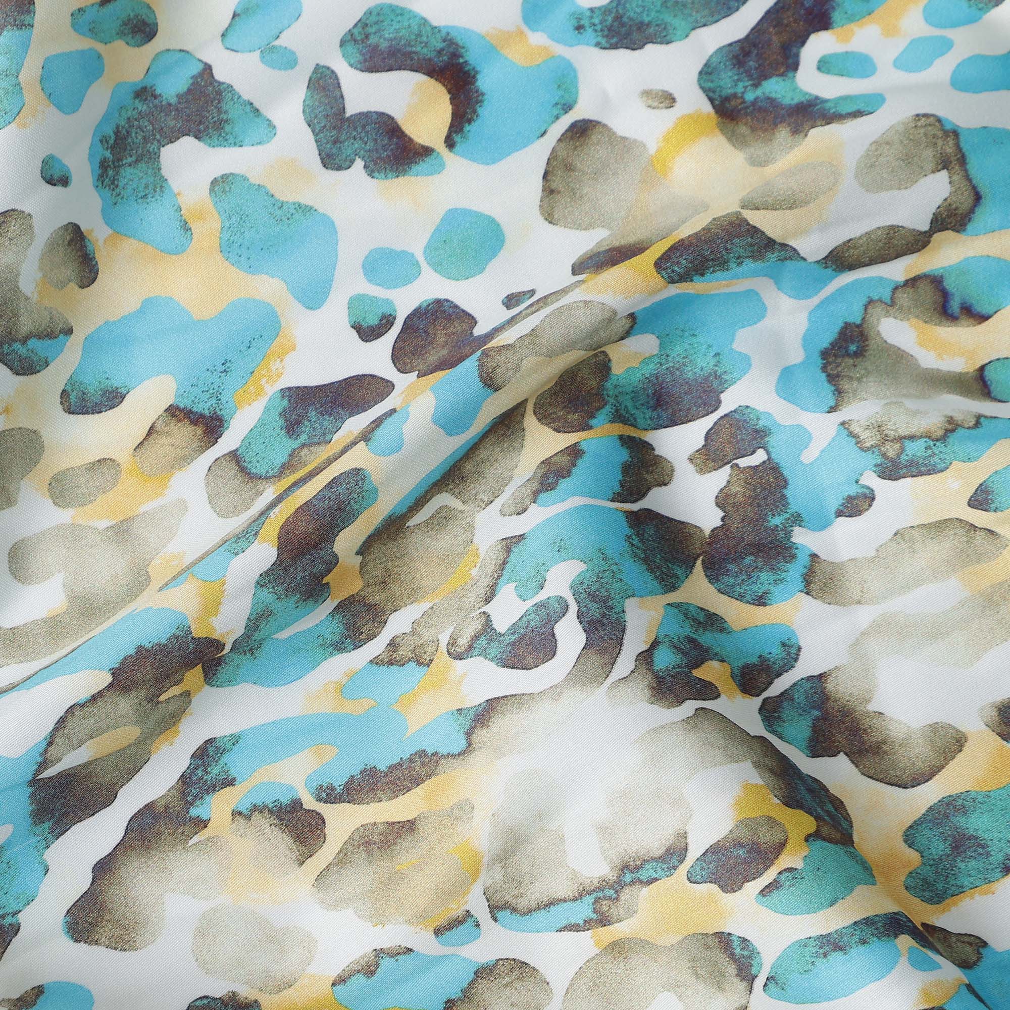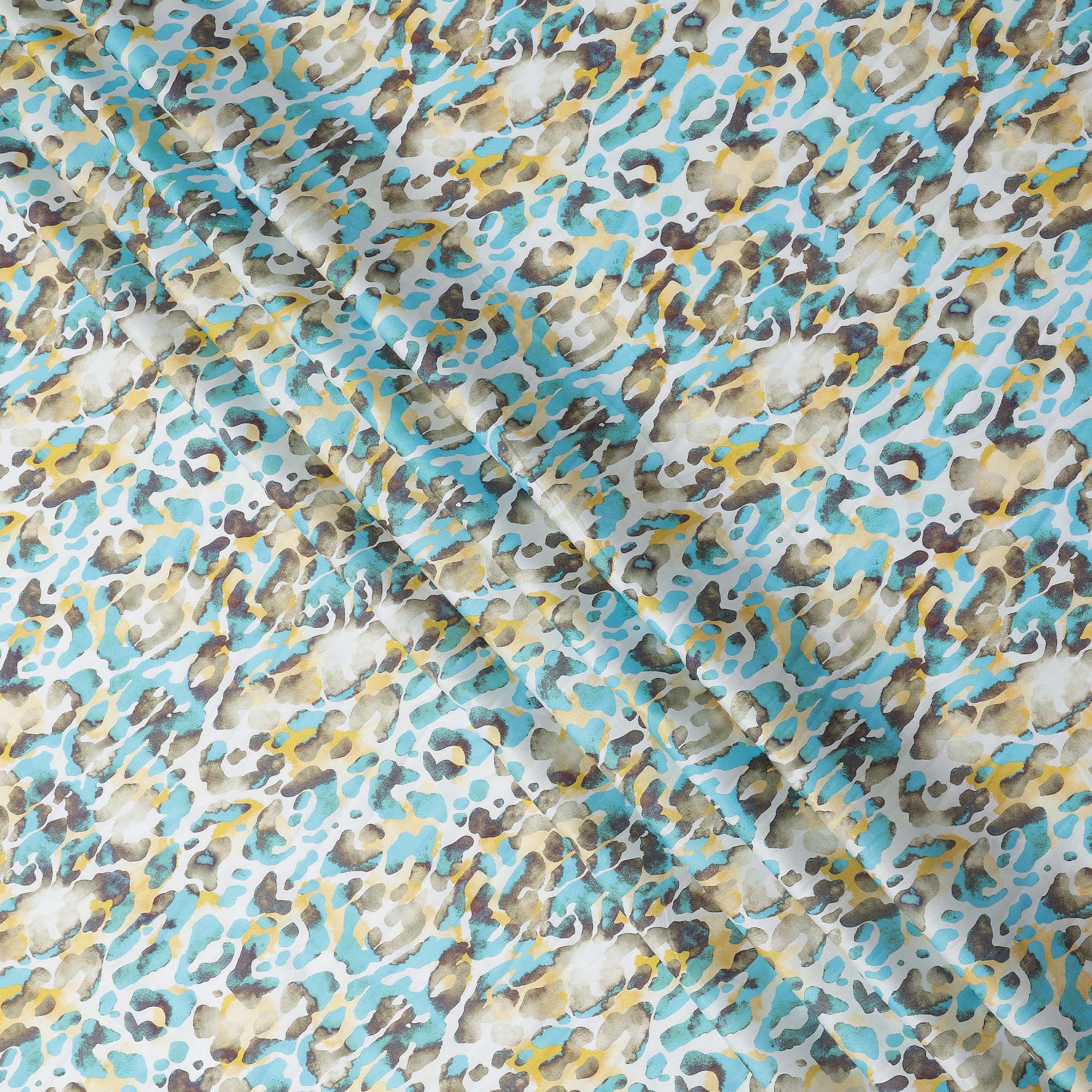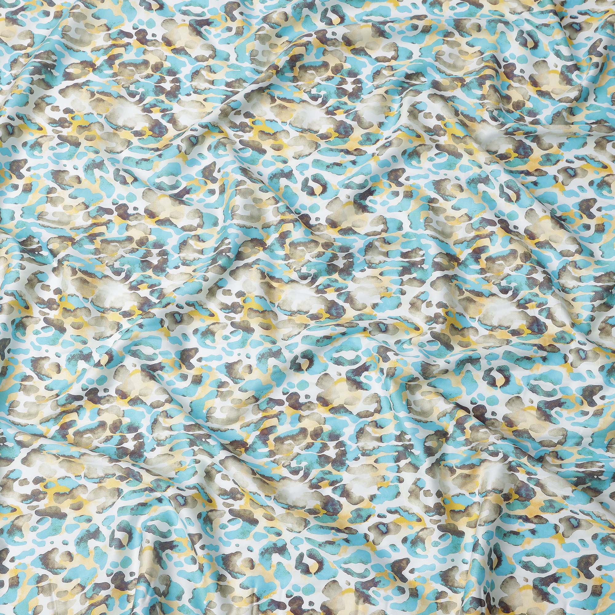 Premium Aqua Blue and Yellow Abstract Animal Print Pure Cotton Satin Fabric with smooth satin sheen