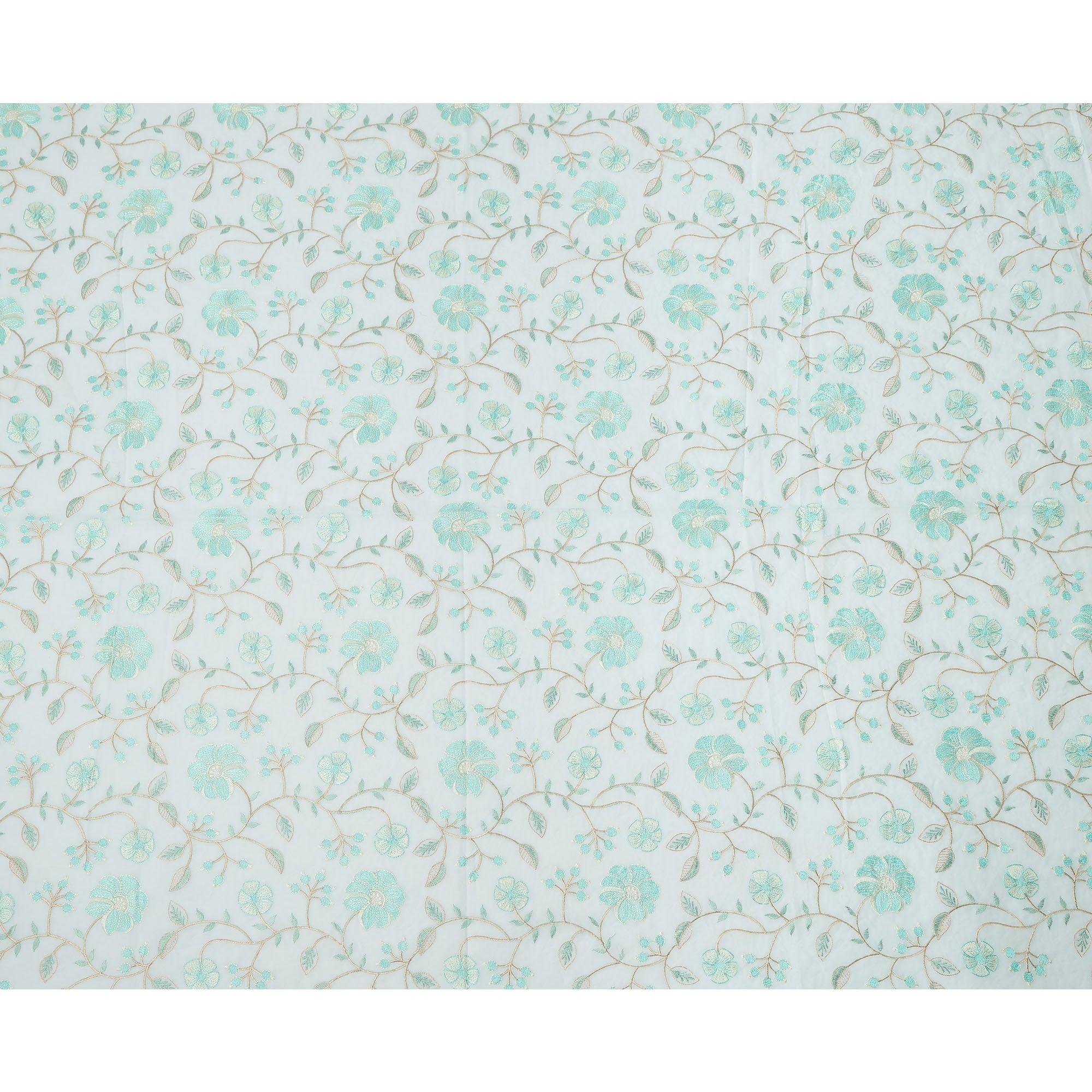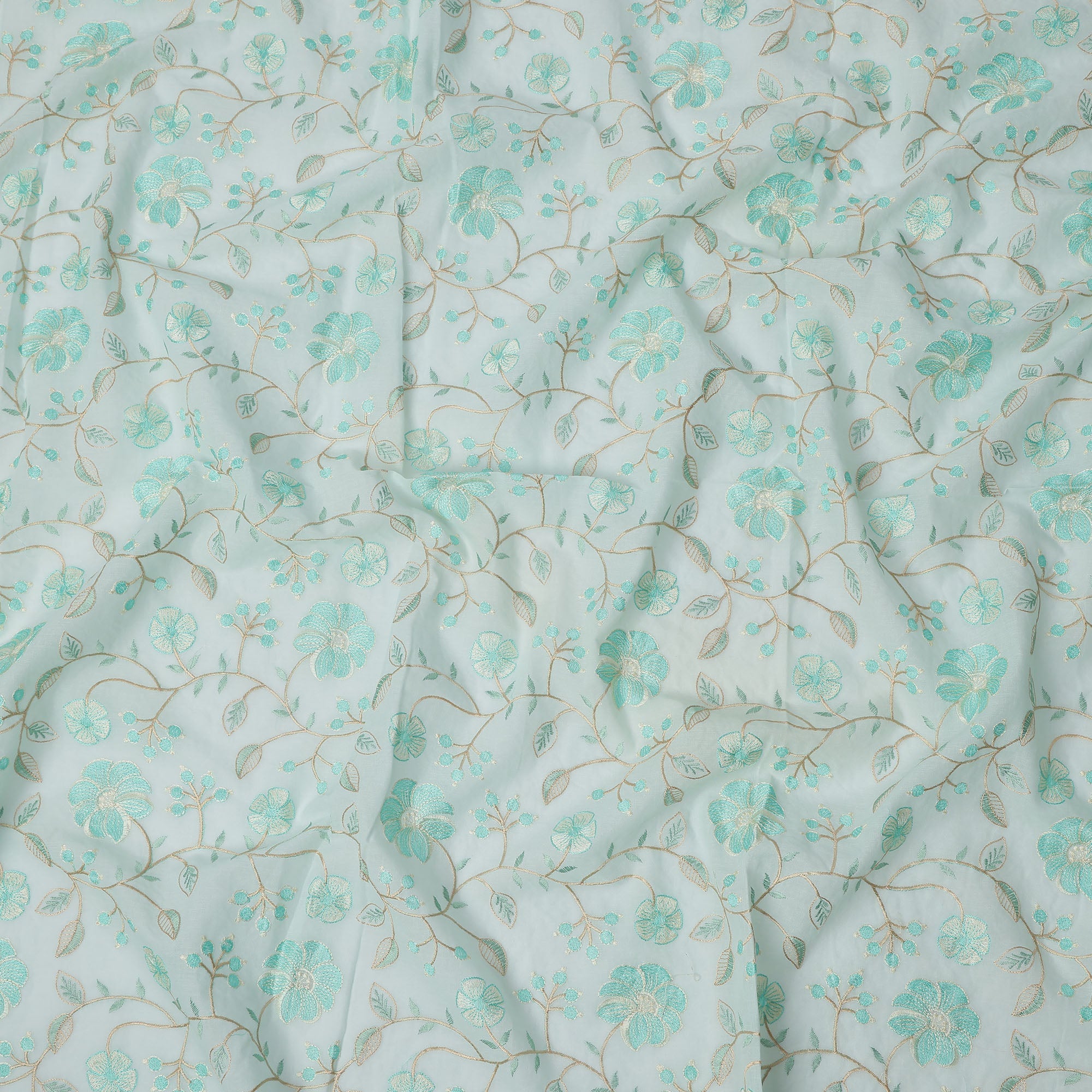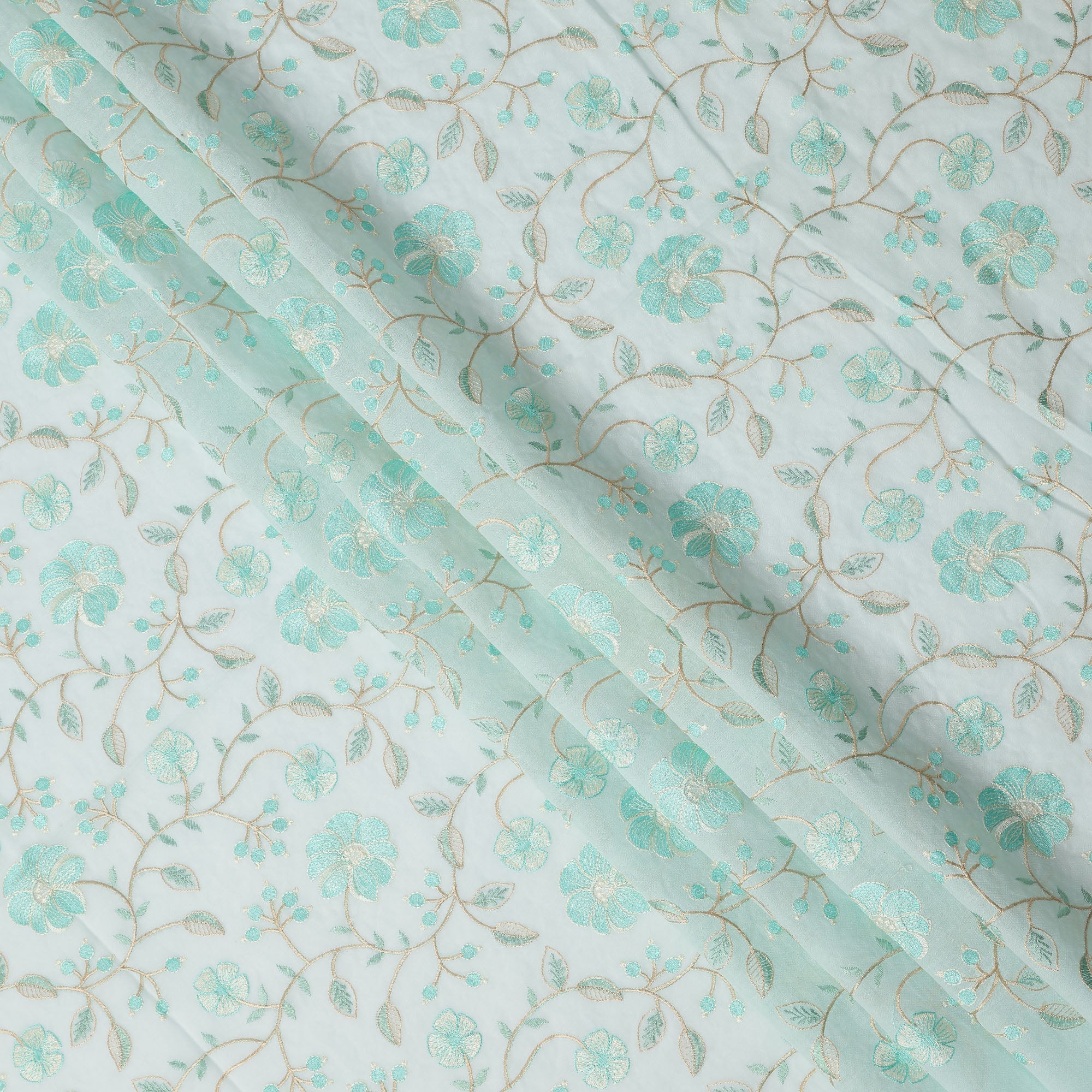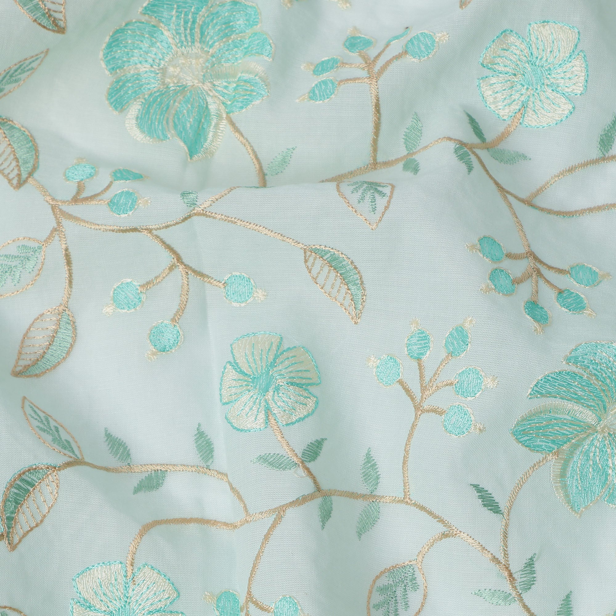 قماش فوال قطني مطرز بنقشة زهور باللون الأزرق المائي، عرض 110 سم، الهند - D25194