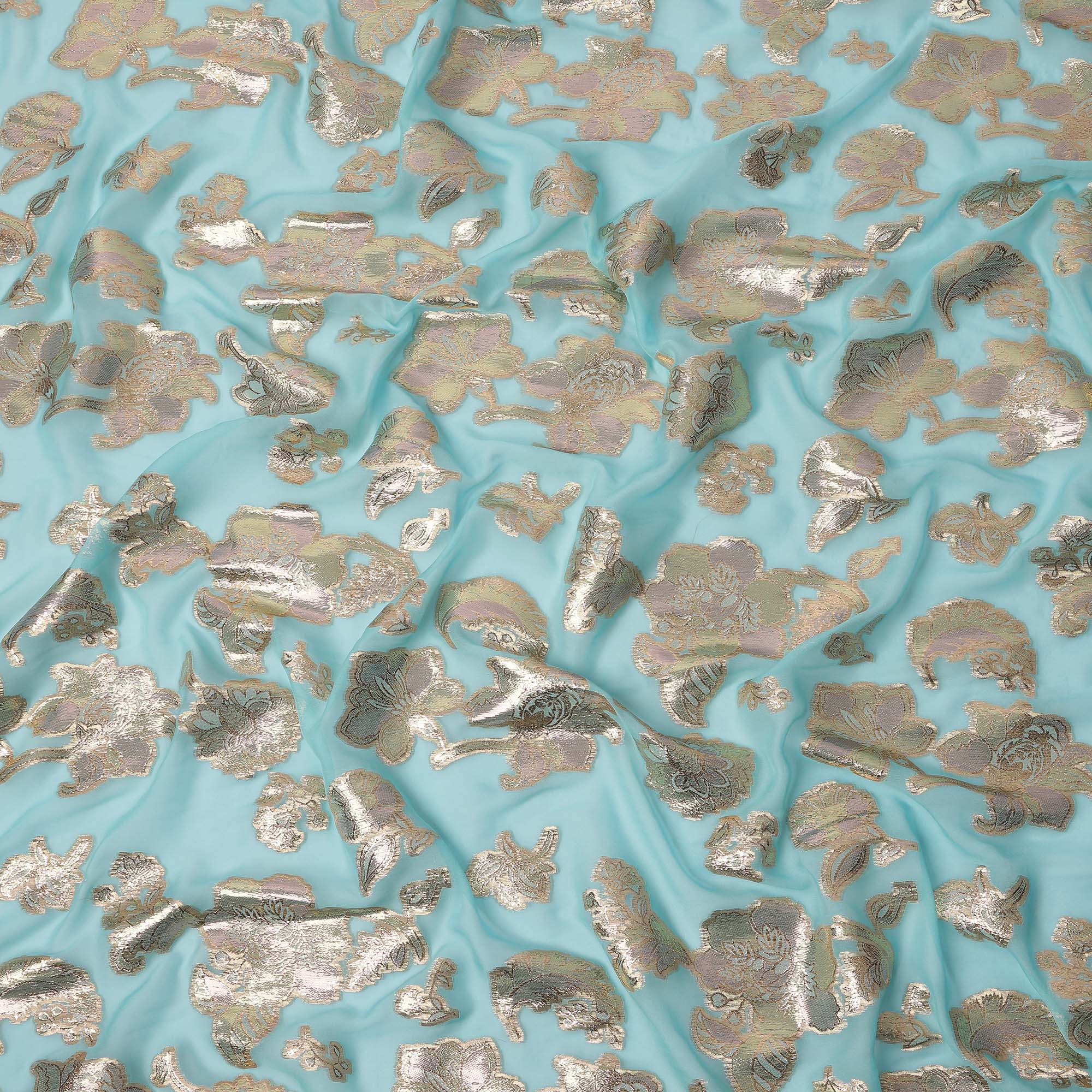 هذا القماش الحريري الشيفون الأزرق المائي، المزين بزخارف زهور لوريكس معدنية، خيارٌ رائعٌ لإبداعات أزياء فاخرة وأنيقة. قاعدة الشيفون الناعمة... اقرأ أكثر اقرأ أكثر
