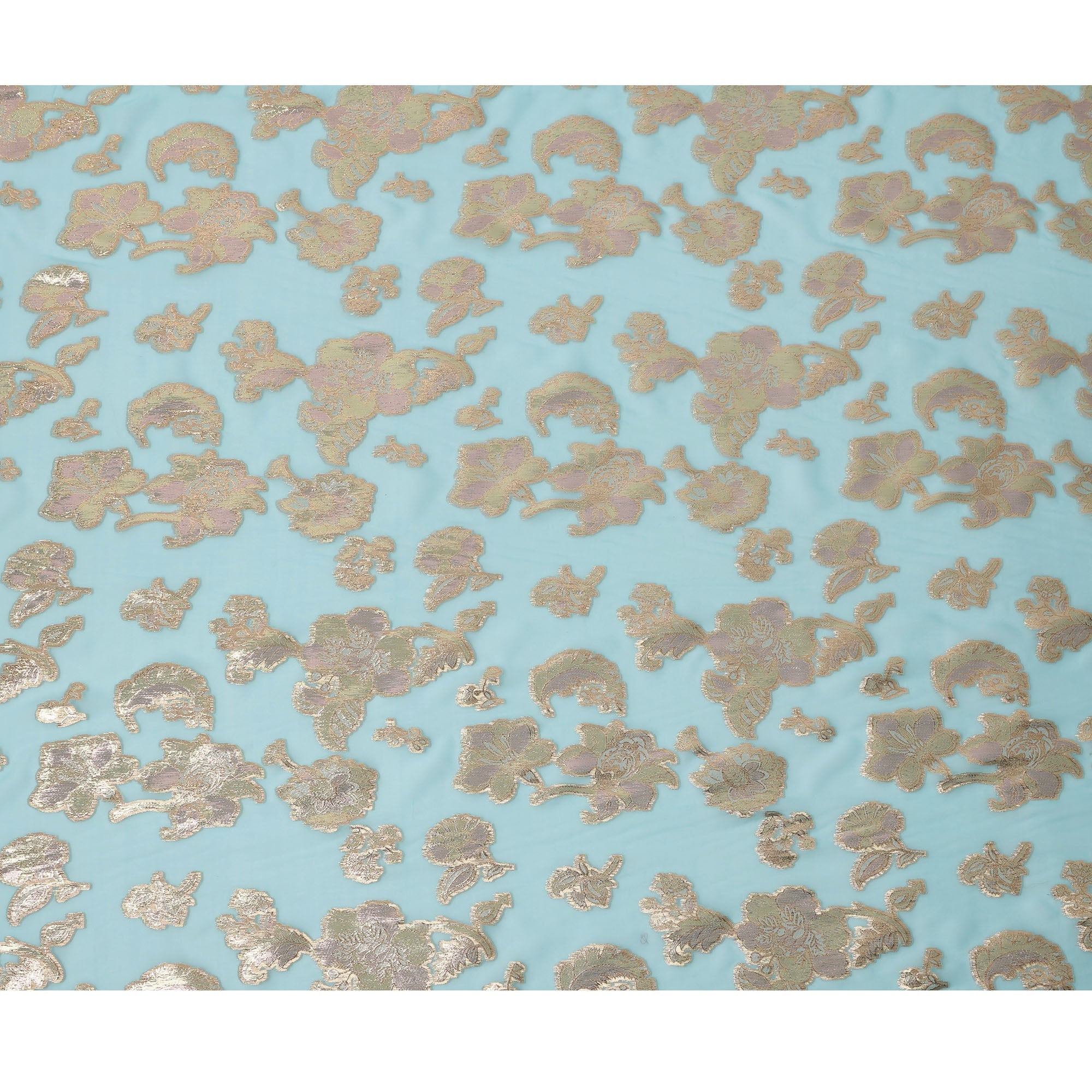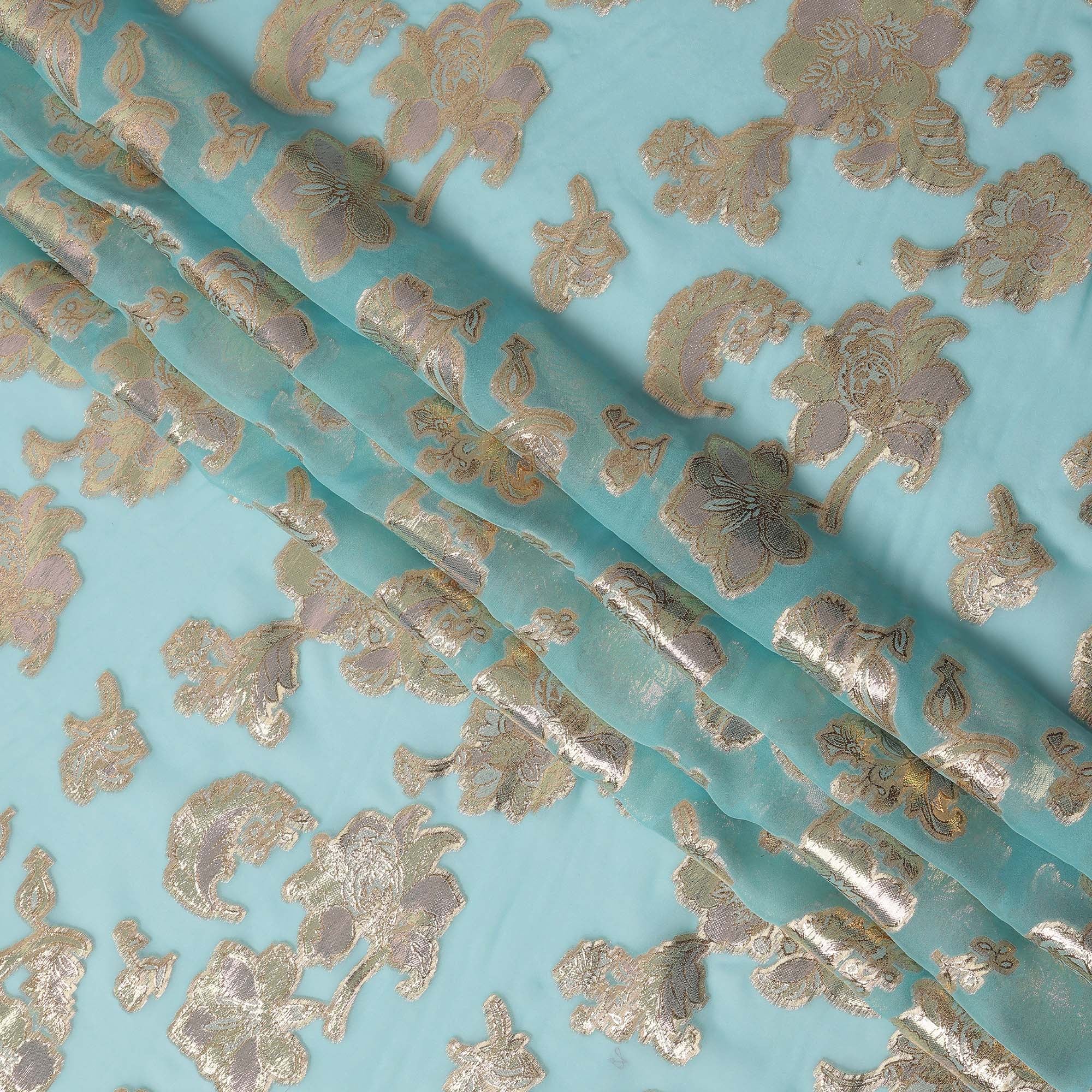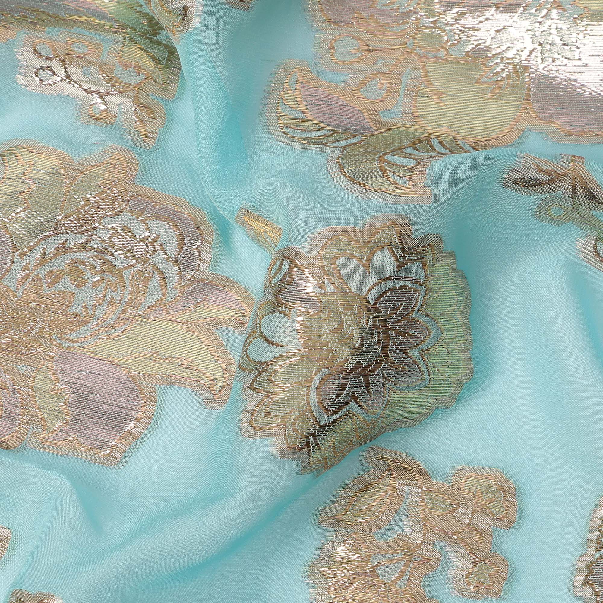 هذا القماش الحريري الشيفون الأزرق المائي، المزين بزخارف زهور لوريكس معدنية، خيارٌ رائعٌ لإبداعات أزياء فاخرة وأنيقة. قاعدة الشيفون الناعمة بلون أزرق مائي منعش تضفي عليه جاذبيةً حيويةً ورشيقة، بينما تُضفي لمسات الزهور المعدنية الذهبية ثراءً وسحرًا ولمسةً من التألق. بفضل خفة وزنه وجودته شبه الشفافة وانسيابيته، يُعد هذا القماش مثاليًا لتصميم الساري، والفساتين، والدوباتا، والهينغا، والطبقات، والمجموعات المصممة. صُنع في كوريا الجنوبية، ويعكس براعةً حرفيةً عالية، مما يجعله قطعةً أساسيةً في عالم الأزياء الراقية والمناسبات الاحتفالية.