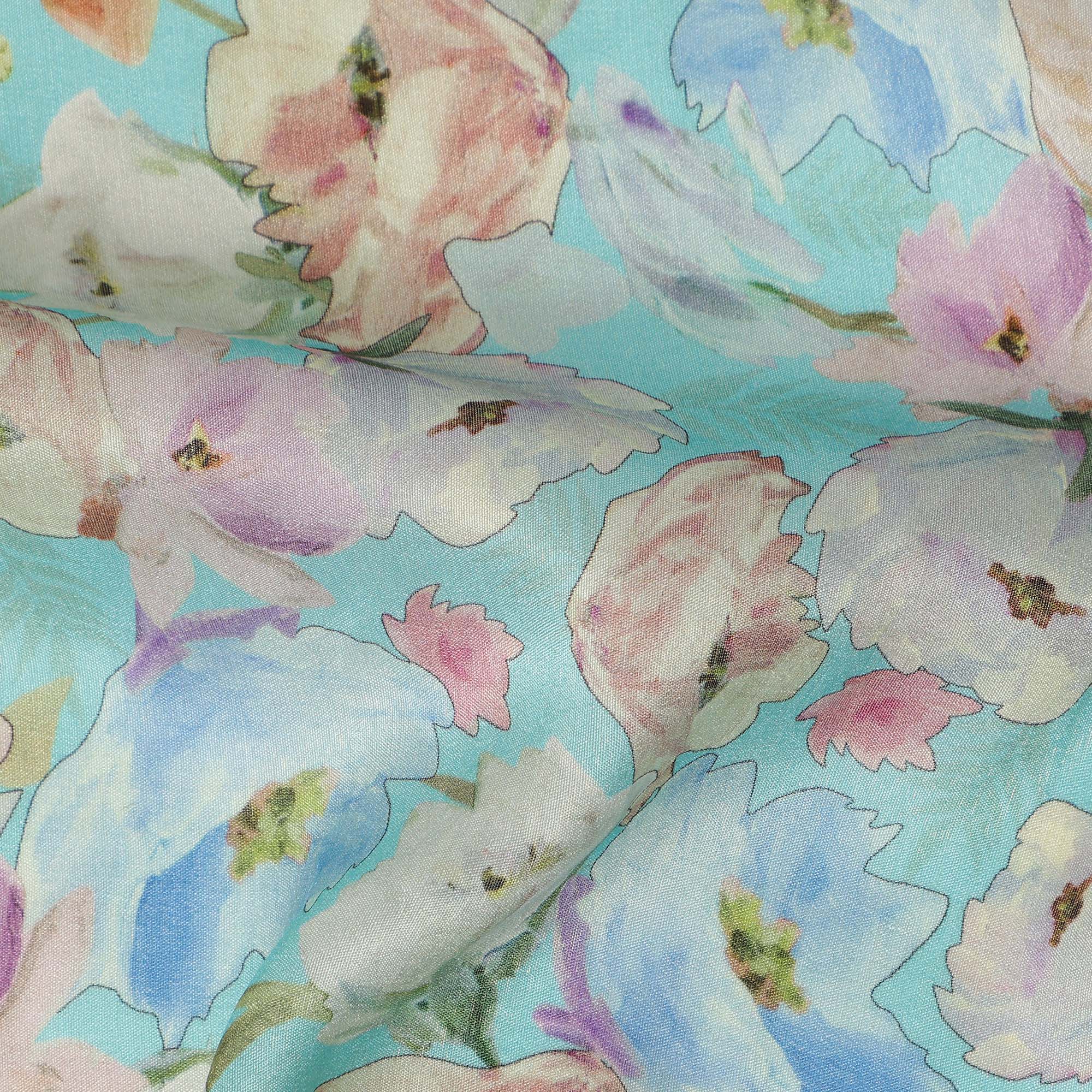 • أُوكَازيُون -20% Aqua Blue Floral Printed Viscose Modal Satin Fabric 110 Cms India Origin-D27567