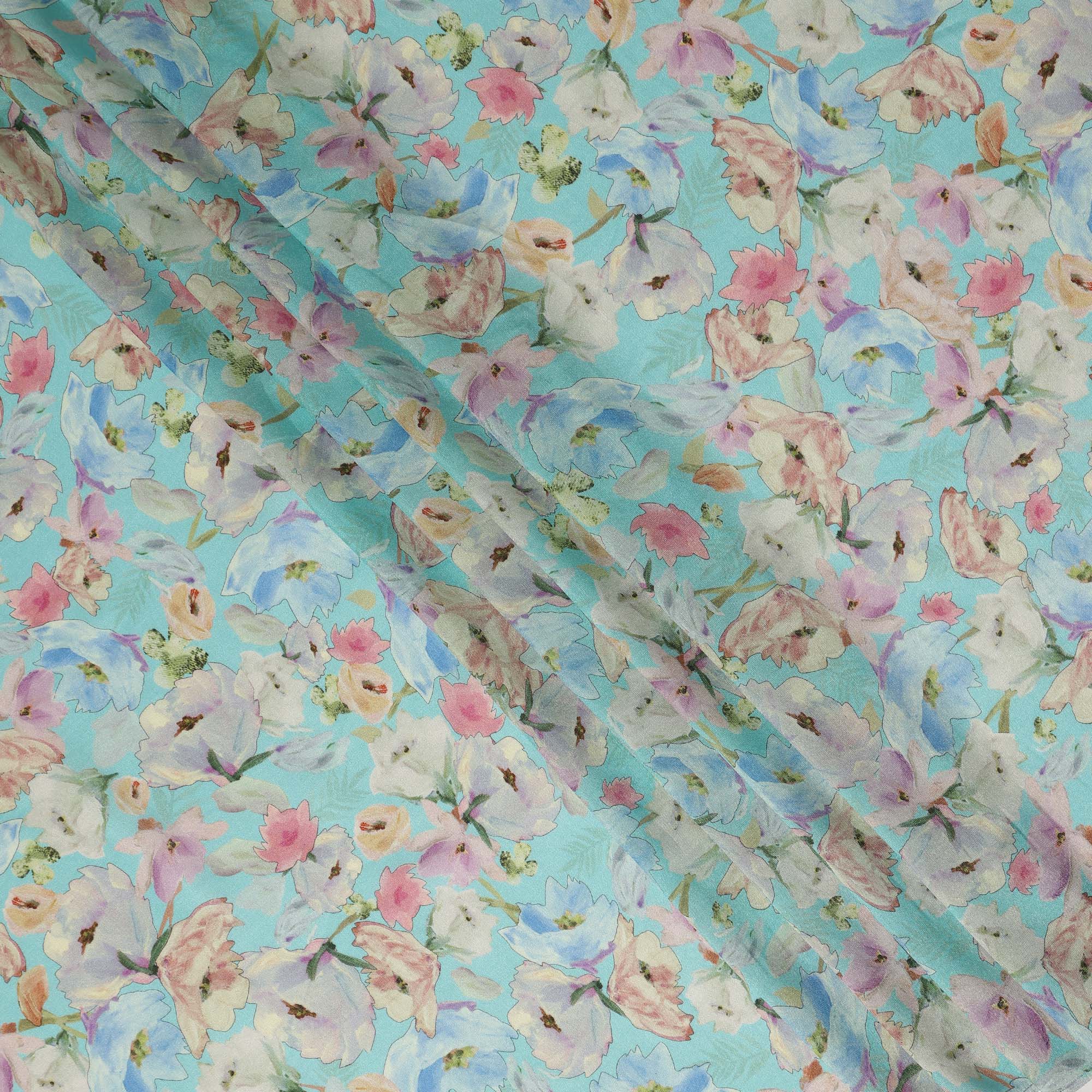 Aqua Blue Floral Printed Viscose Modal Satin Fabric 110 Cms India Origin-D27567