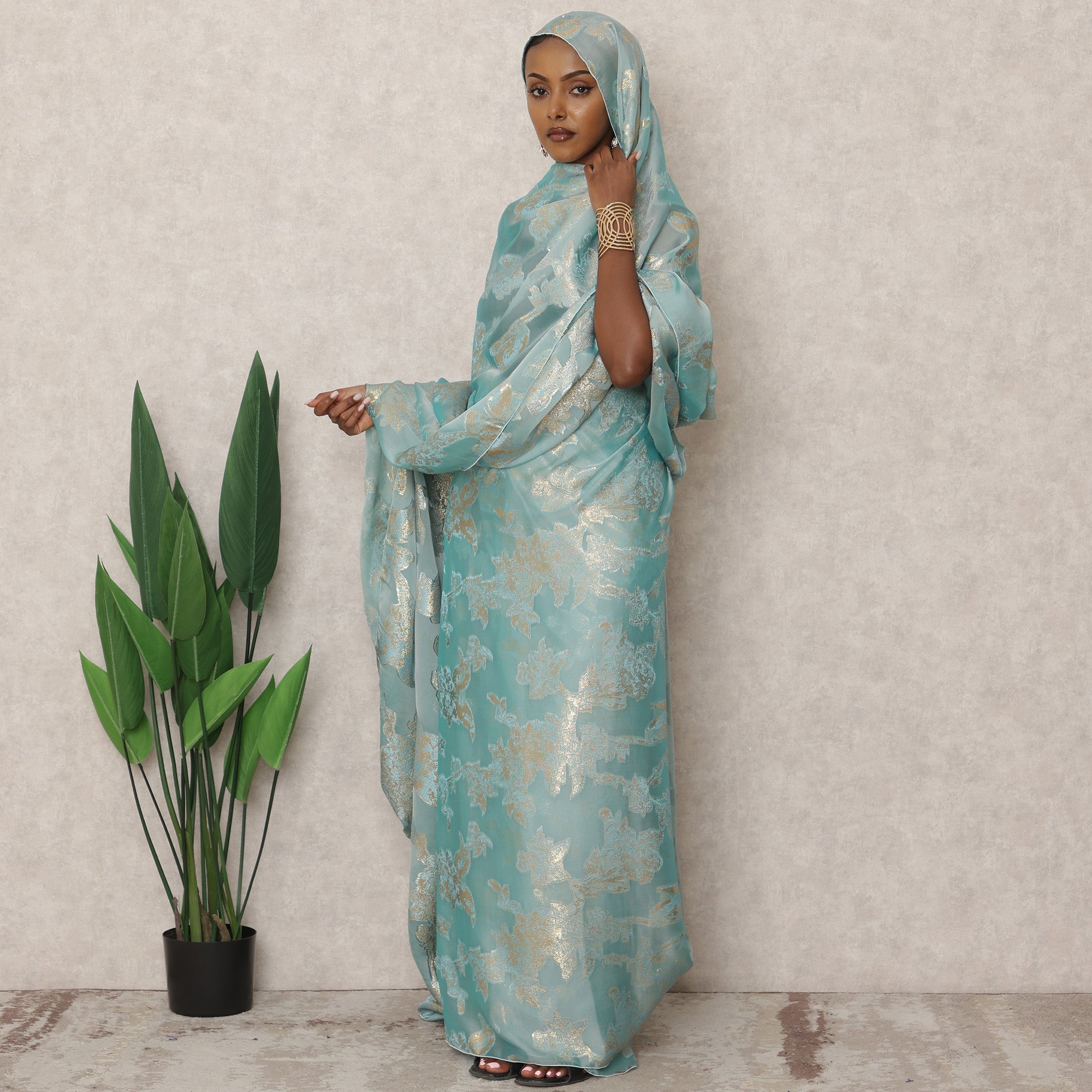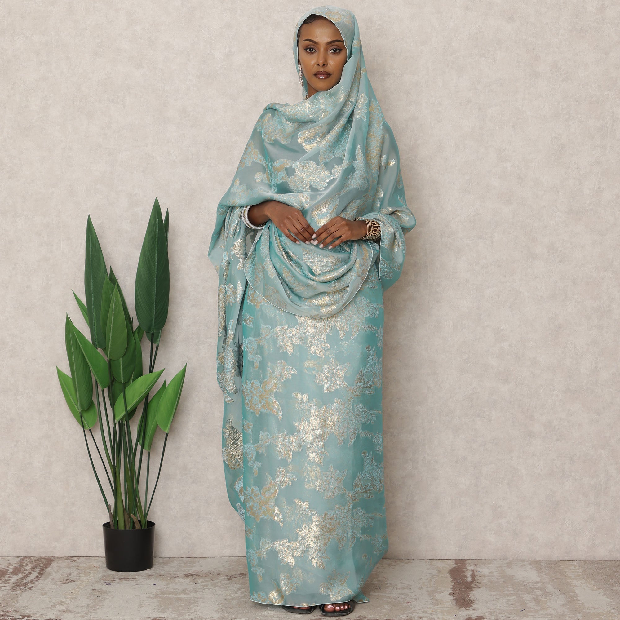 ارتقِ بمجموعة ملابسك التقليدية مع هذا الثوب السوداني الرائع باللون الأزرق المائي، المصنوع من قماش الشيفون الحريري الفرنسي الفاخر من فرانساوي، والمزين بزخارف لوركس معدنية لامعة. نسيجه الخفيف والشفاف يضفي عليه انسيابية أنيقة، بينما تُضفي نقوش الأزهار الذهبية المعقدة لمسةً آسرة من الضوء مع كل حركة. صُممت هذه القطعة، التي يبلغ طولها 4.5 أمتار، للأناقة والراحة، وتوفر تغطية واسعة بعرض 110 سم، مما يجعلها مثالية للفعاليات الثقافية والتجمعات الاحتفالية والأمسيات الرسمية. حرفيتها الراقية وأصلها الفرنسي يجعلانها طقمًا مميزًا لمن يُقدّرون الفخامة الكلاسيكية مع لمسة عصرية راقية. تسوق عبر الإنترنت اليوم لتجربة فخامة أزياء التراث بمفهومها الجديد.