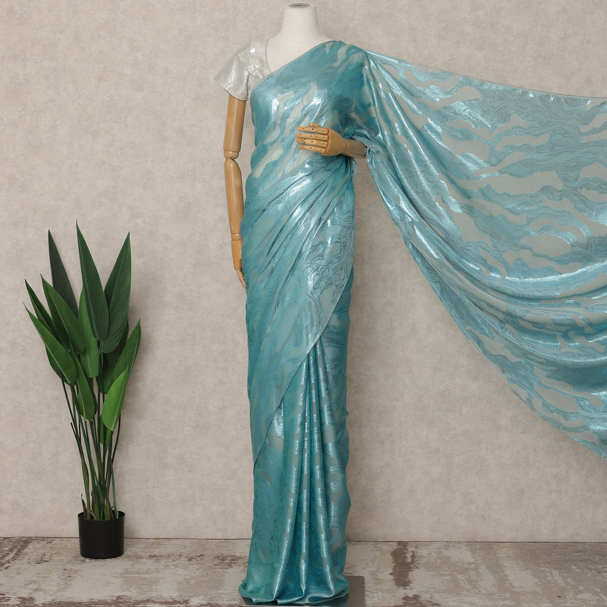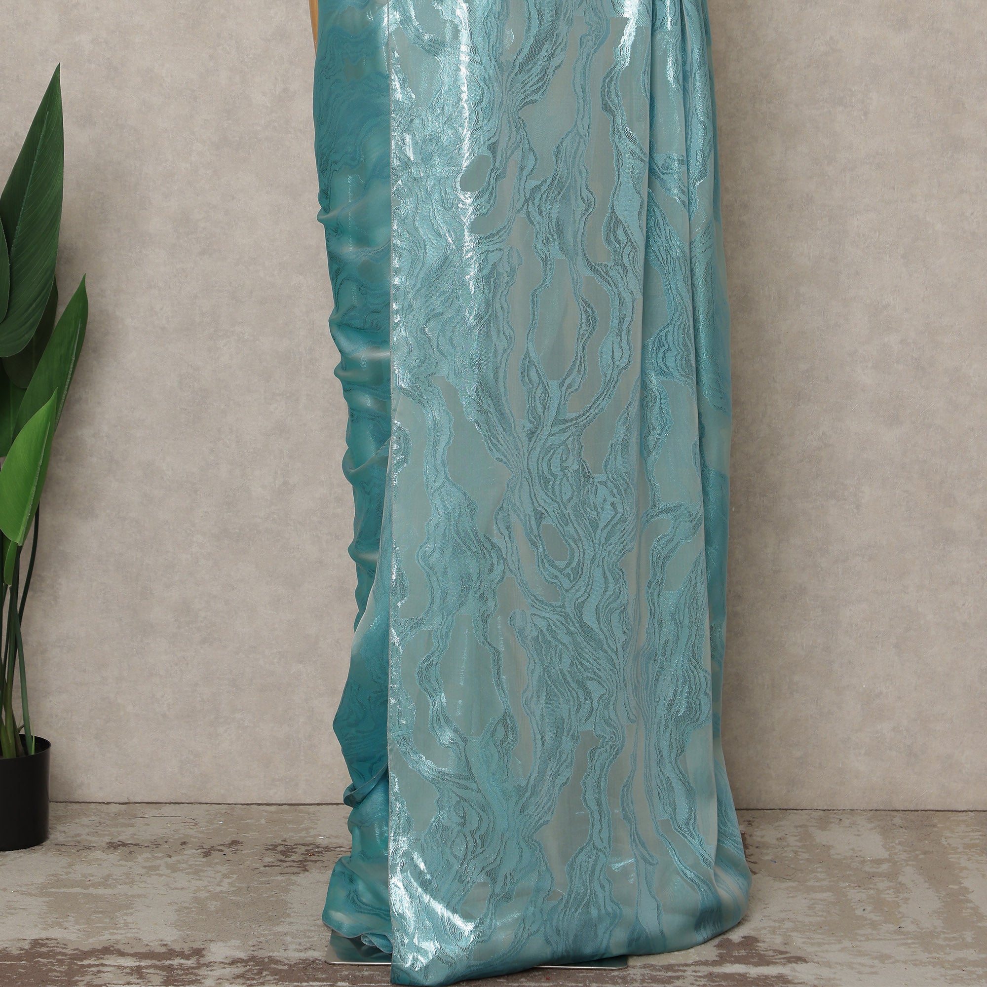 This premium French silk chiffon saree in a refreshing aqua blue shade is designed for women who appreciate contemporary elegance with a luxurious touch. Crafted from fine-quality chiffon sourced from France, the fabric is lightweight, airy, and fluid, offering a smooth, graceful drape that enhances comfort and movement. The metallic abstract woven pattern adds a subtle shimmer and modern appeal, making this saree perfect for weddings, festive occasions, evening gatherings, and elegant celebrations. With an approximate length of 5.5 meters and a generous width of 110 cms, it allows effortless pleating and versatile draping styles suited to different body types. Its breathable texture ensures all-day ease while maintaining a polished and sophisticated look. Blouse piece is not included, allowing you to style it with a blouse of your choice.