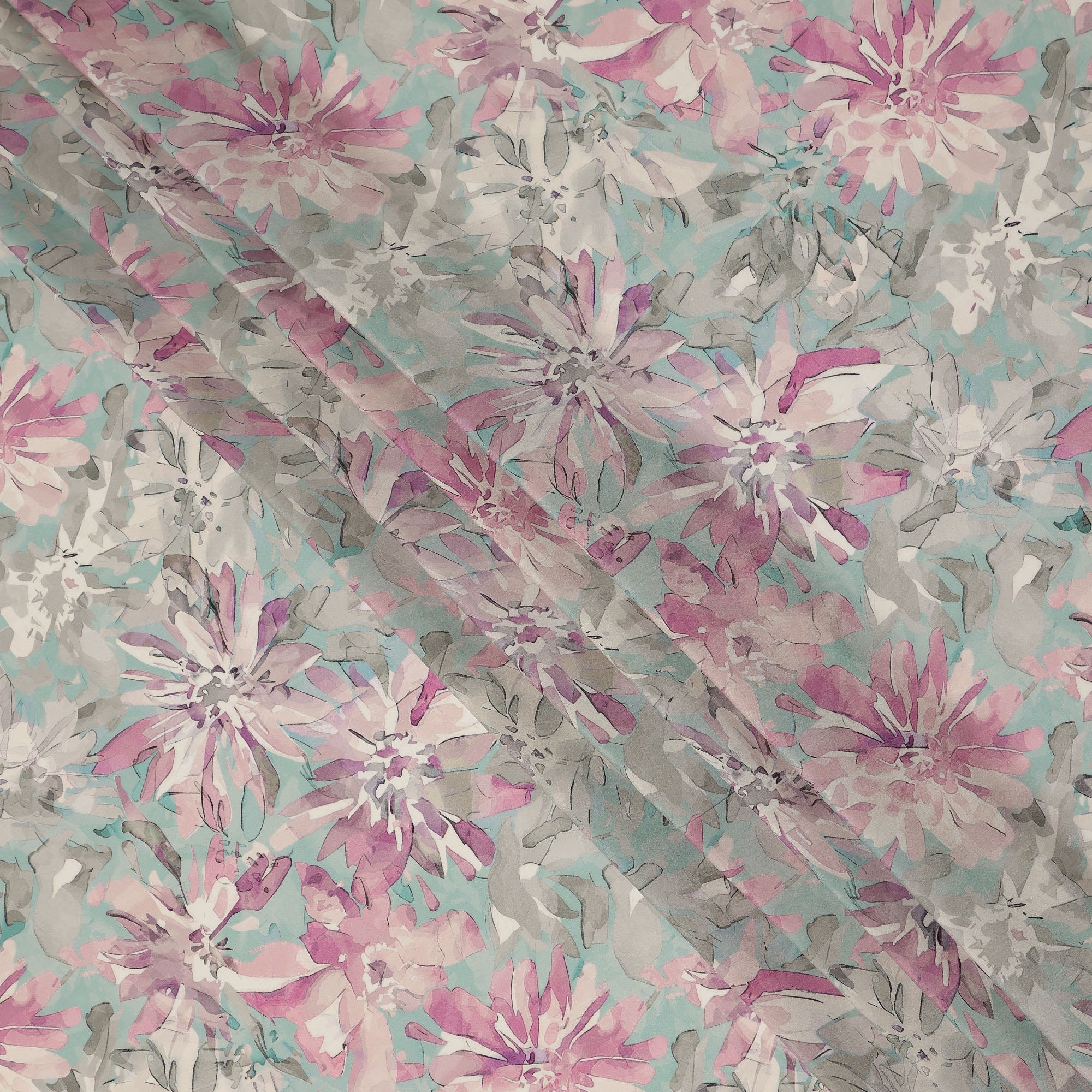 This aqua pink viscose crepe fabric features a soft abstract floral print blending refreshing aqua blue with delicate pink and subtle grey tones for a light and elegant appeal. The pastel aqua base enhances the layered floral design, creating a soothing yet stylish color combination that feels fresh and contemporary. Crafted in India, the fabric offers a smooth crepe texture with a matte finish that provides excellent drape and fluid movement. Its breathable viscose composition ensures comfort against the skin, making it suitable for all day wear in warm or mild climates. With a width of 110 cms, this fabric is ideal for dresses, kurtis, tops, tunics, and flowy skirts that require a lightweight structure with graceful fall and refined everyday elegance.