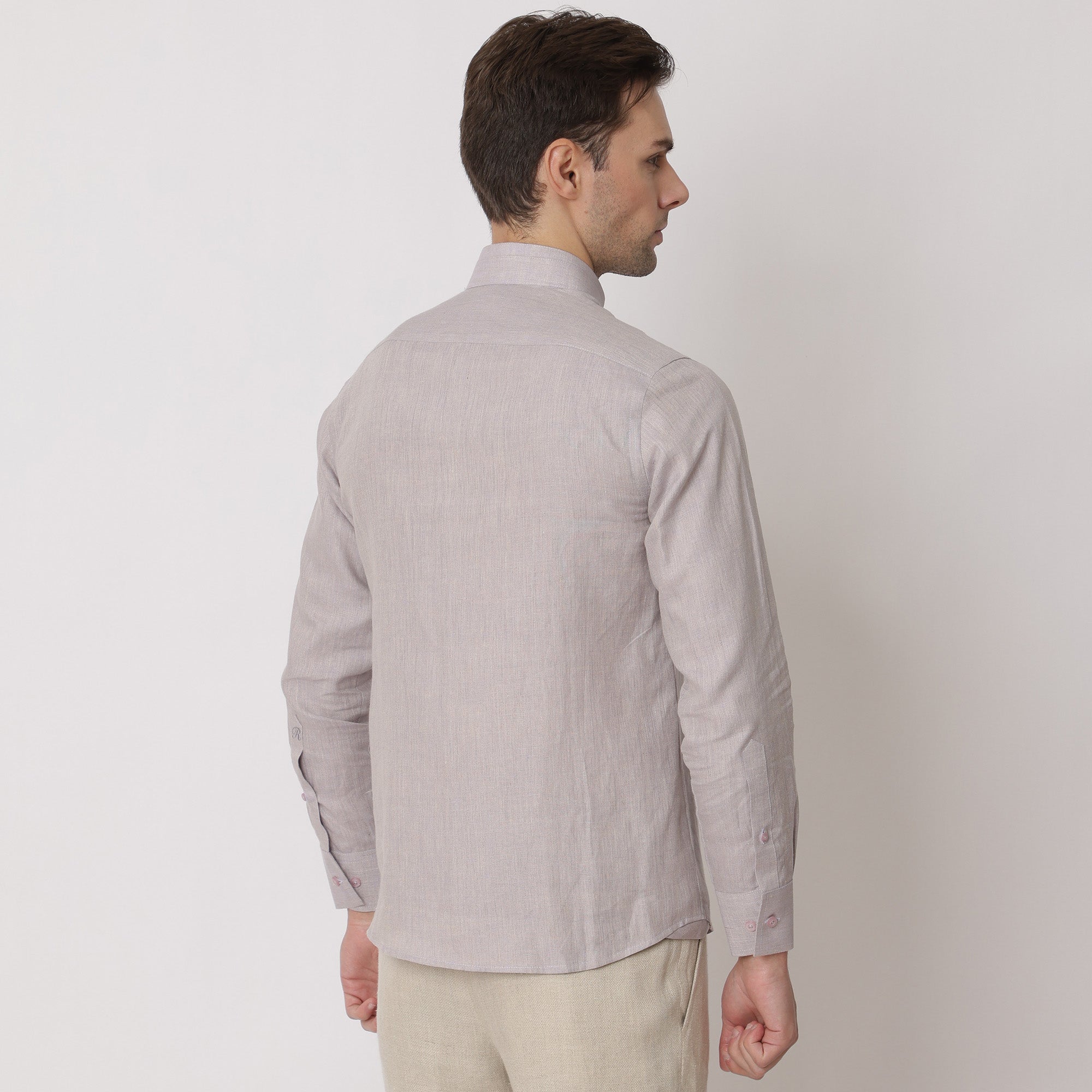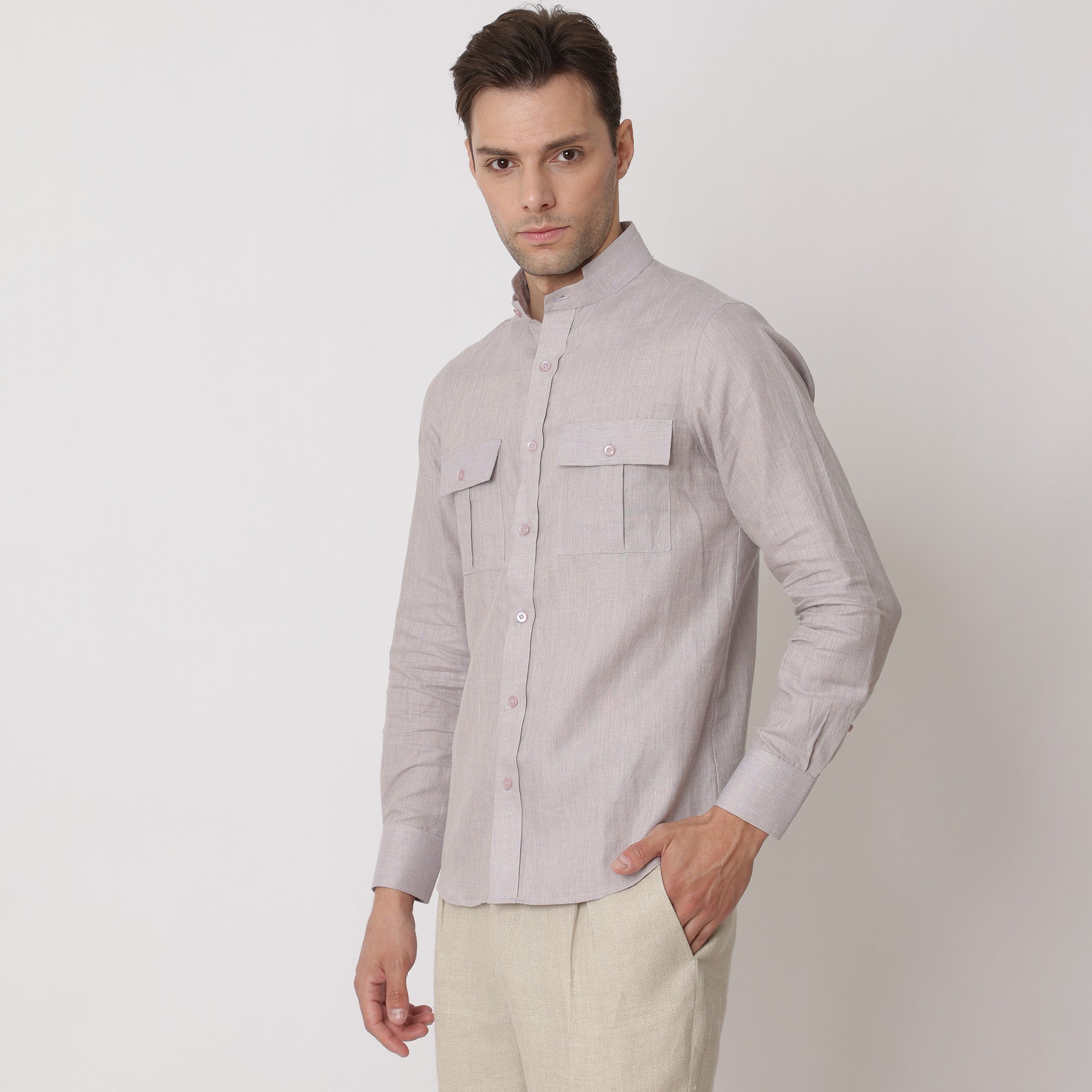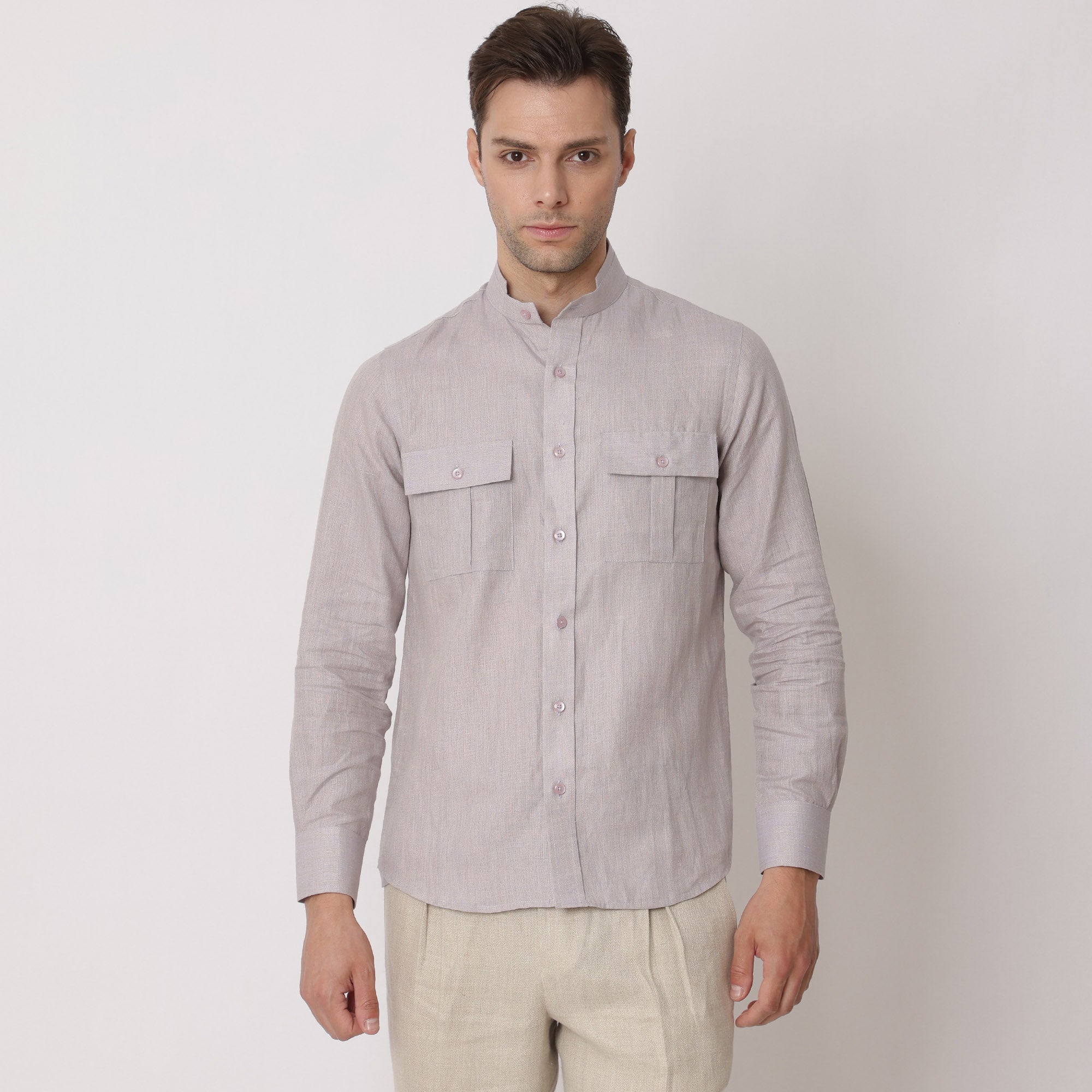• قميص من الكتان النقي الفاخر بلون أرجواني فاتح، بياقة صينية، صنع في الإمارات العربية المتحدة - D22009