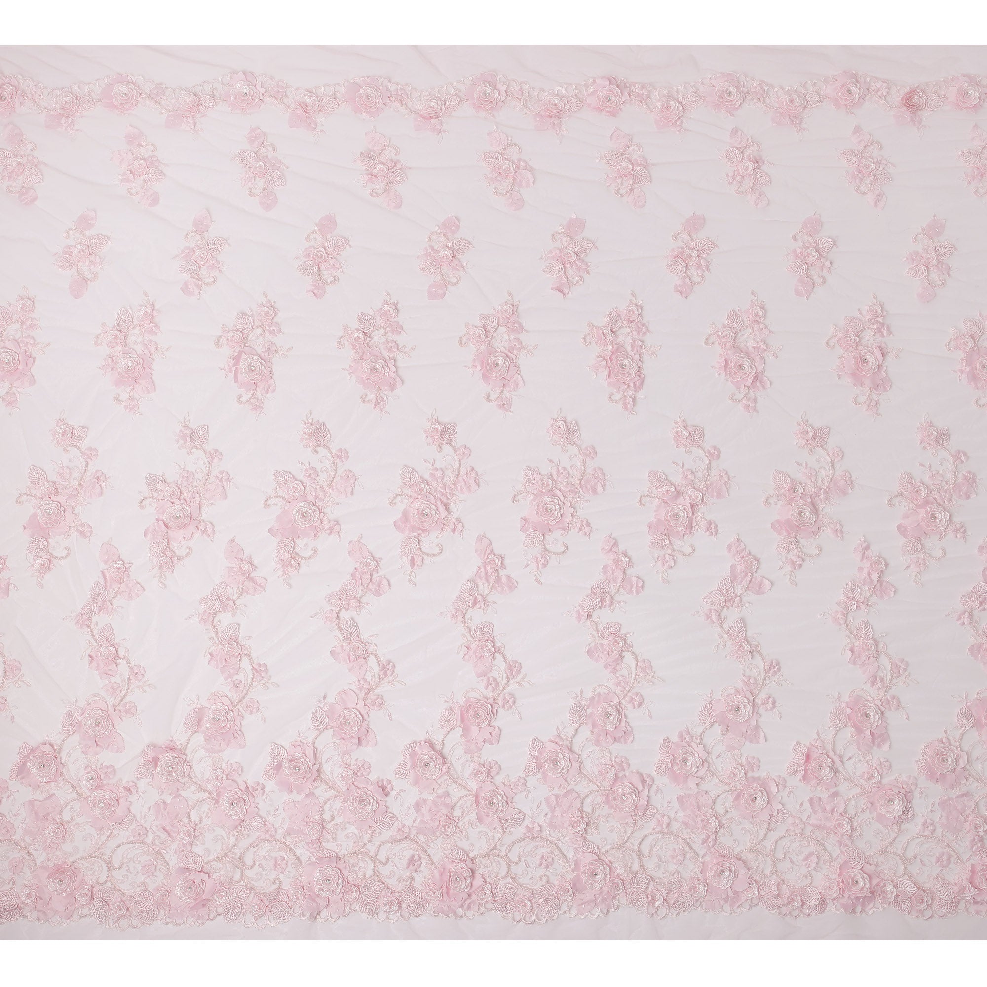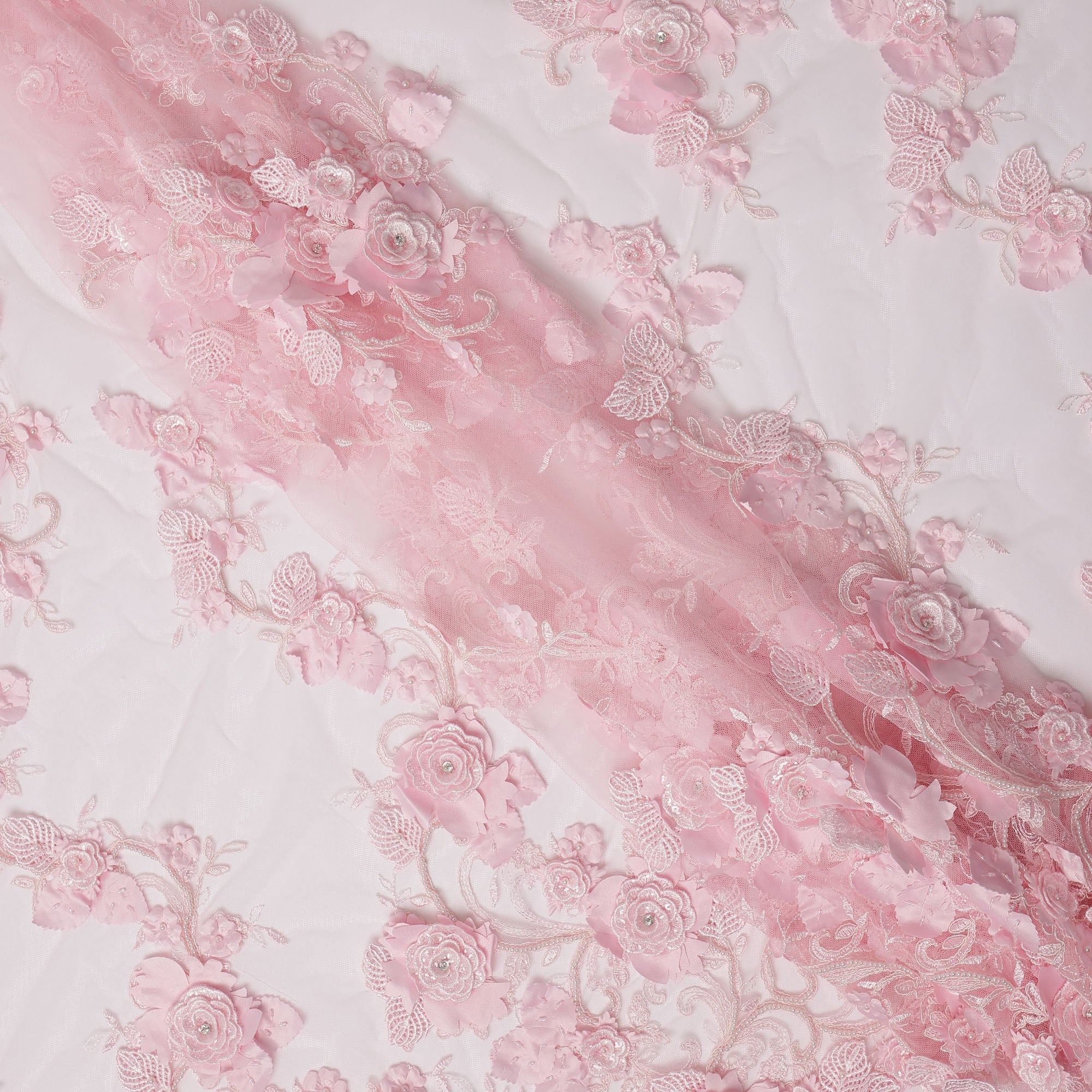 Baby pink nylon tulle with 3D floral appliqué and fine embroidery