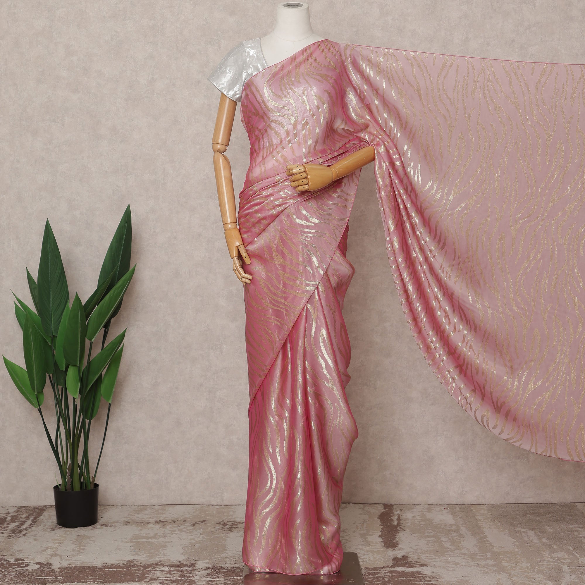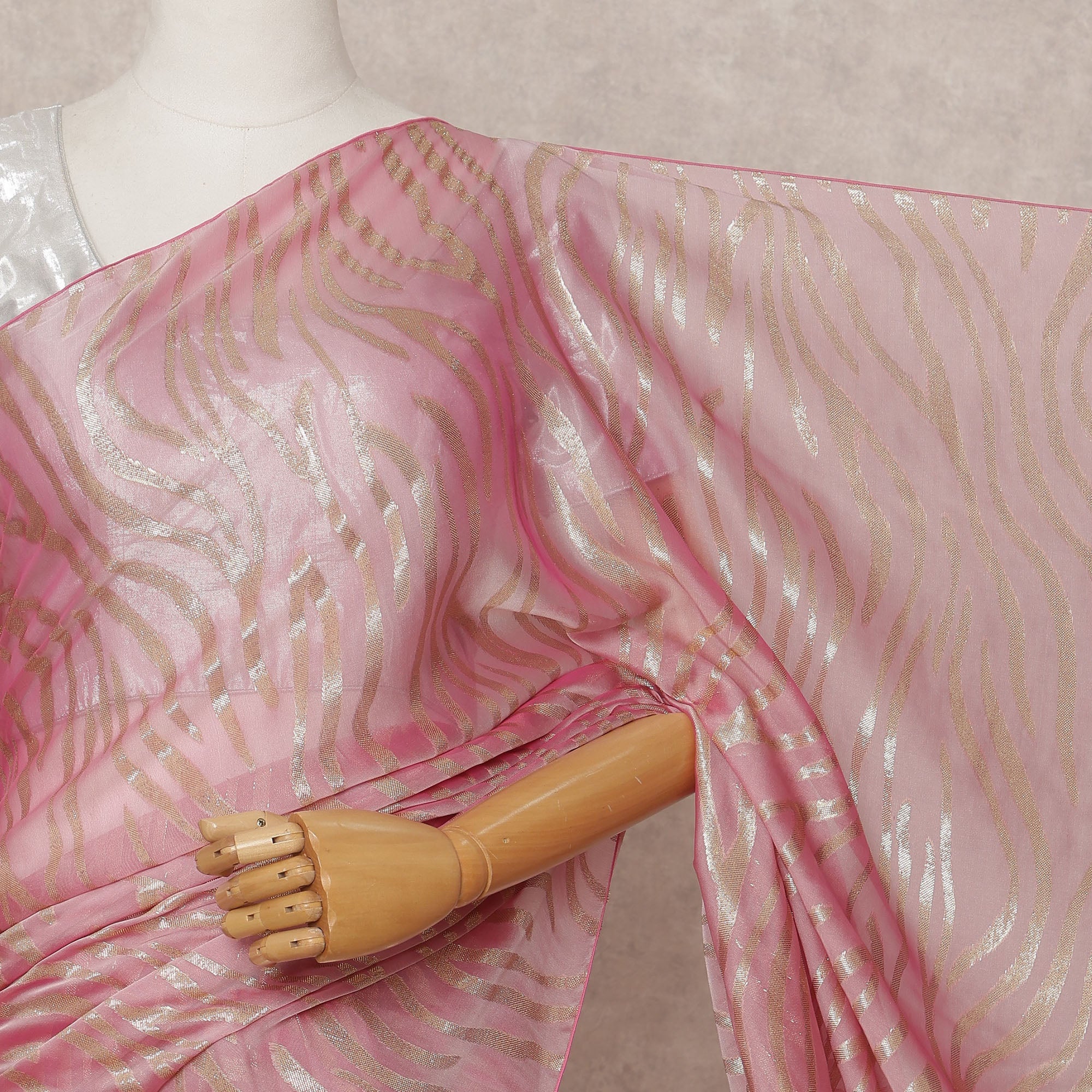 ساري شيفون فرنسي فاخر من الحرير الخالص باللون الوردي الفاتح بتصميم مموج معدني - طول 5.5 متر، عرض 110 سم، صنع في فرنسا - D25625