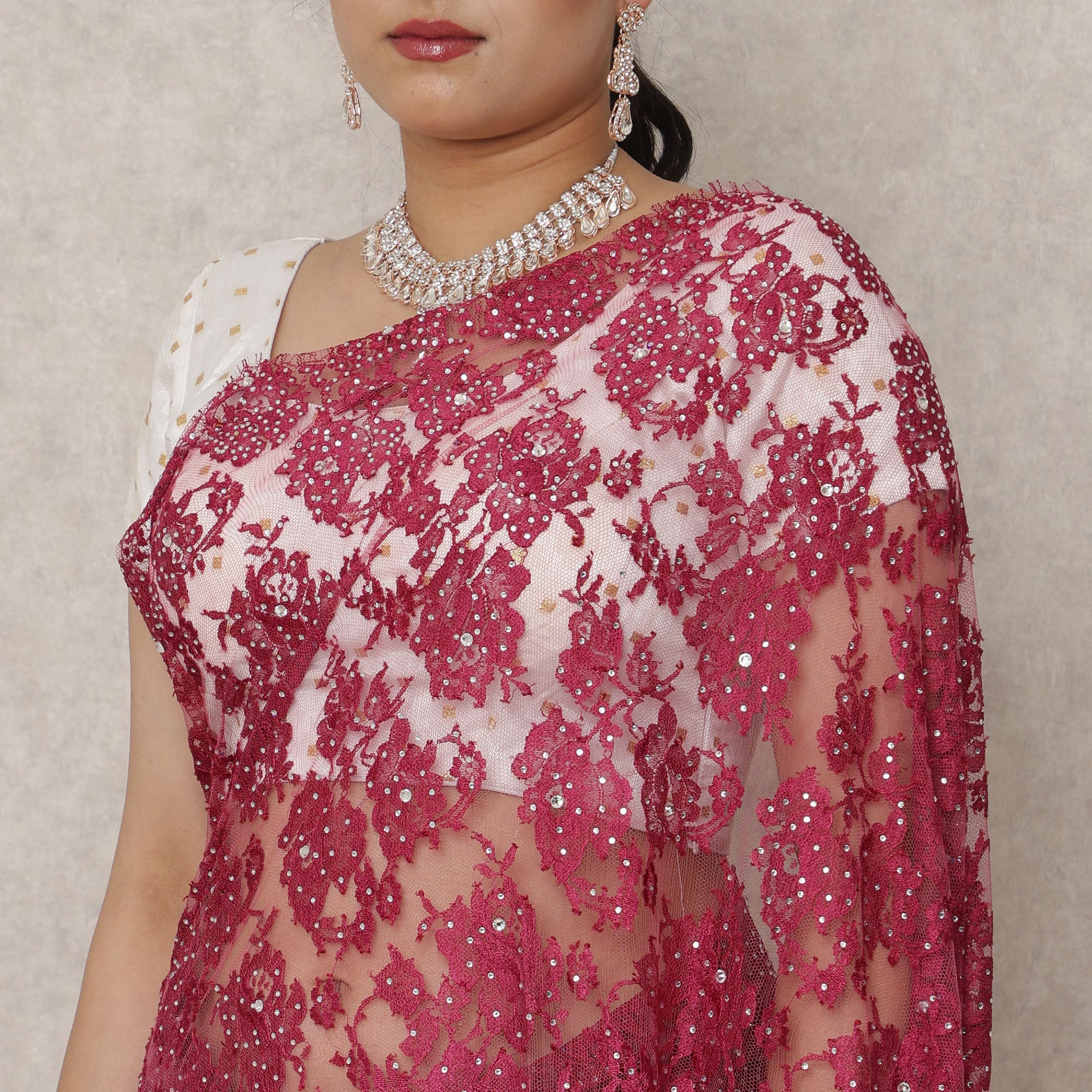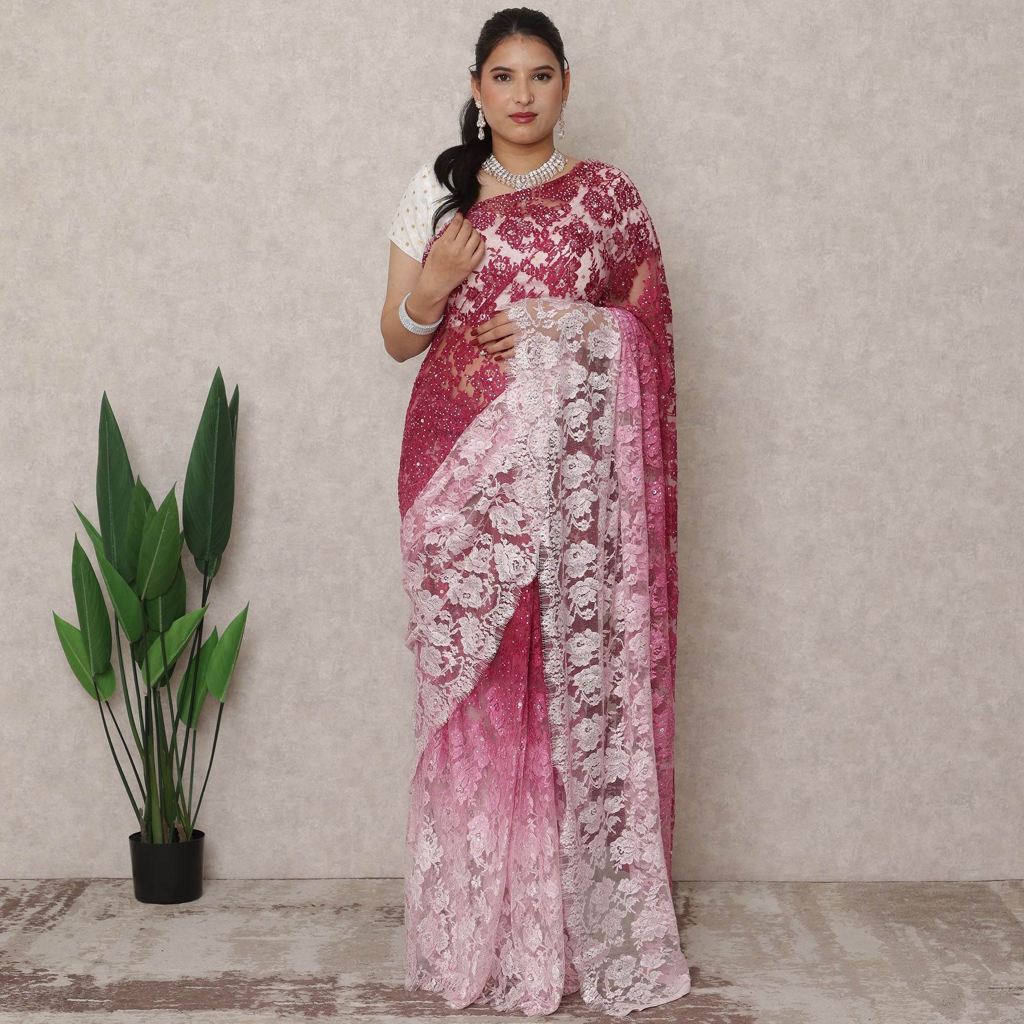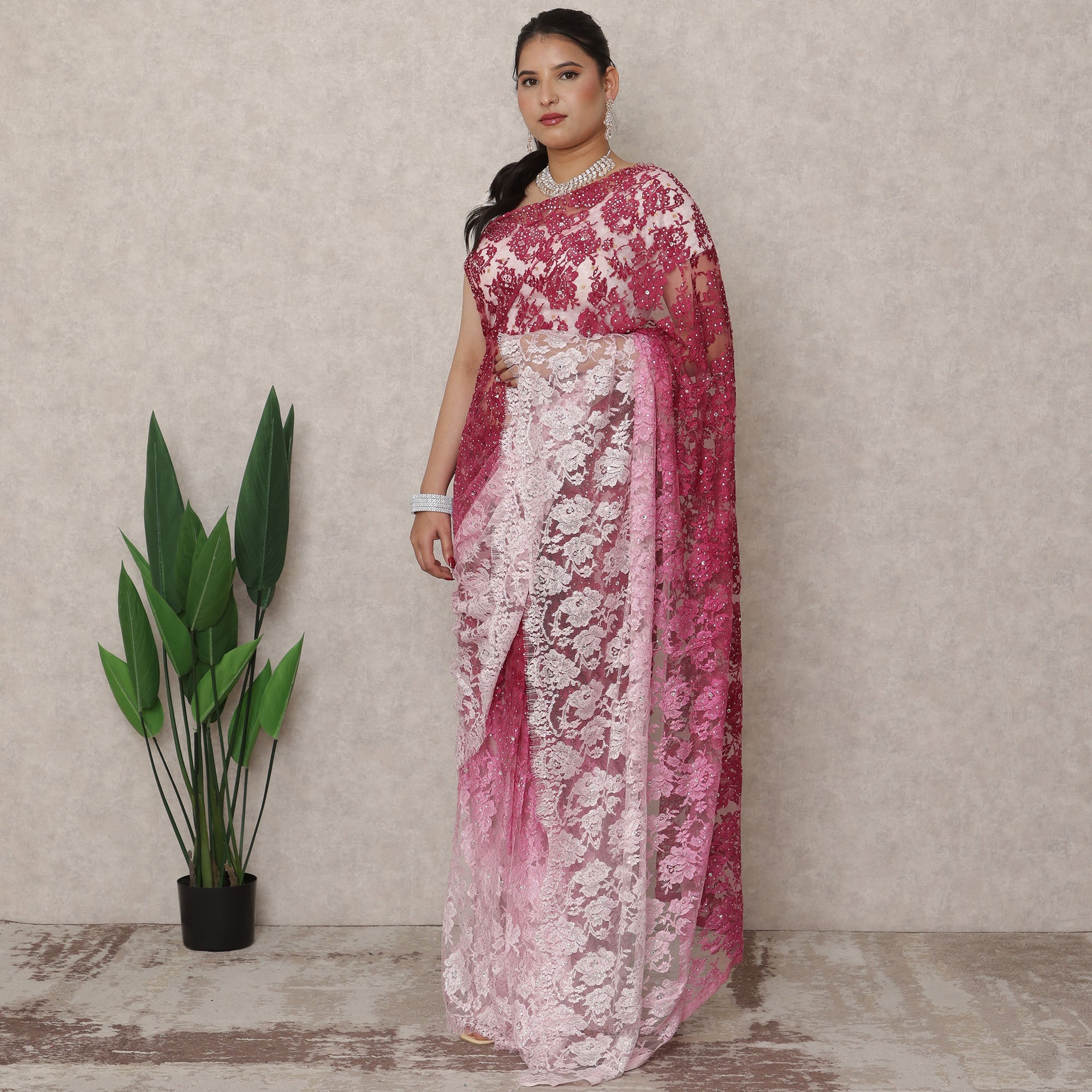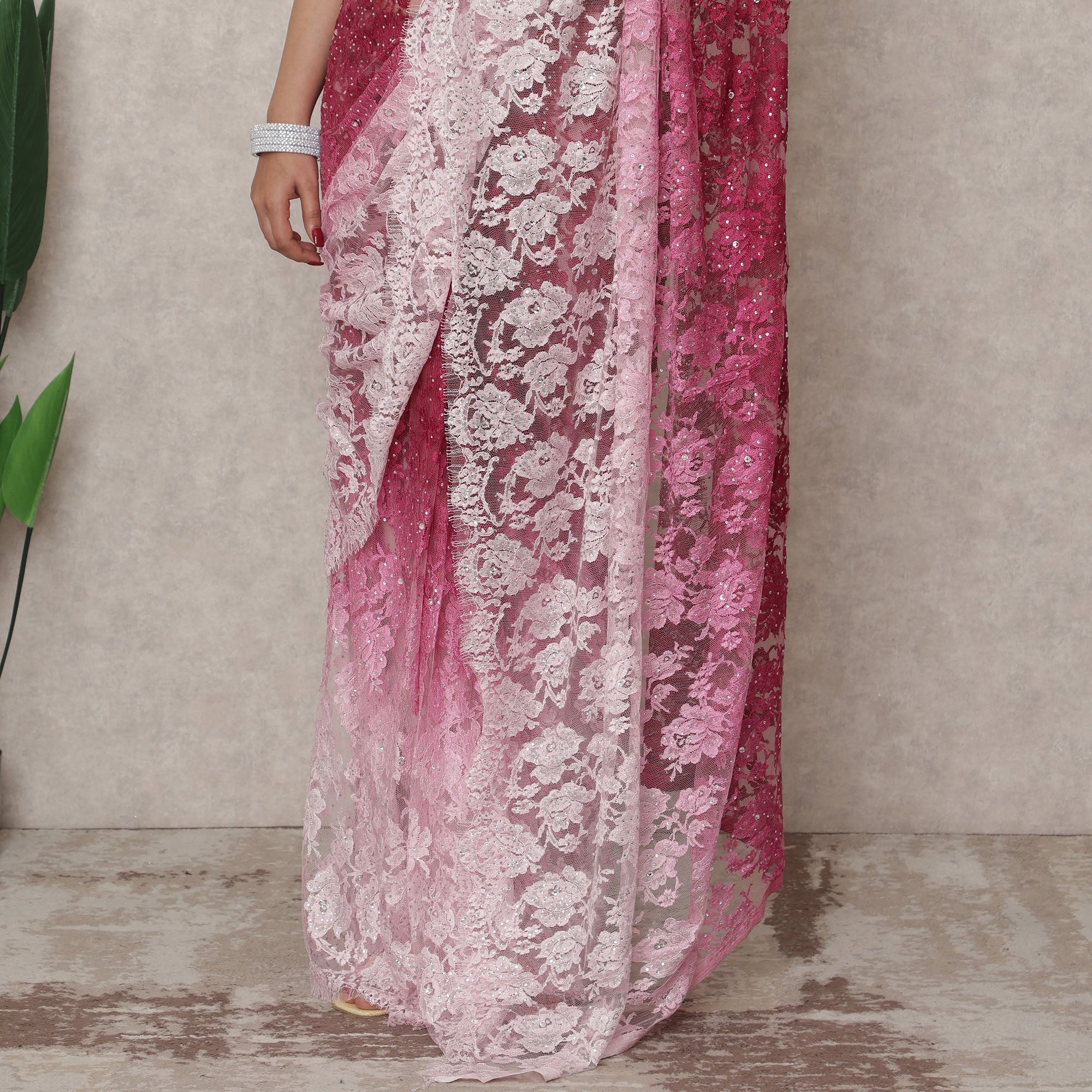 ساري فرنسي فاخر من الدانتيل الشانتيلي، من اللون الوردي الفاتح إلى النبيذي الداكن، مع تطريز حجري، بطول 5.5 متر، وعرض 110 سم، صنع في فرنسا - D24420