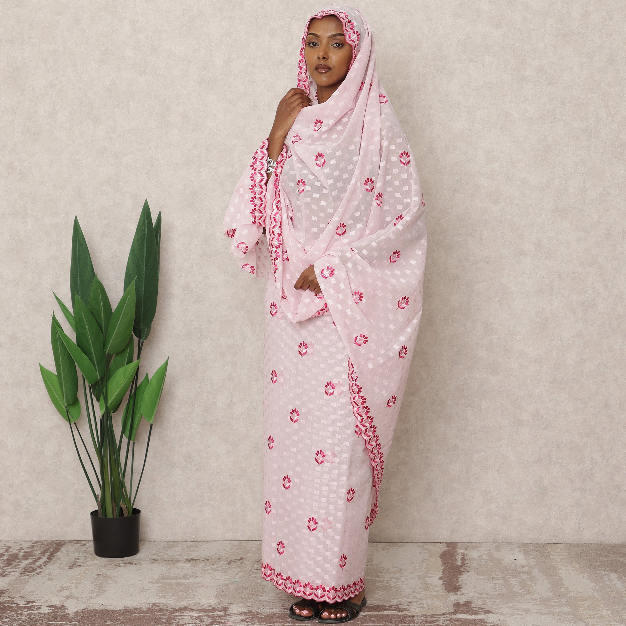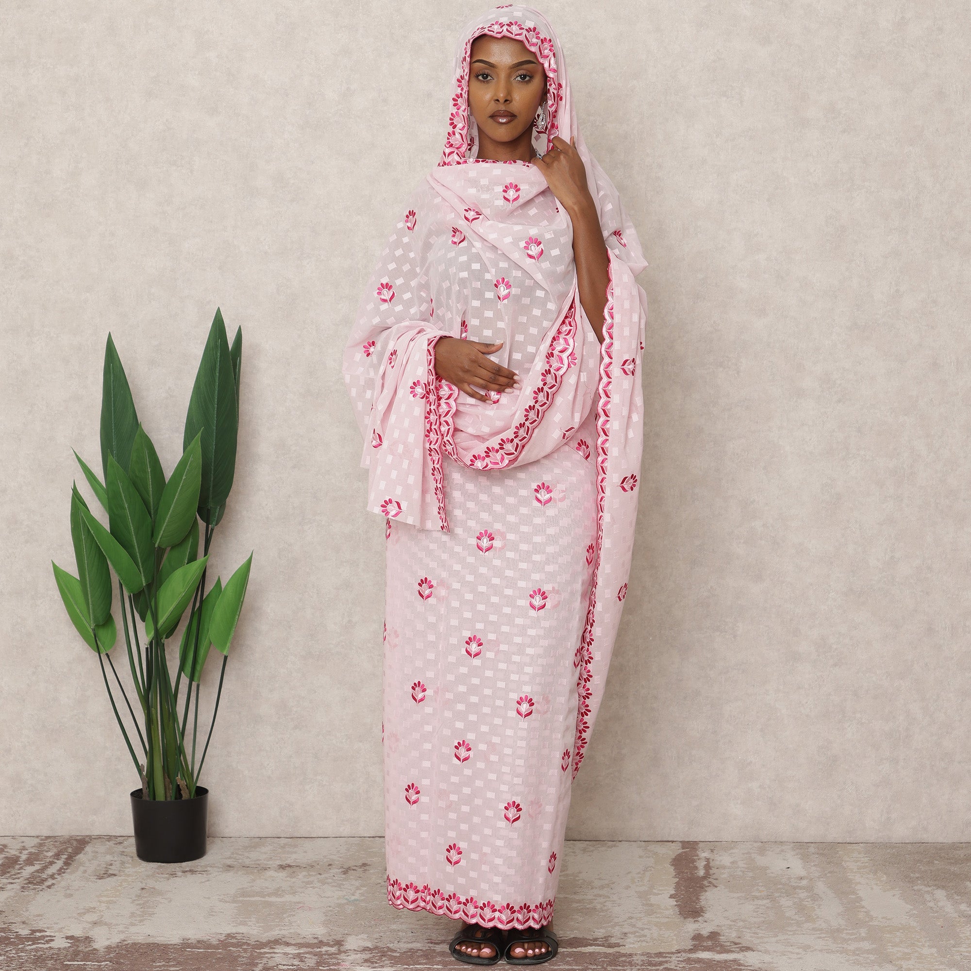 ثوب سوداني تقليدي وردي فاتح مع تطريز زهور الفوال الأرجوانية، قطعة بطول 4.5 متر، مصنوع من قماش قطني خالص، عرض 140 سم، صنع في الهند - D24469