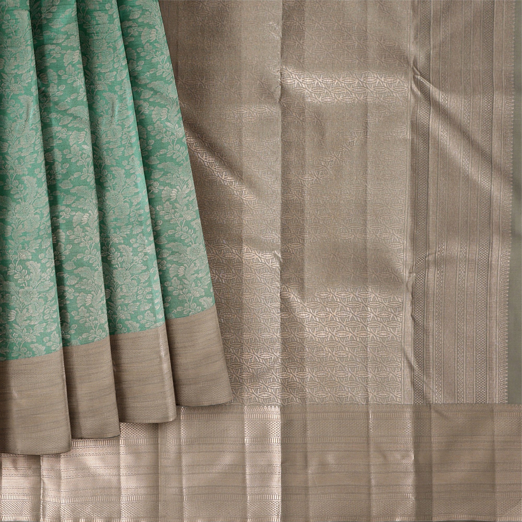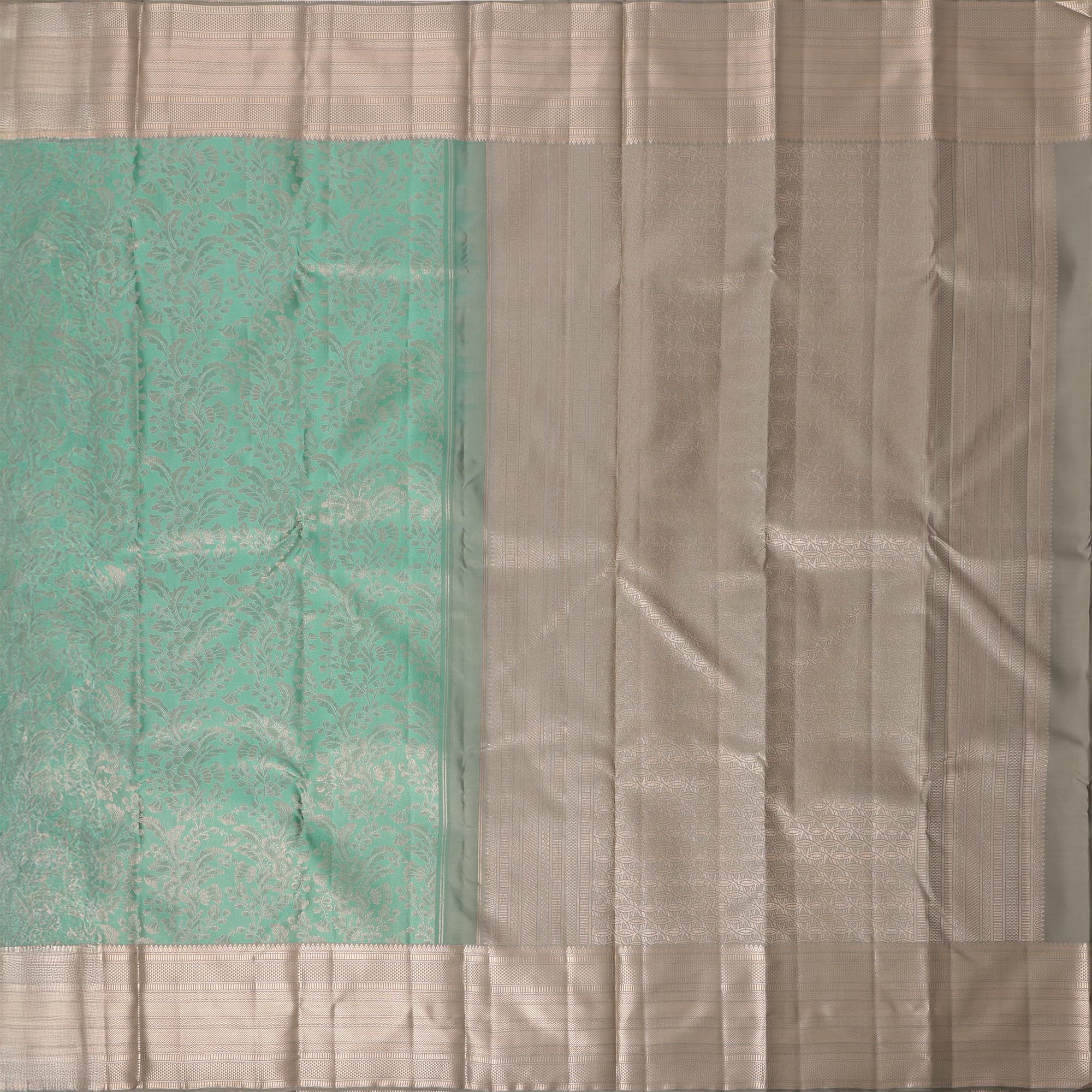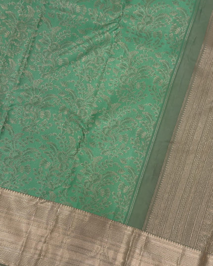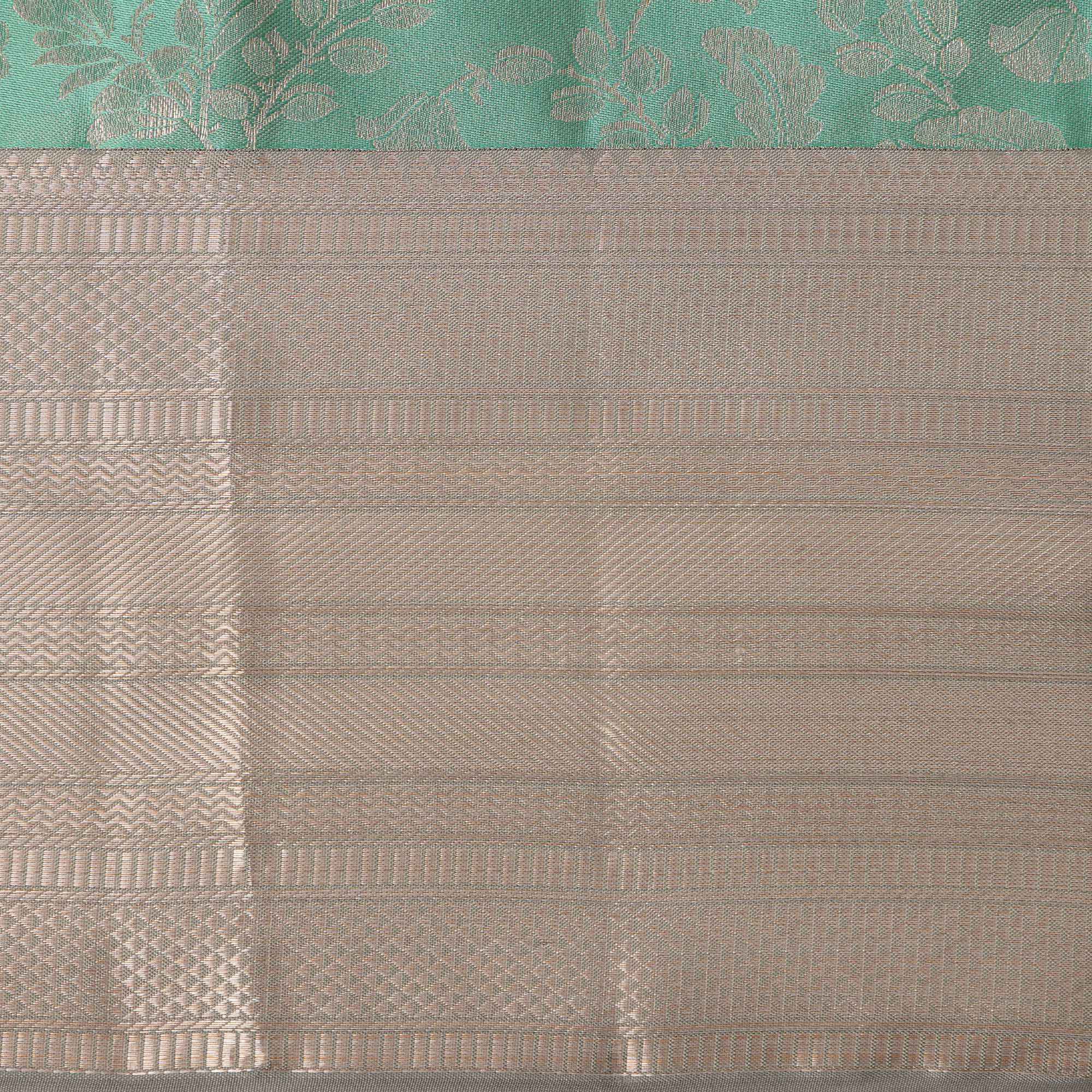 ساري كانجيفارام من الحرير الخالص باللونين البيج والأخضر البحري مع جال مزهر منسوج يدويًا وحواف زاري متباينة، 5.5 متر مع قطعة بلوزة، أصله من الهند - D22716