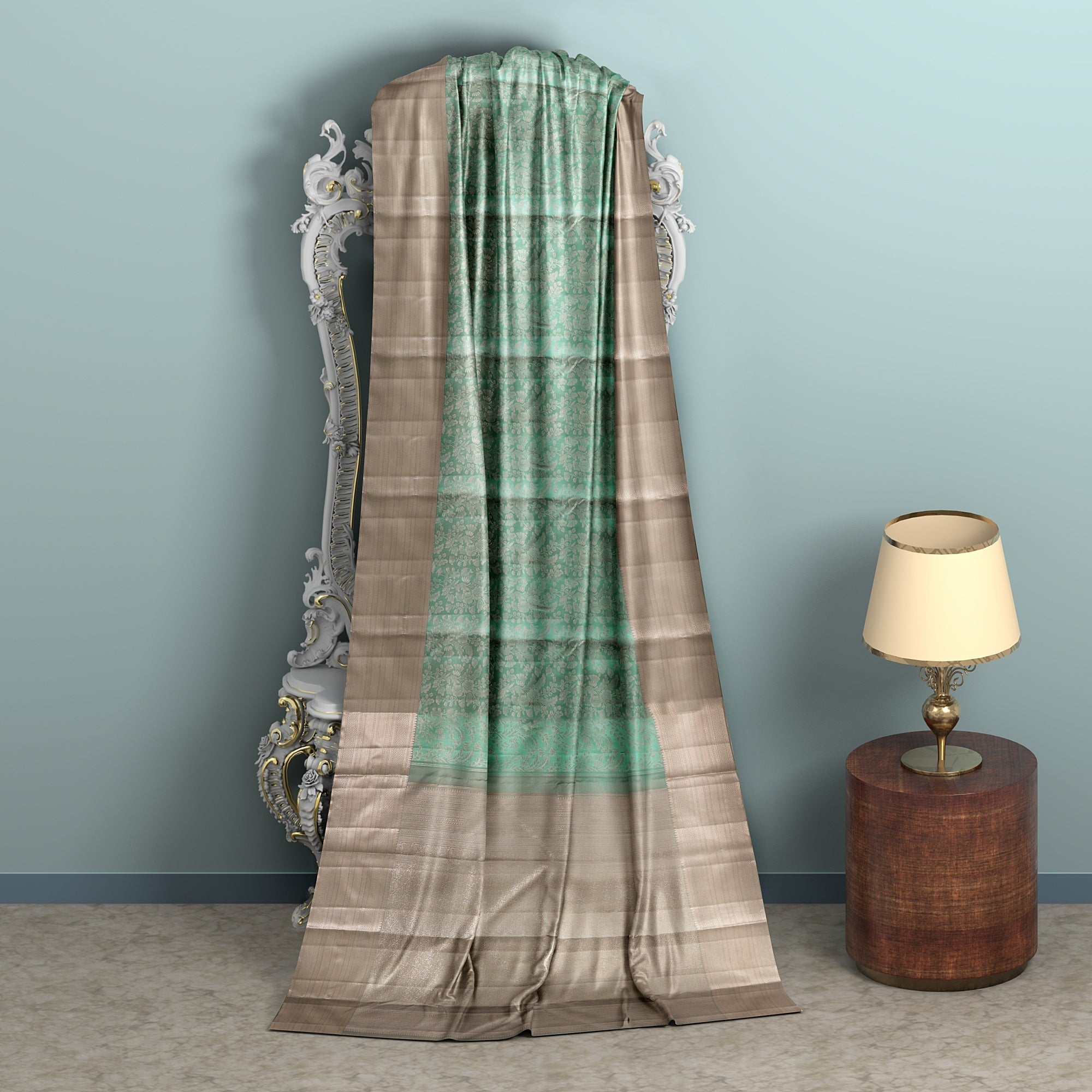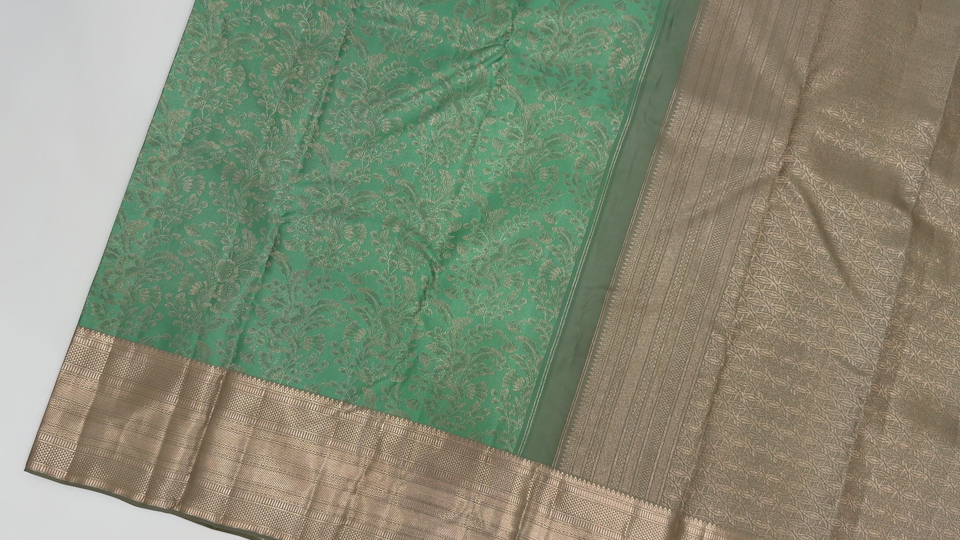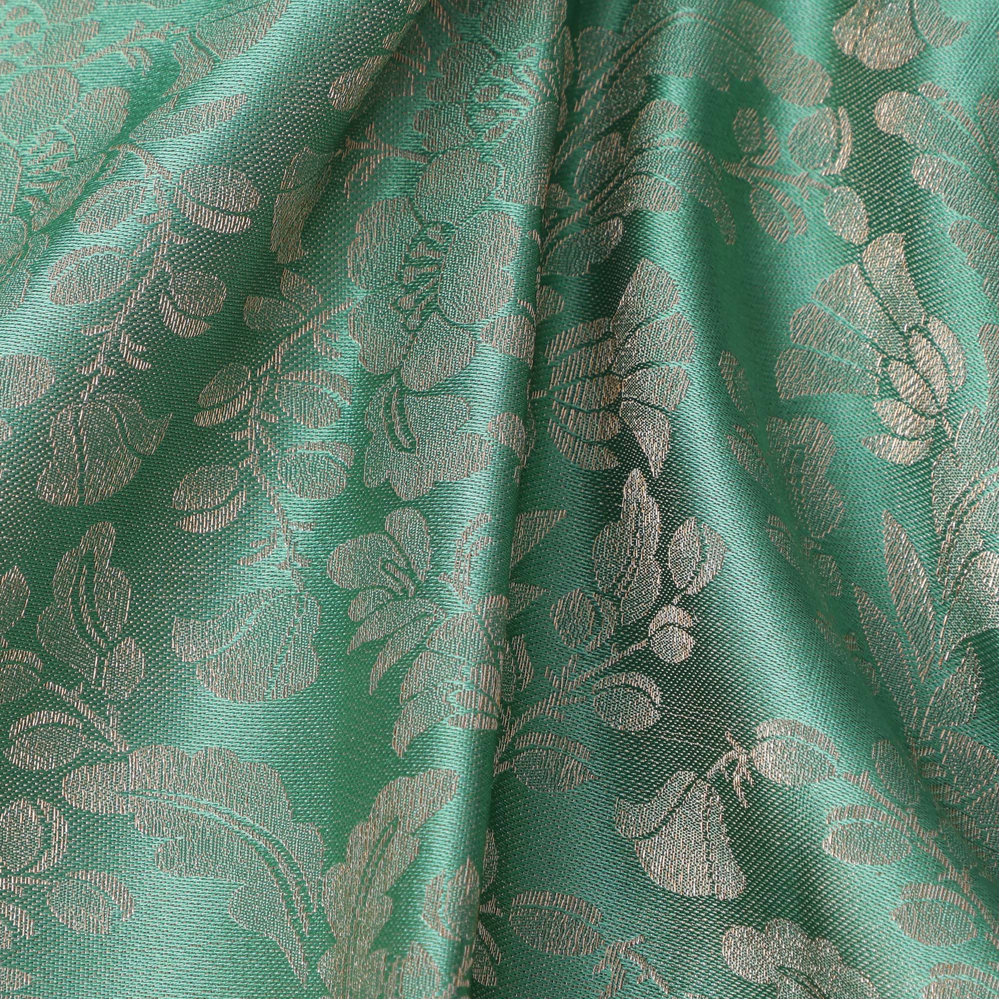 ساري كانجيفارام من الحرير الخالص باللونين البيج والأخضر البحري مع جال مزهر منسوج يدويًا وحواف زاري متباينة، 5.5 متر مع قطعة بلوزة، أصله من الهند - D22716