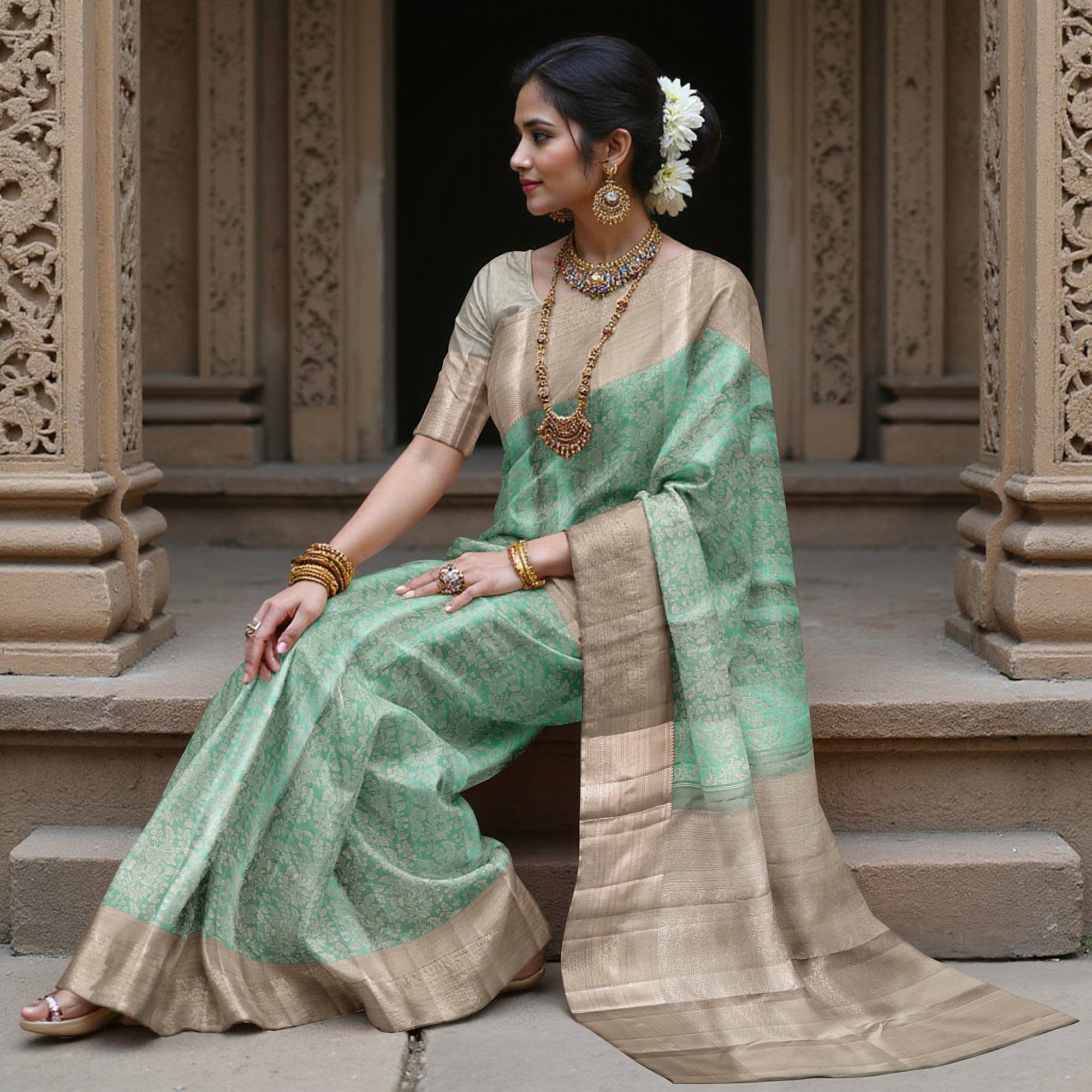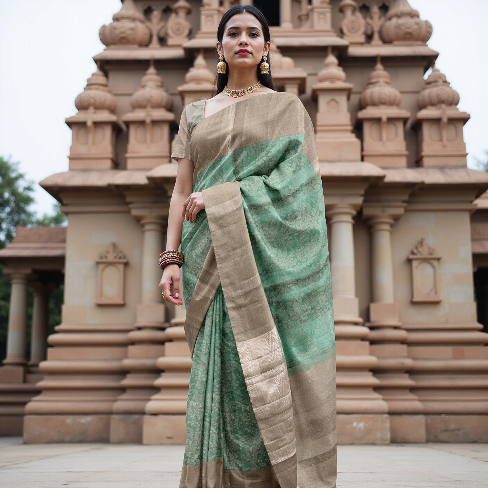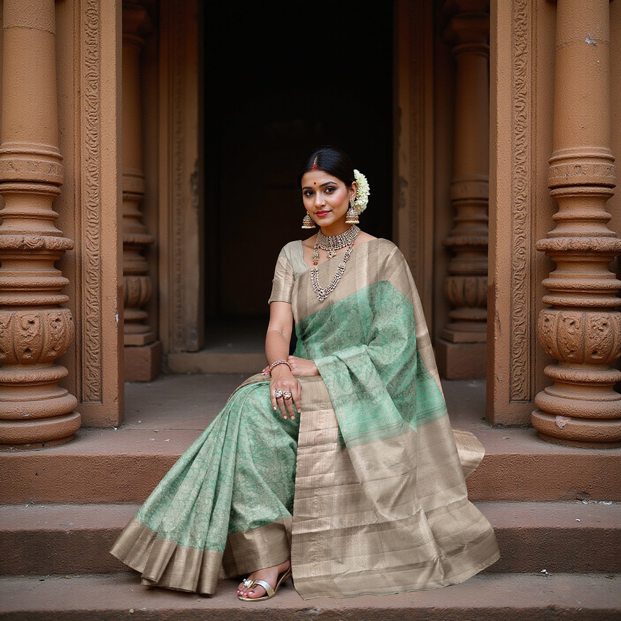 ساري كانجيفارام الحريري الخالص باللونين البيج والأخضر البحري هو تفسير شعري للفن الكلاسيكي المنسوج في ستائر ملكية. مصنوع من حرير ريجال فابريكس الفاخر ومنسوج يدويًا على مدار 48 ساعة من قبل حرفيين مهرة من جنوب الهند، يتميز الساري بزهرة جال خضراء بحرية ساحرة تتدفق عبر اللوحة المركزية مثل اللوحات الجدارية للمعابد التي تم إحياؤها. تؤطر القاعدة البيج الهادئة هذا العمل الفني، الذي تم رفعه مع حدود زاري متباينة غنية تضيف لمسة من الفخامة التراثية. يخلق اندماج البيج الخافت مع الأخضر البحري النابض بالحياة مظهرًا متجذرًا ومنعشًا، مثاليًا لحفلات الزفاف والمناسبات التقليدية ومناسبات المعابد. مع كل ثنية، يروي هذا الساري قصة إرث وإخلاص. تسوق عبر الإنترنت لاحتضان هذا المزيج النادر من فخامة النول اليدوي والفخر الثقافي. التنظيف الجاف فقط للحفاظ على دقة الحرير وبريق النسيج.