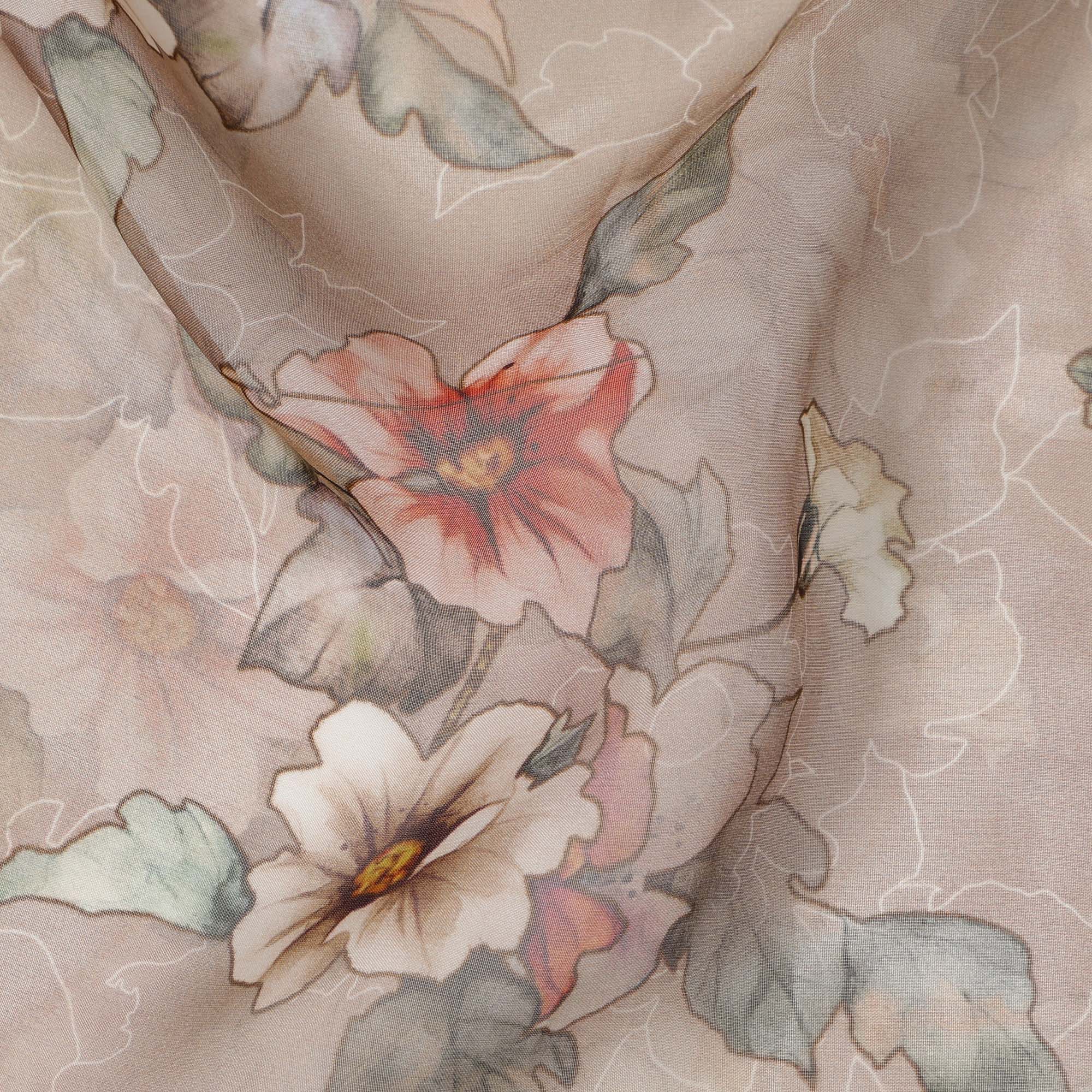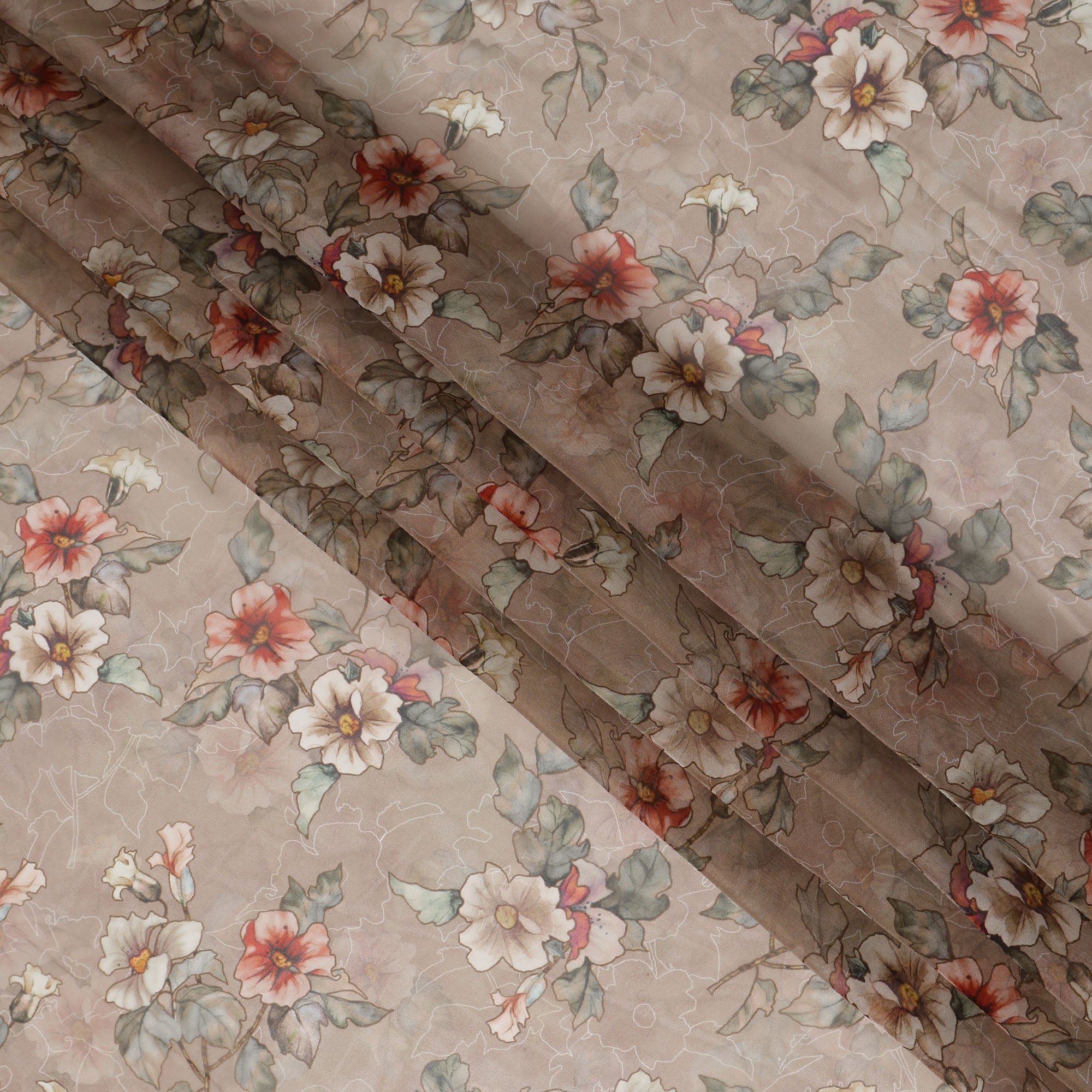 قماش أورجانزا صناعي مطبوع عليه زهور باللون البيج مع أزهار ناعمة باللون المرجاني والعاجي، عرض 110 سم، صنع في الهند - D23319