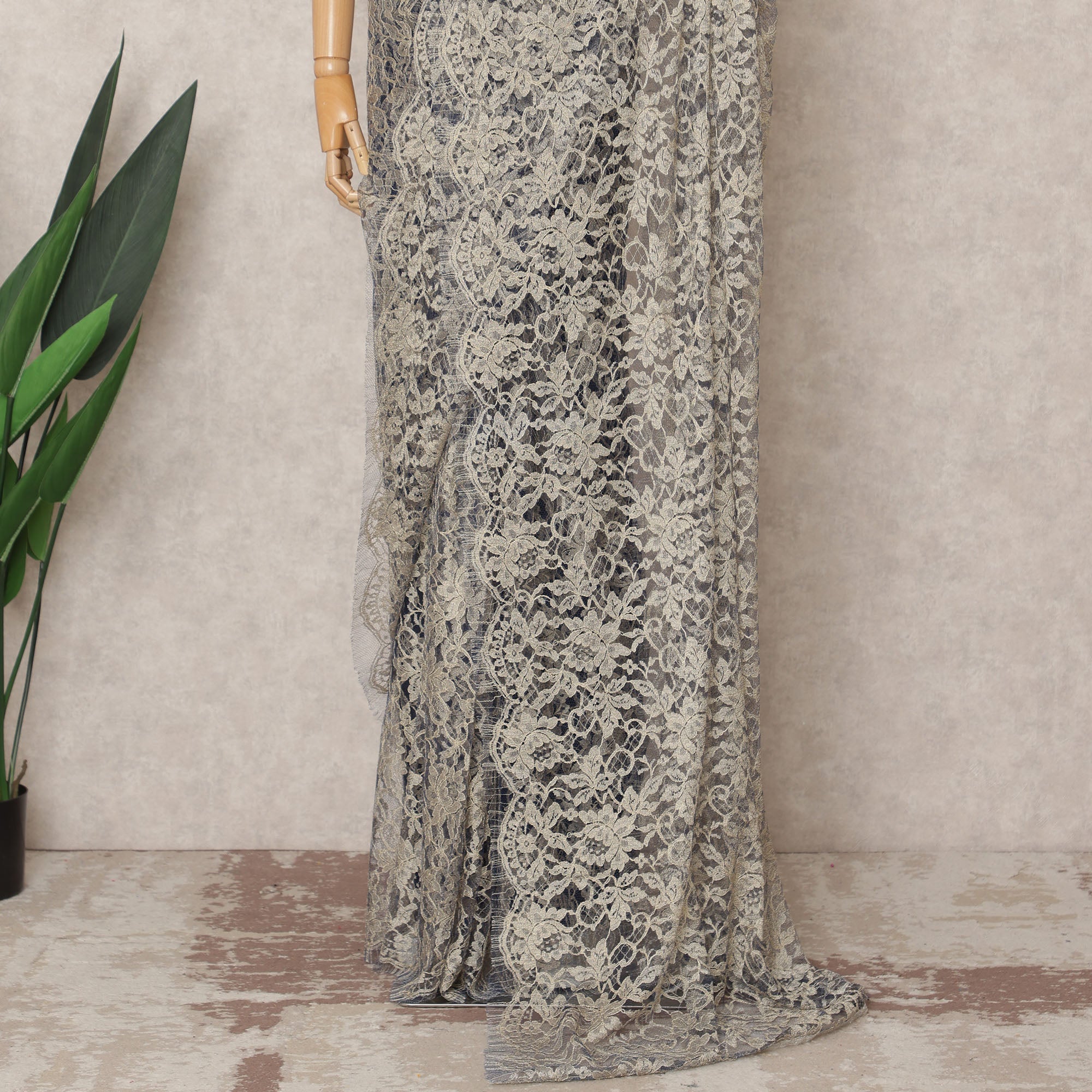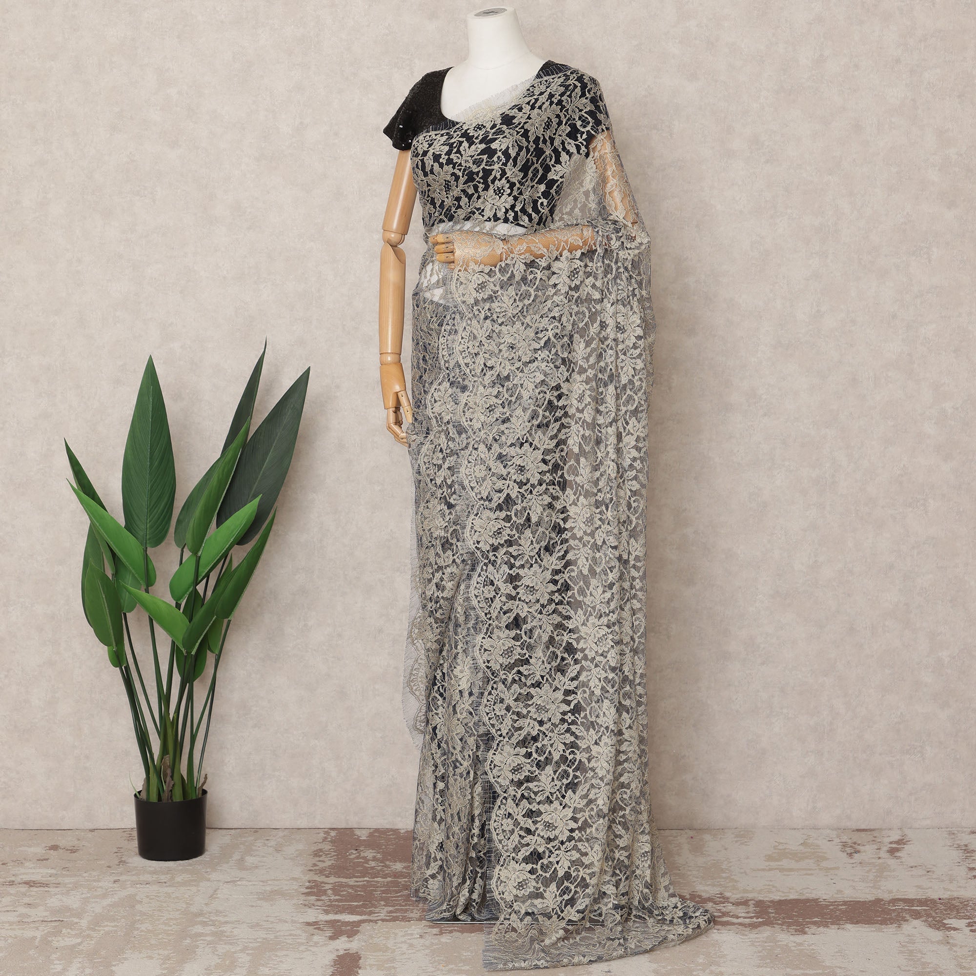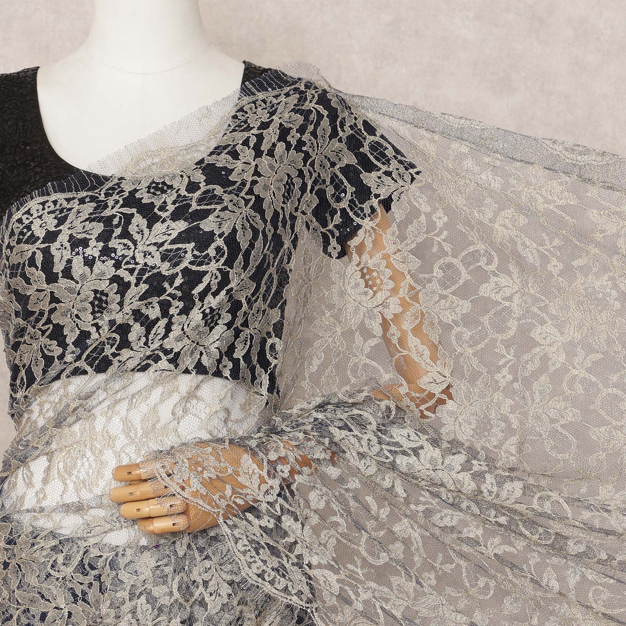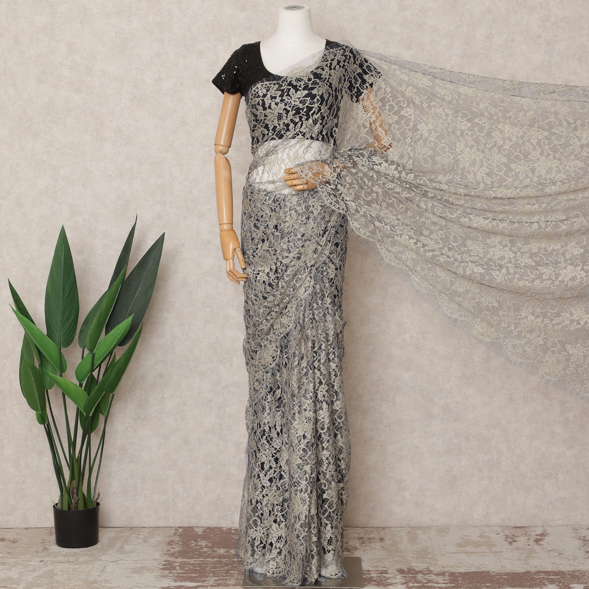 قماش ساري شانتيلي فرنسي فاخر بلونين، بيج، بطول ٥.٥ متر تقريبًا، وعرض ١١٠ سم، صنع في فرنسا - D24077