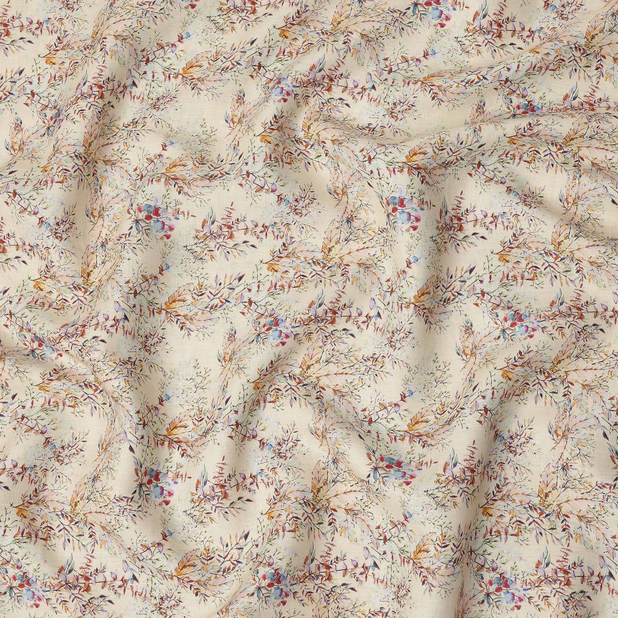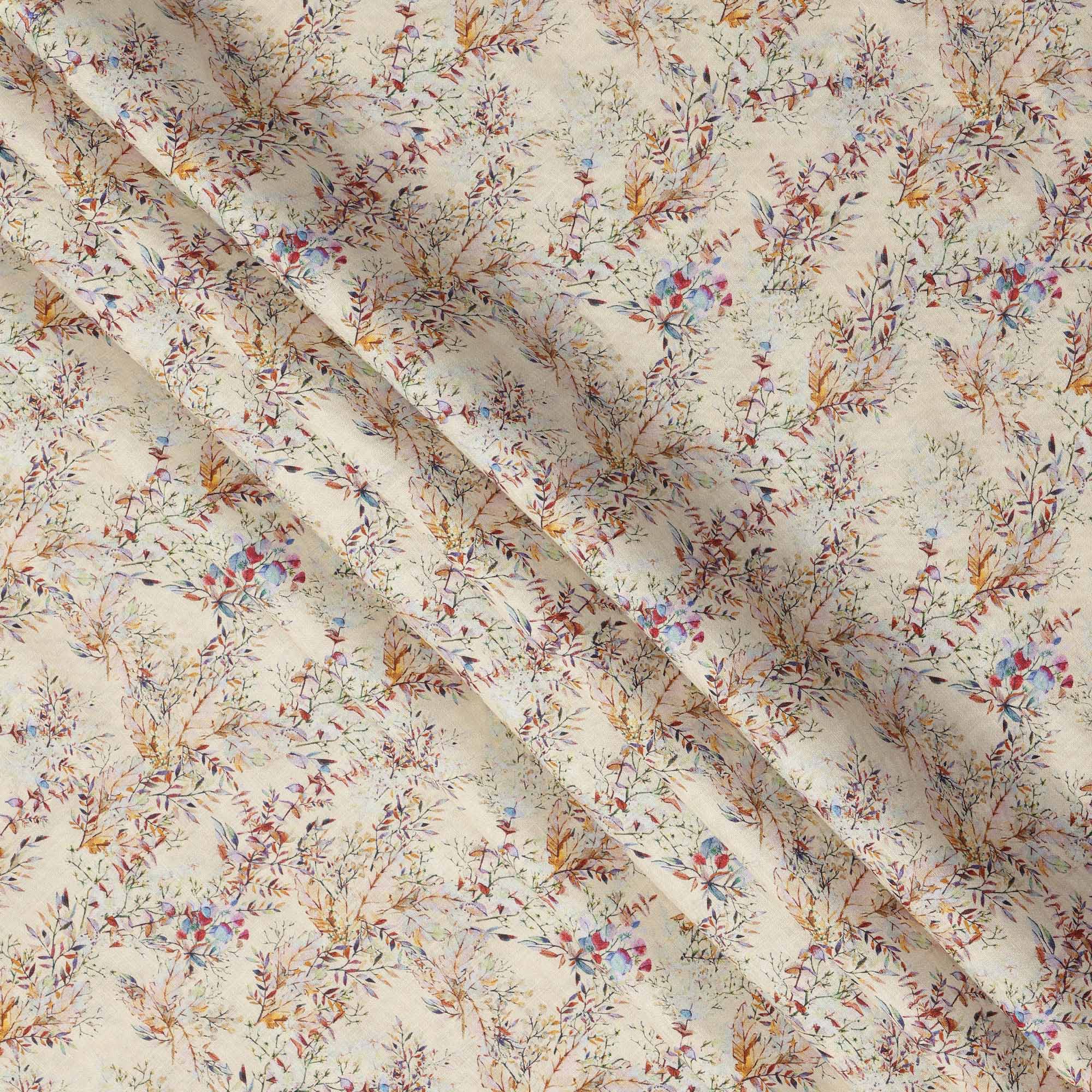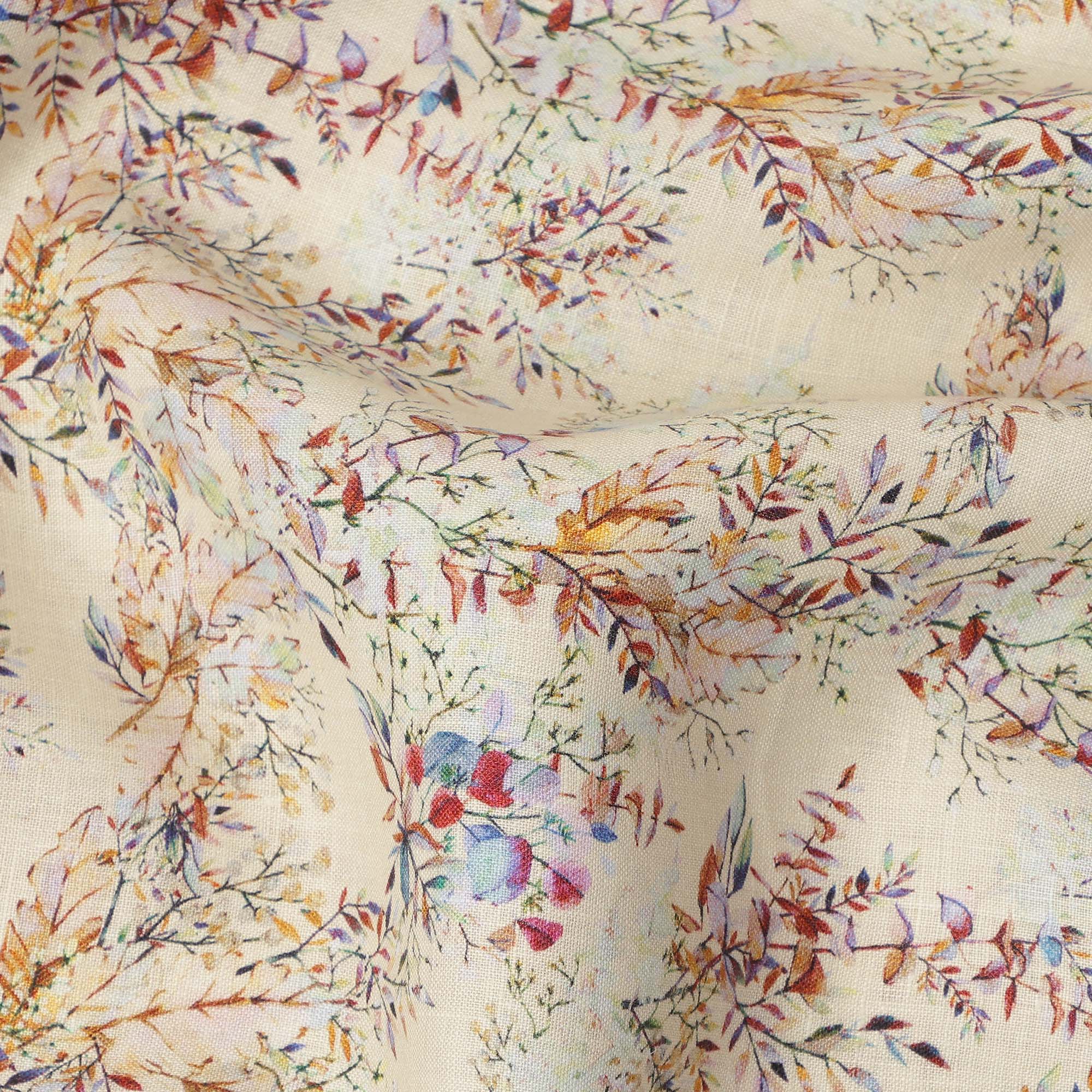 قماش كتان بيج نقي مطبوع عليه زهور كرمة بتصميم أوراق متعدد الألوان، عرض 140 سم، صنع في الهند - D25076
