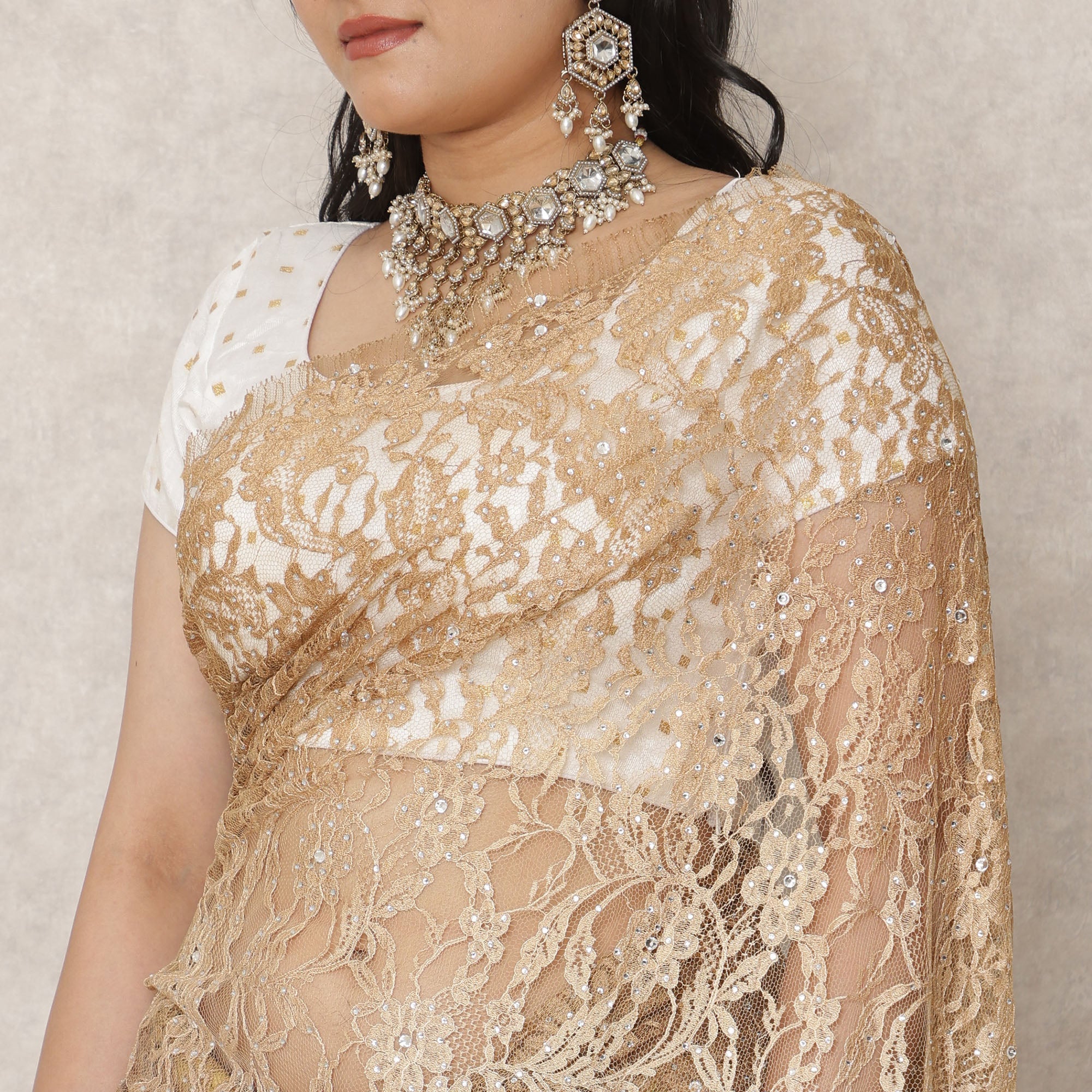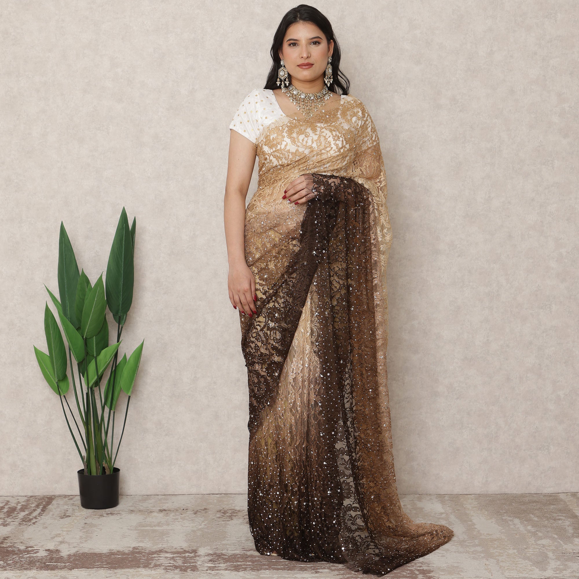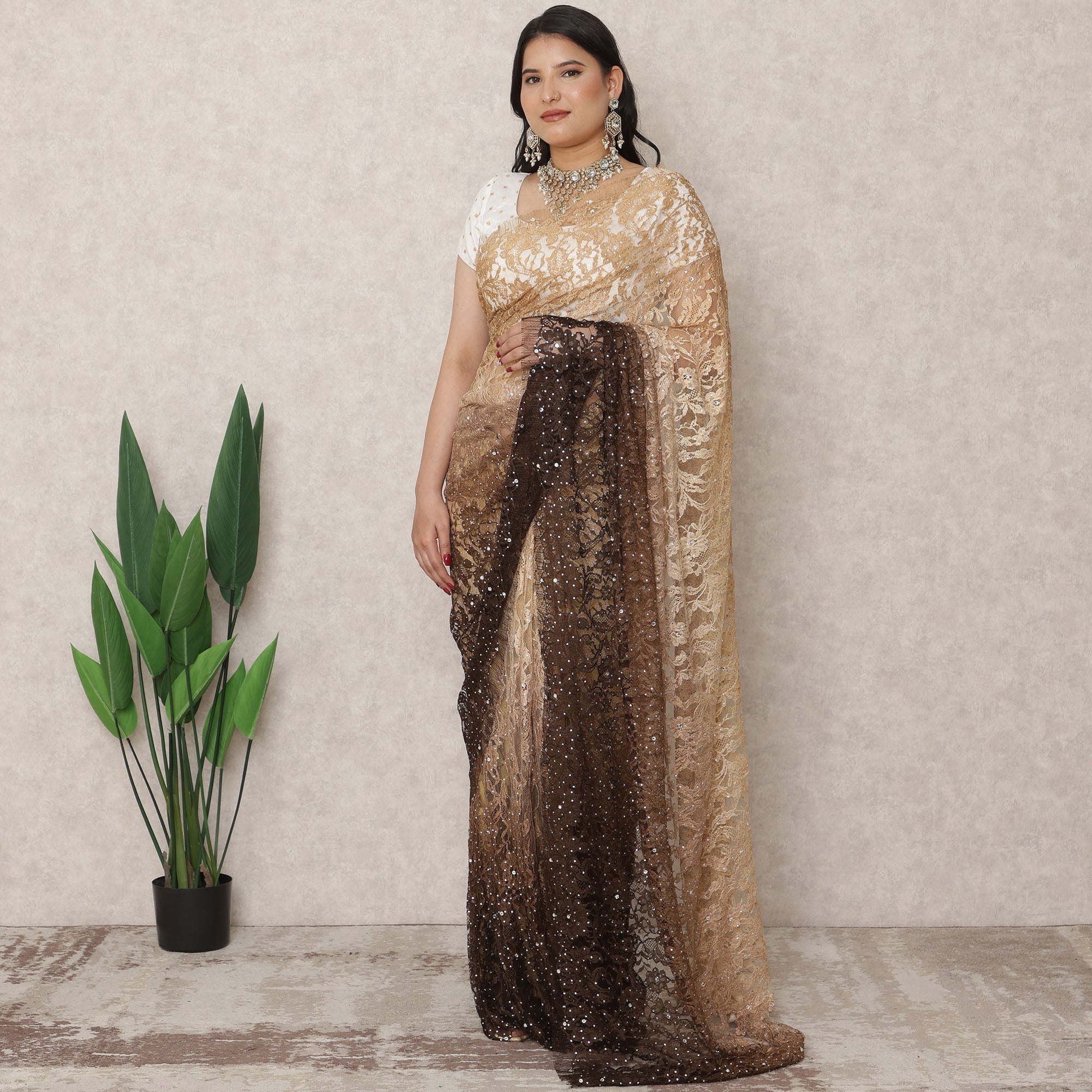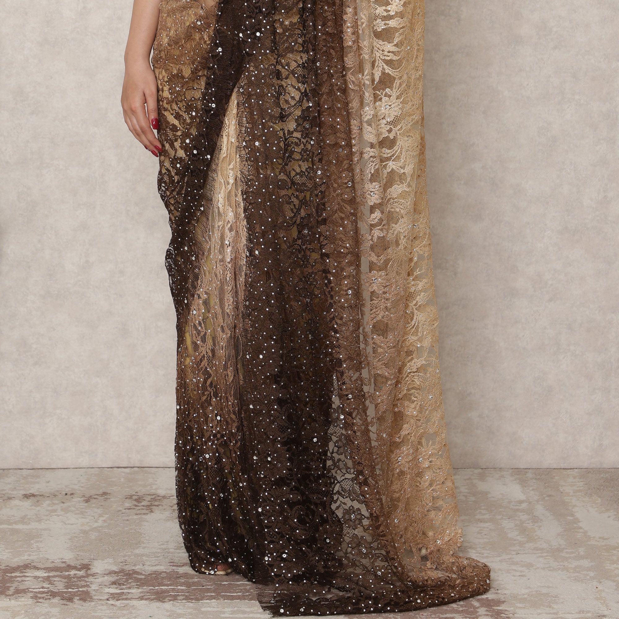 ساري فرنسي فاخر من الدانتيل الشانتيلي بألوان البيج إلى البني الداكن مع تطريز حجري، بطول 5.5 متر وعرض 110 سم، صنع في فرنسا - D24414