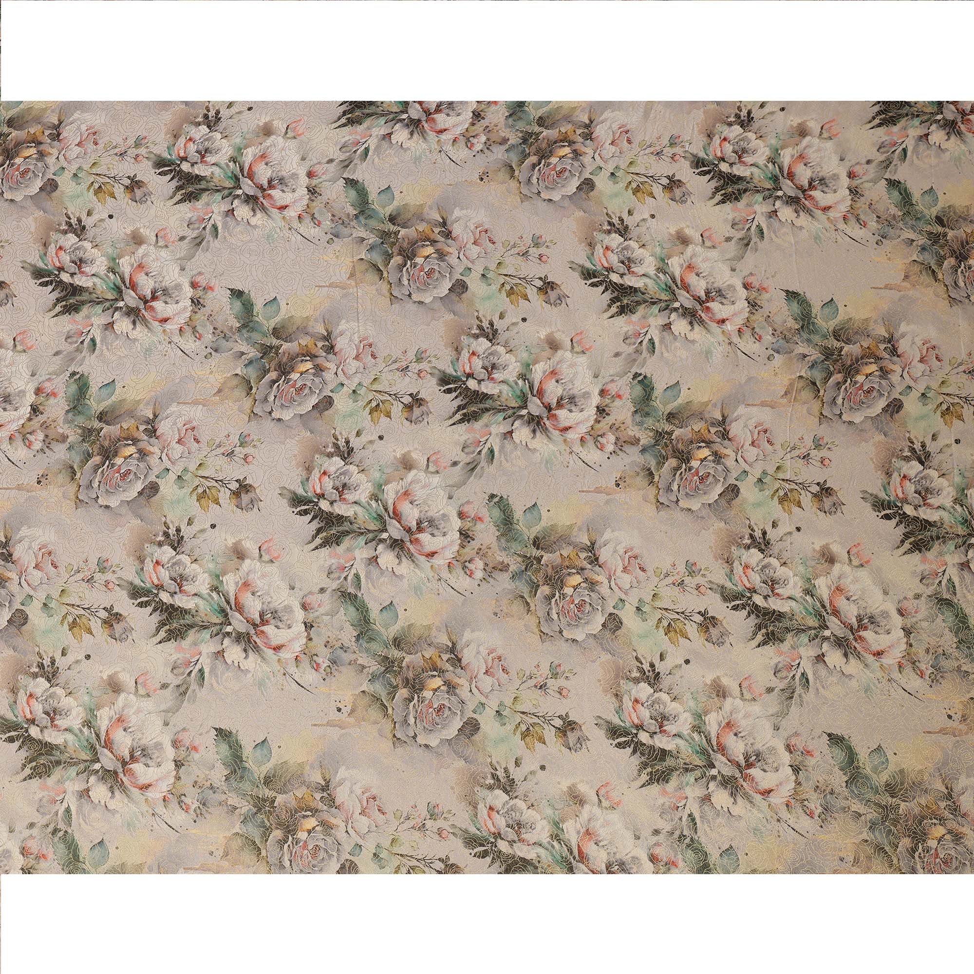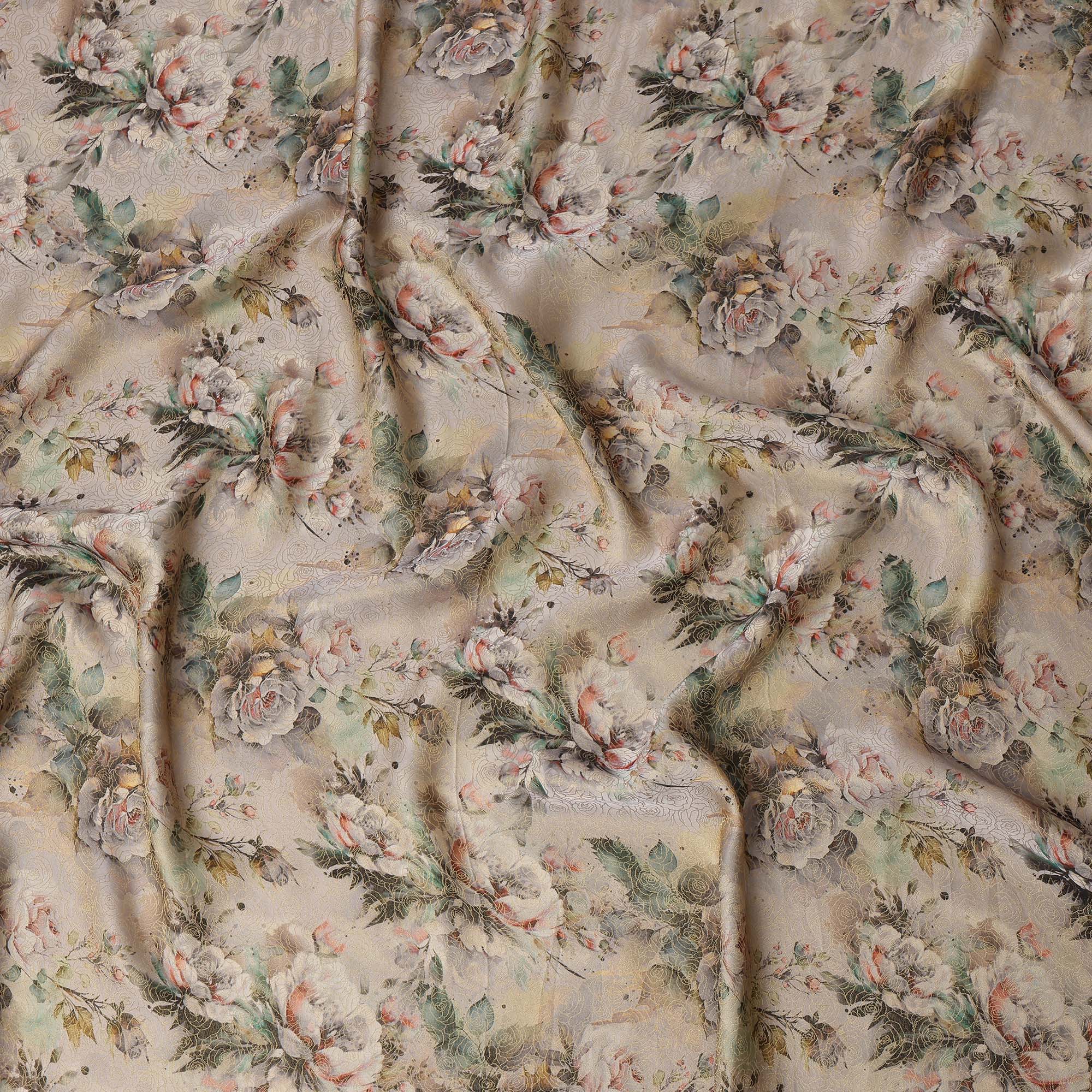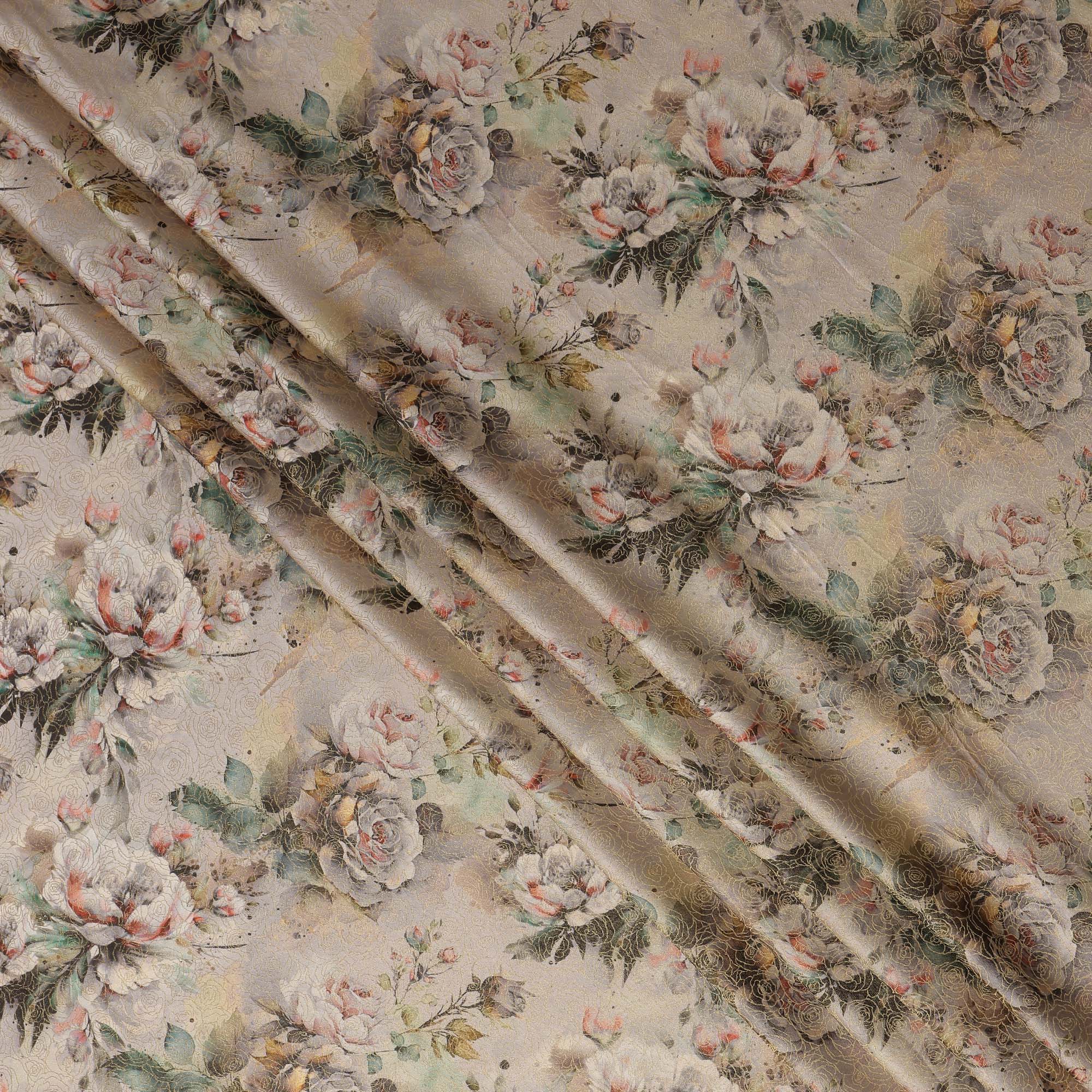 Beige Vintage Floral Print Viscose Brocade Fabric with Soft Pastel Rose Design, Width 110 Cms, Made in India-D26534