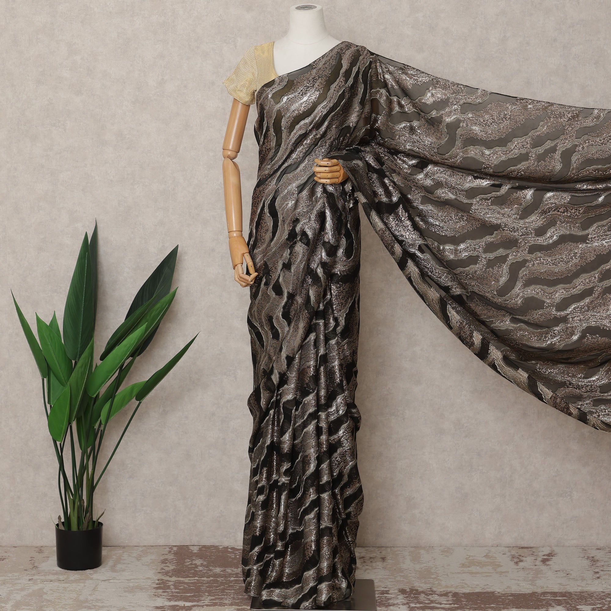أبهري الجميع بهذا الساري الفاخر ذو النمط المعدني الأسود والبرونزي، المصنوع بدقة من الشيفون الفرنسي الفاخر والمزين بقماش لوريكس لامع لمظهر عصري وخالٍ من العيوب. يتميز الشيفون الأسود الانسيابي بتفاصيل معدنية برونزية مجردة تخلق ملمسًا جذابًا، مما يجعله قطعة مميزة للمناسبات الراقية أو الحفلات أو ملابس السهرة. بطول 5.5 متر وعرض 110 سم، يوفر هذا الساري مرونة واسعة في الثنيات والتصميم مع الحفاظ على رشاقته الخفيفة والخفيفة. تضيف خطوط اللوريكس اللامعة لمسة من الرقي والحركة، مما يضمن لك تألقًا في كل خطوة. مصمم للمرأة التي تحتضن السحر الجريء مع الأناقة، يجسد هذا الساري الرقي الأوروبي بلمسة عصرية. لا يشمل البلوزة. يُنظف جافًا فقط للحفاظ على رقة الشيفون واللمسة النهائية المعدنية. تسوق عبر الإنترنت واحصل على قطعة الشيفون الفرنسية الرائعة هذه التي تدمج بين المعادن المعاصرة وجمال الثنيات الكلاسيكي.