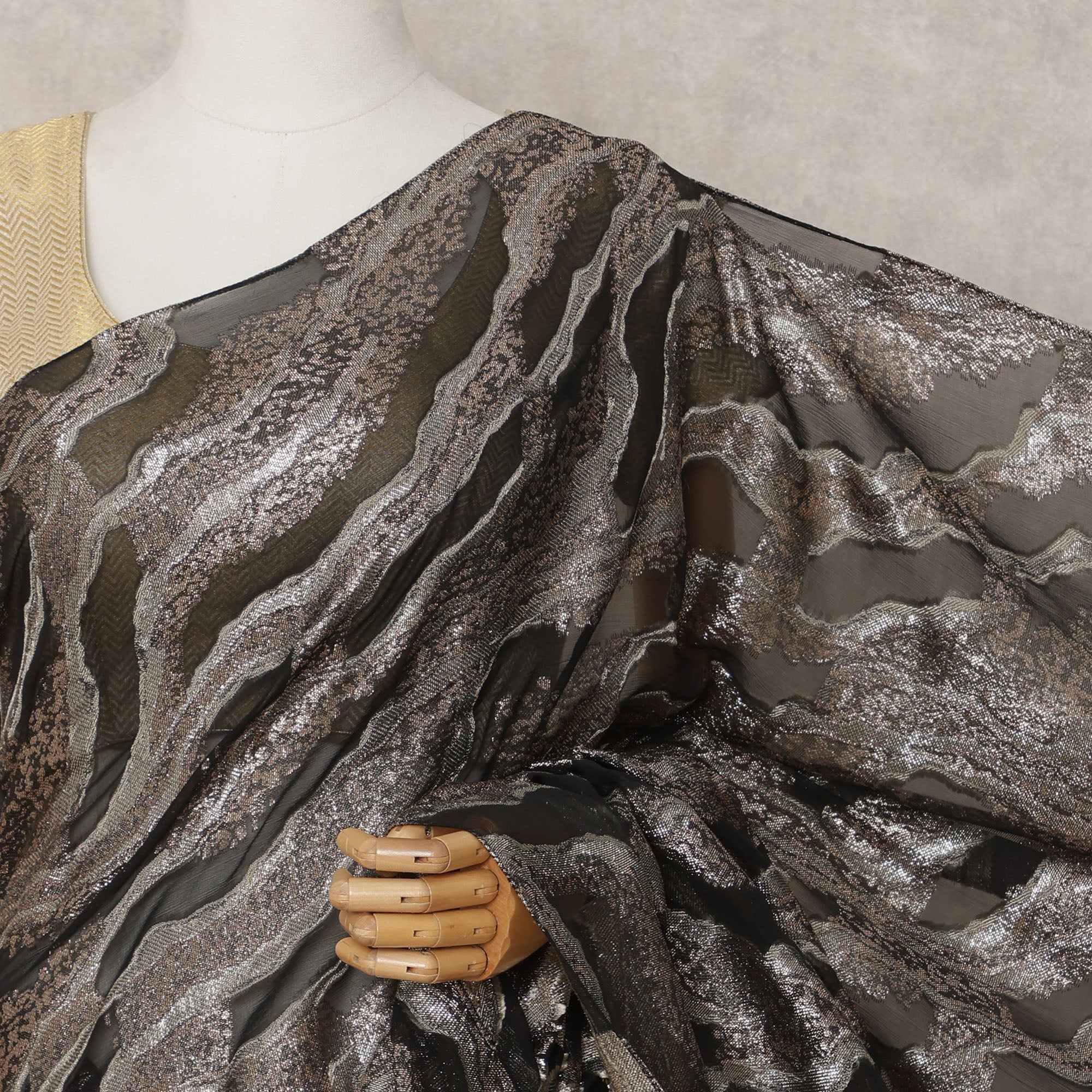 ساري شيفون فرنسي فاخر بنمط معدني أسود وبرونزي مع تطريز لوريكس، طول 5.5 متر، عرض 110 سم، صنع في فرنسا - D24297