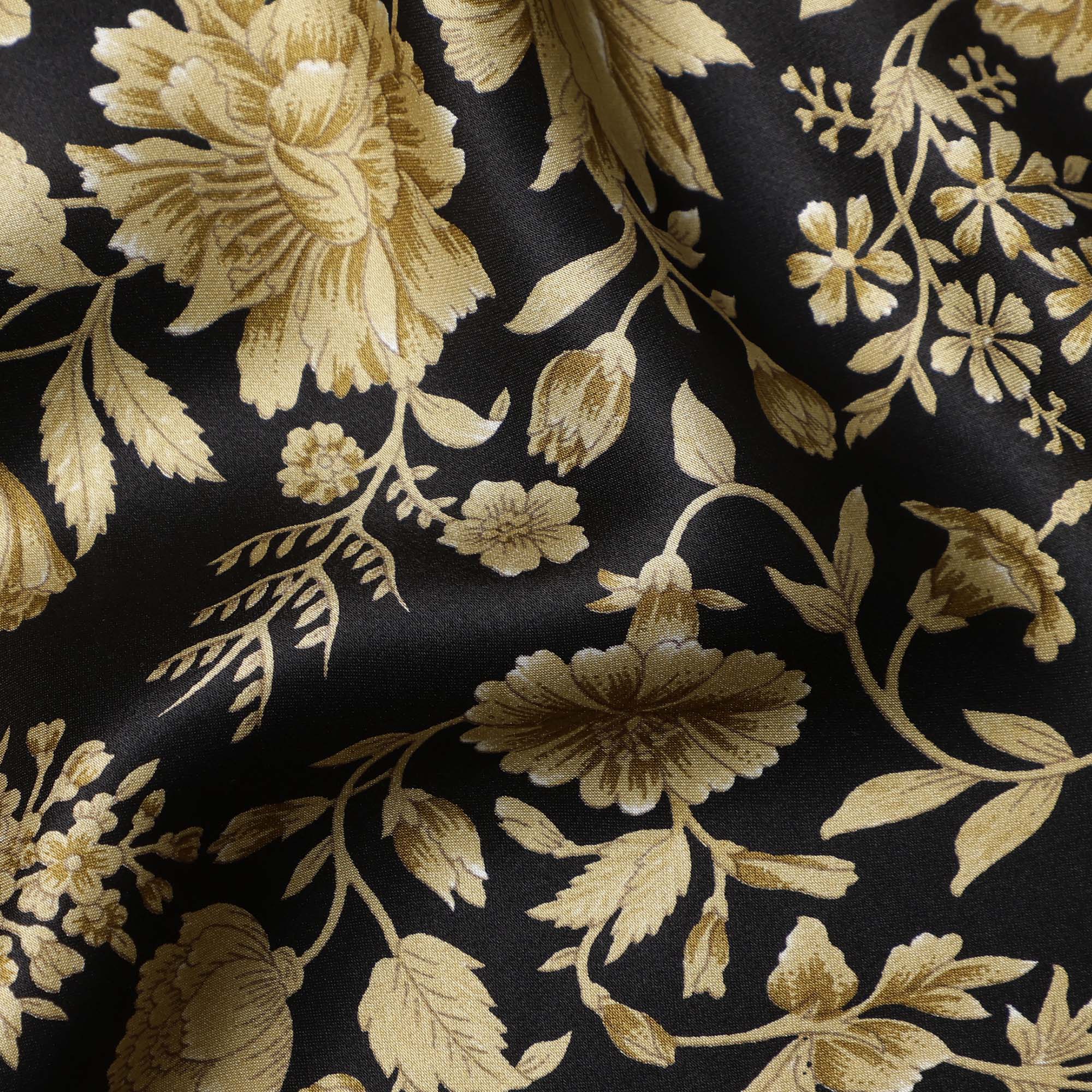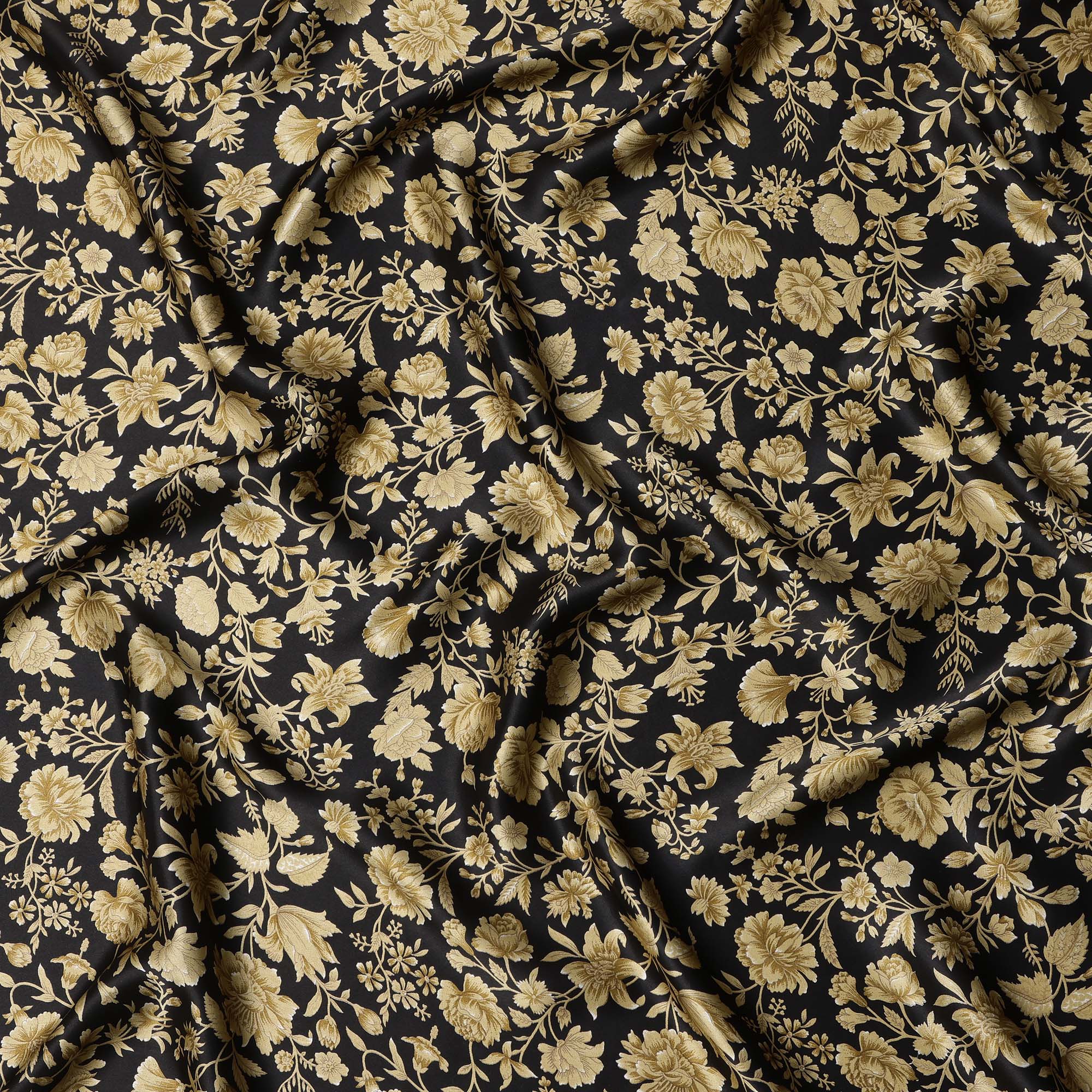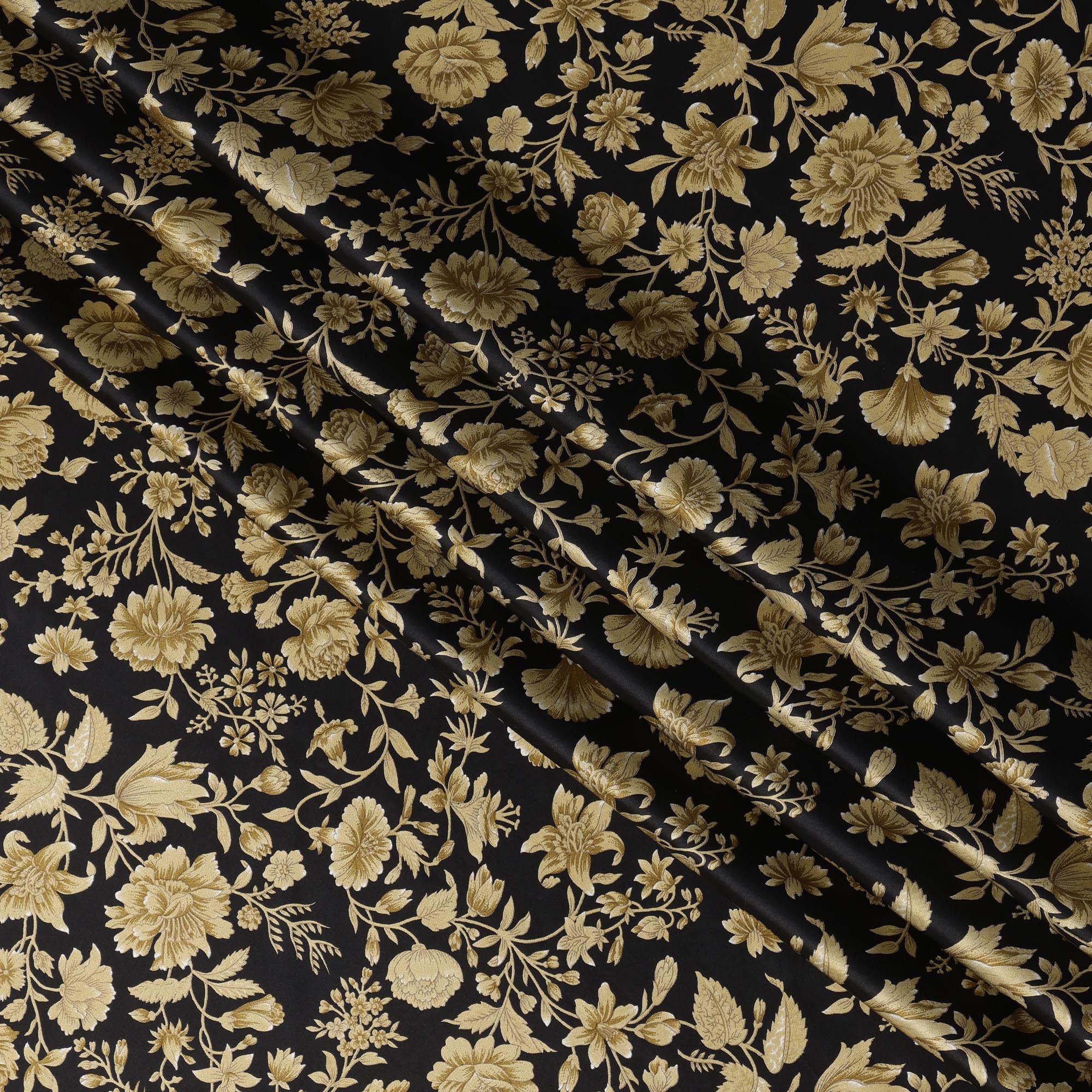 قماش حرير ساتان منسوج بنقشة زهور باللونين الأسود والذهبي مع تفاصيل أنيقة مستوحاة من الديباج، عرض 110 سم، صنع في الهند - D23263