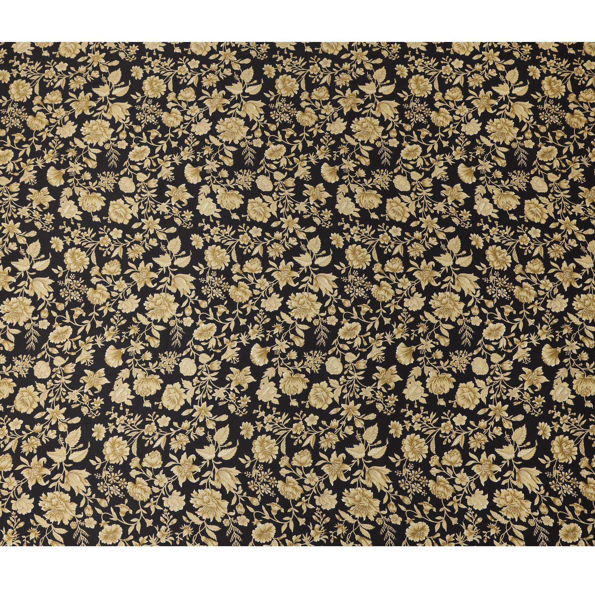 قماش ساتان حريري أسود مع زخارف نباتية ذهبية منسوجة بدقة.