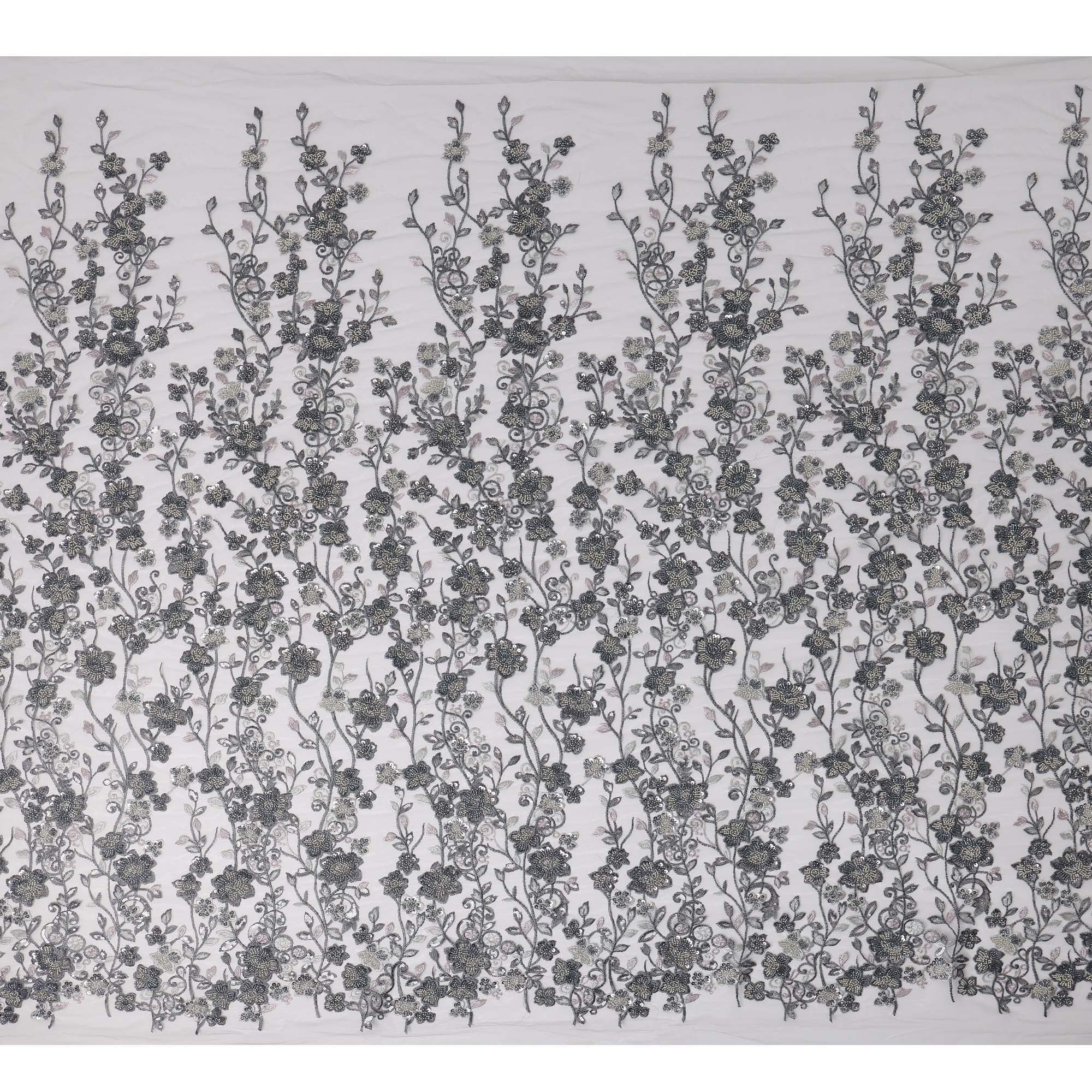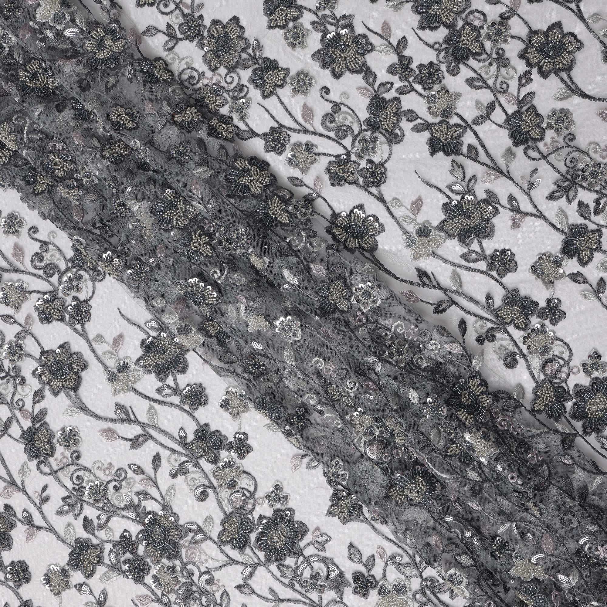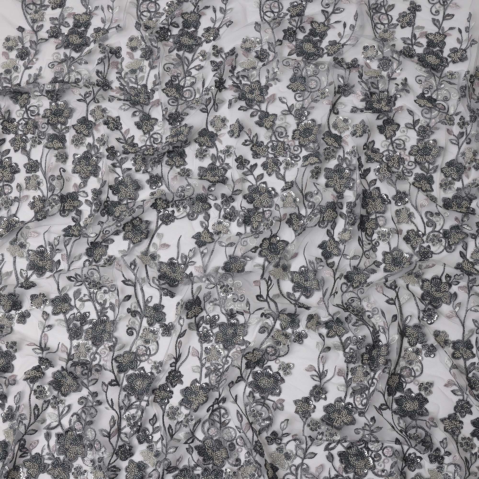 Black and silver nylon tulle with intricate floral sequin embroidery