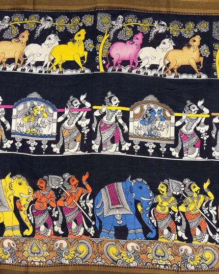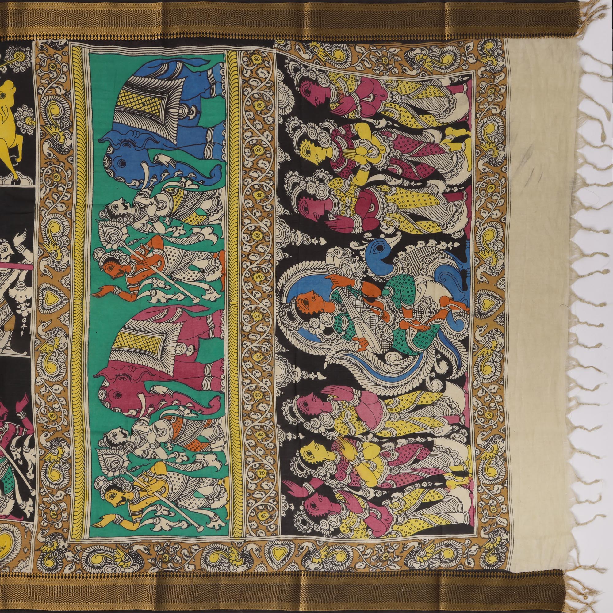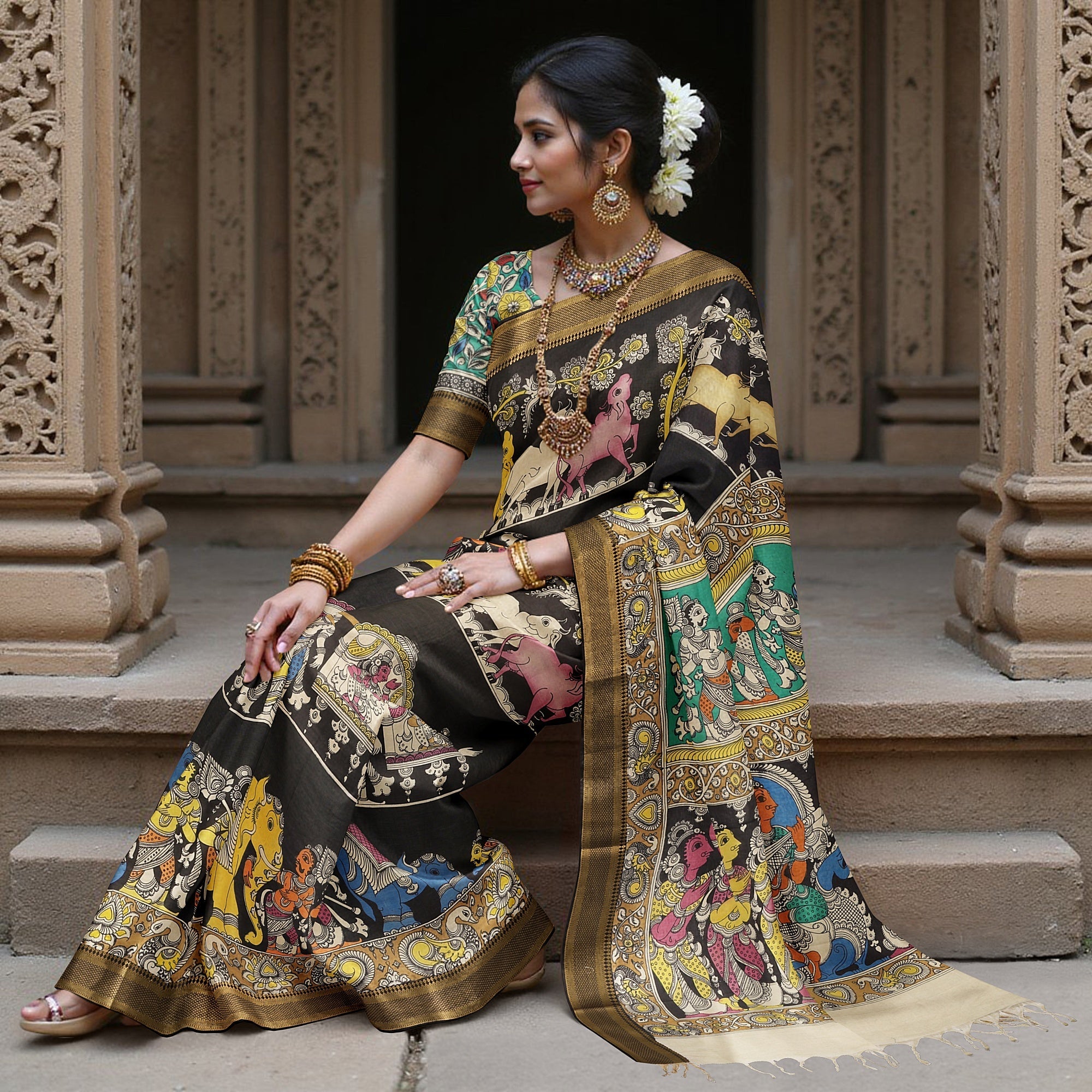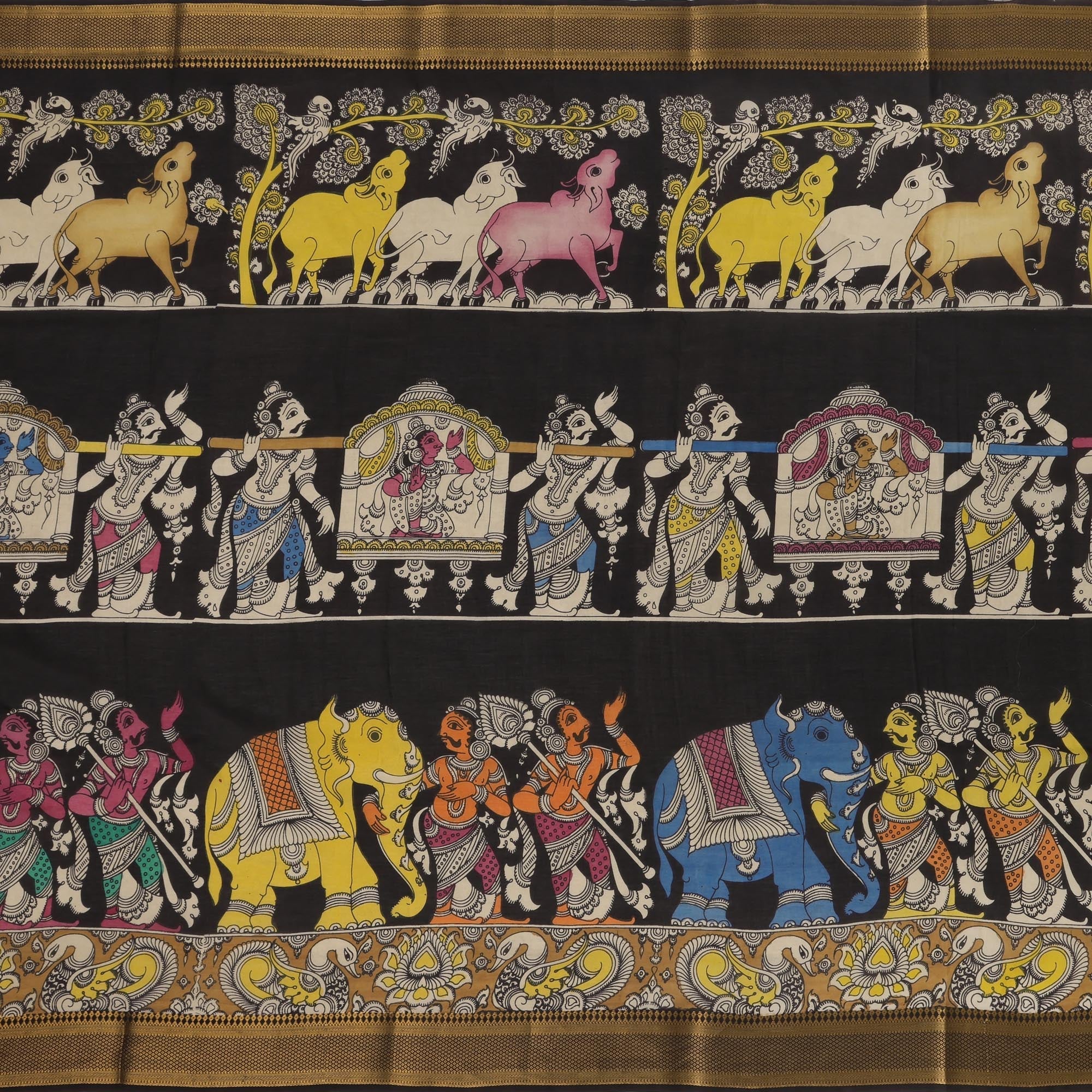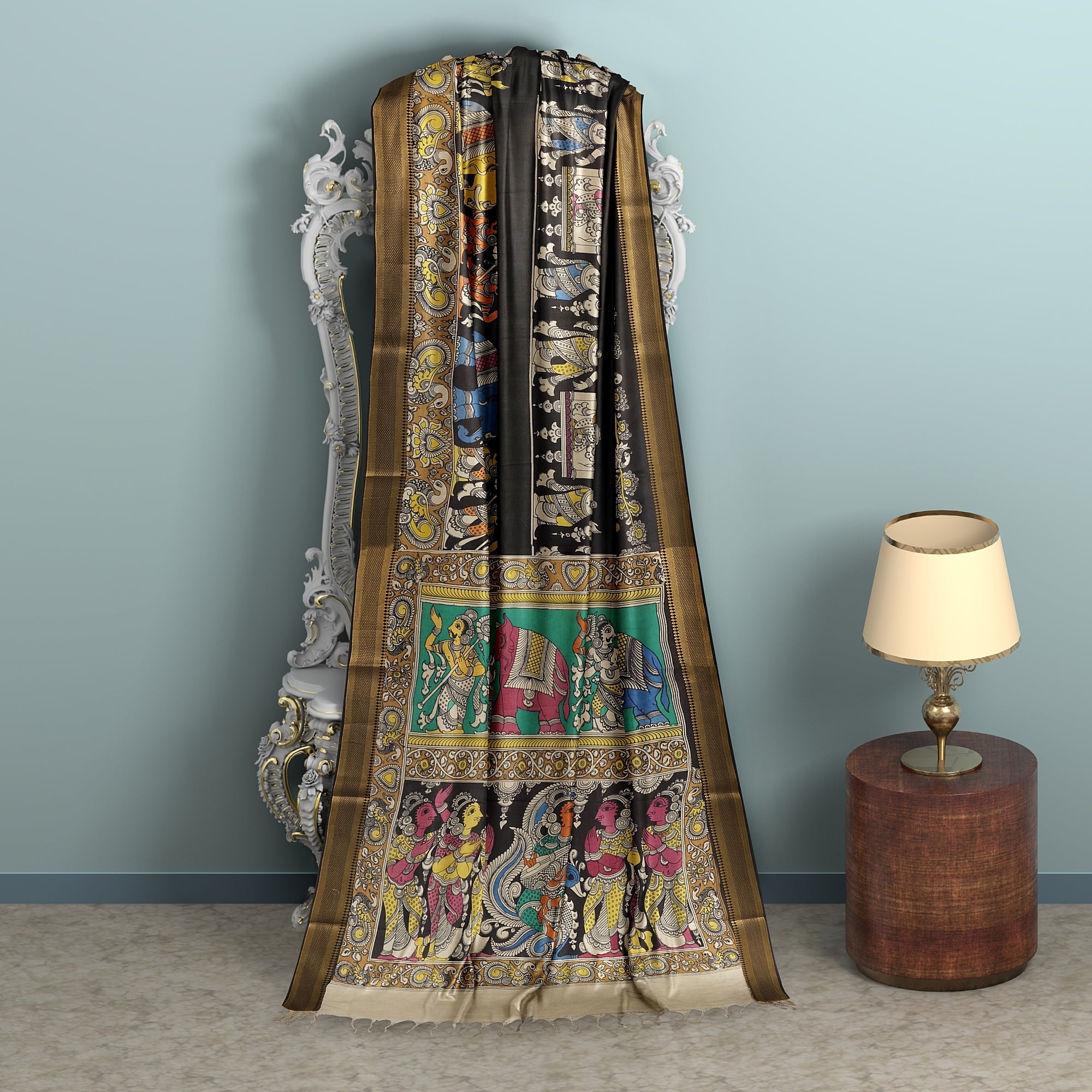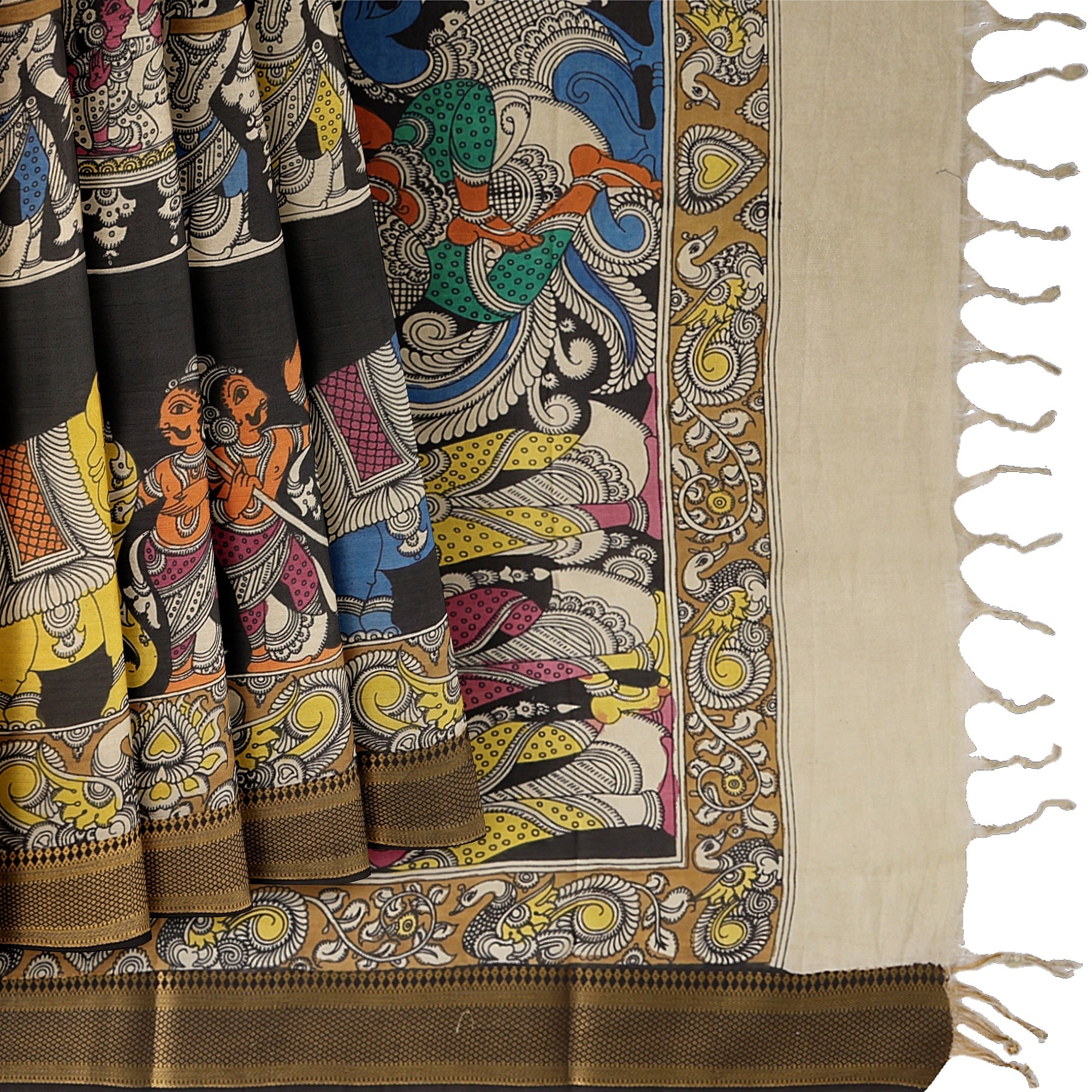 ساري كالامكاري حريري أسود من بنغالور، مزين برسومات أسطورية مرسومة يدويًا، عرض 110 سم، أصله: سري كالاهاستي، الهند، طوله 5.5 متر مع بلوزة - D22838