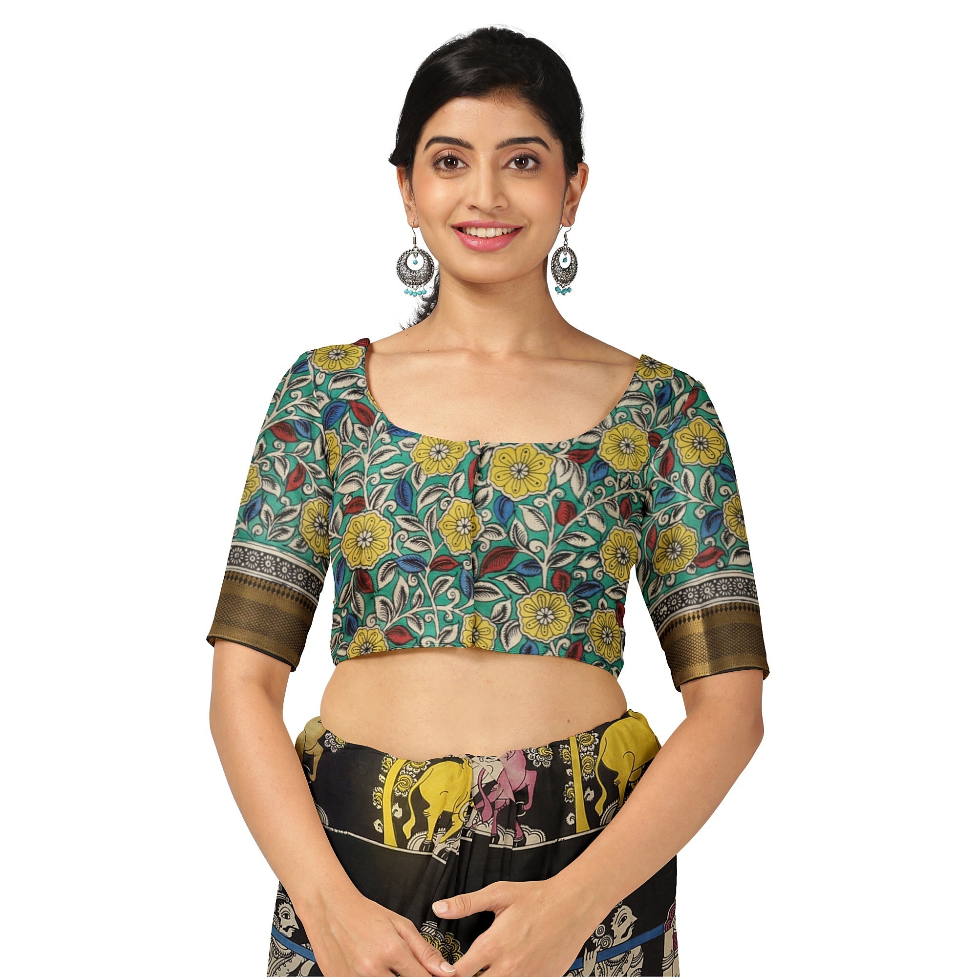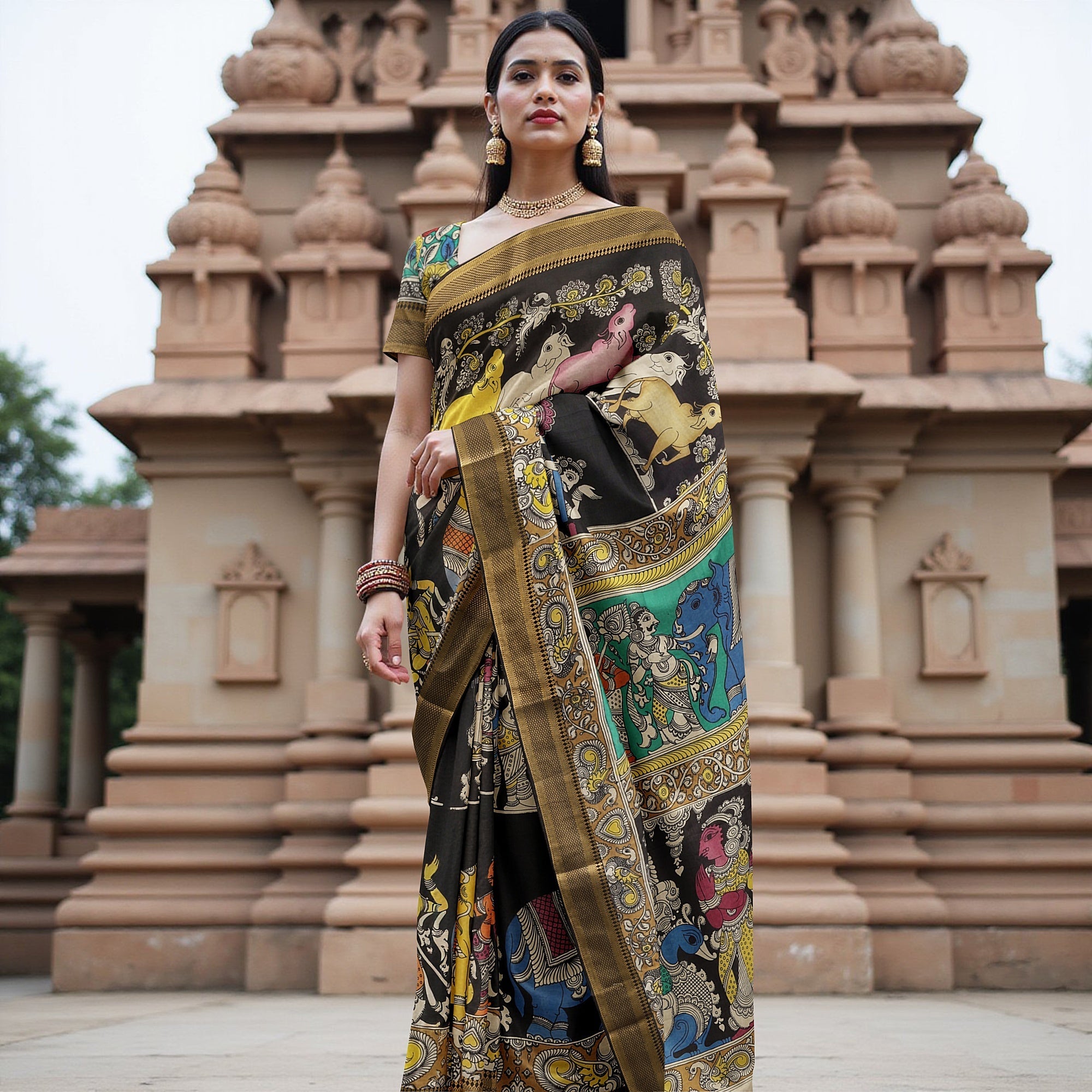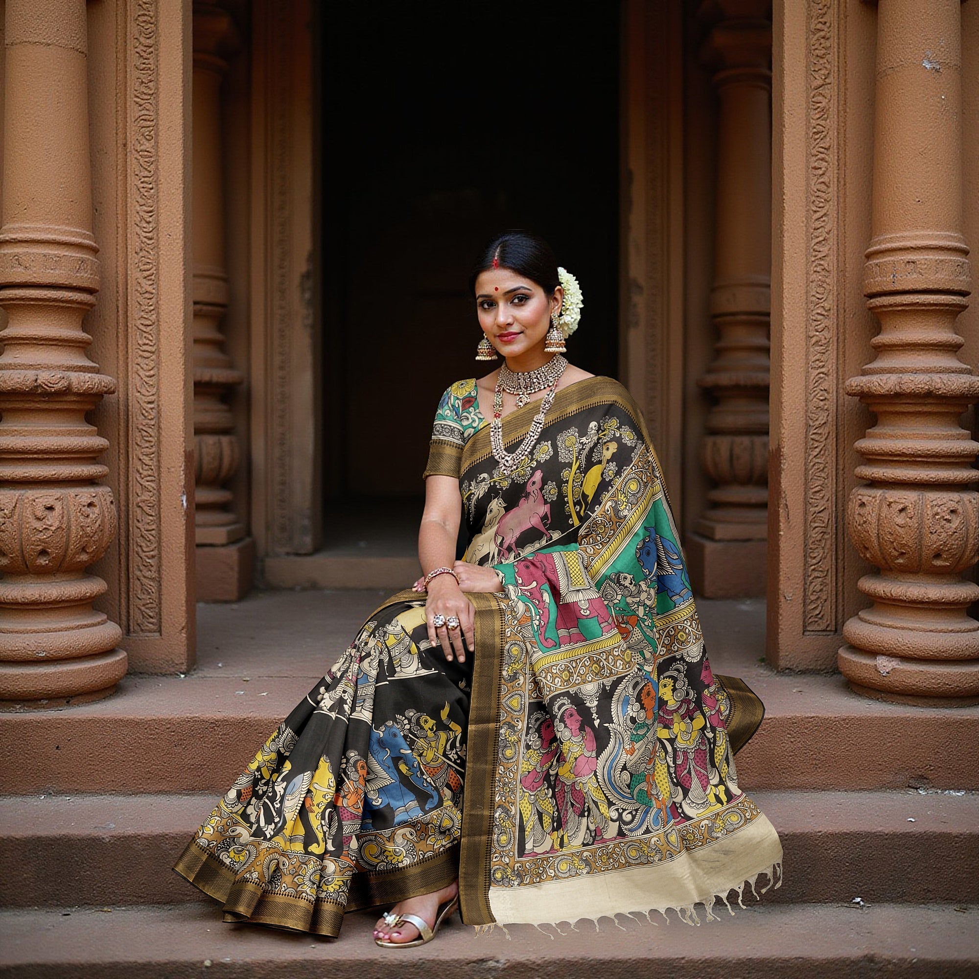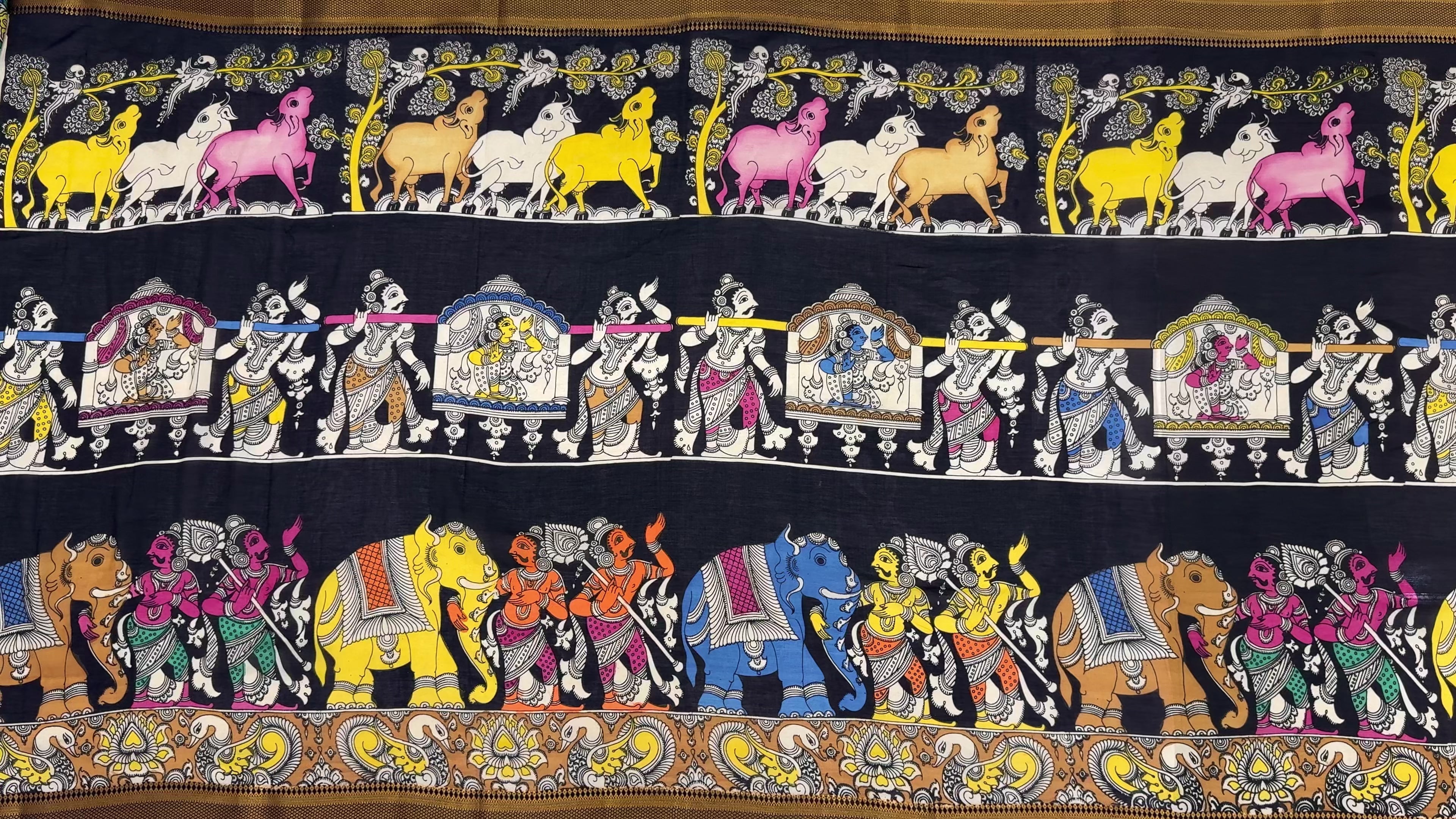 هذا الساري الحريري الأسود من بنغالور، المُصمّم من قِبل حرفيي سري كالاهاستي، ليس مجرد قطعة ملابس، بل هو سردٌ مُلوّنٌ للأساطير الإلهية والفنون التقليدية. صُنع يدويًا على يد حرفيي سري كالاهاستي، حيث تُرسم كلُّ شخصيةٍ وشكلٍ فيه - سواءً أكانت كائناتٍ سماويةً أم رموزًا مقدسةً أم مشاهد معابد - باستخدام أقلام الخيزران المغموسة في أصباغ طبيعية، ويستغرق إنجازه 48 ساعةً بدقةٍ متناهية. تُشكّل الخلفية ذات اللون الفيروزي لوحةً فنيةً خلابةً تُضفي عليها درجاتُ الصدأ والفحم والأصفر الفاتح إشراقةً بتفاصيل دقيقةٍ وقوية. يتميز هذا الساري، الذي يبلغ طوله 5.5 متر، بملمسه الناعم وتعبيره الجريء، وهو مثاليٌّ لمن يُقدّرون الثقافة في كلِّ خيط. تسوّقي عبر الإنترنت لتتألقي بقصةٍ خالدةٍ مُتجذّرةٍ في التراث الهندي المقدس.