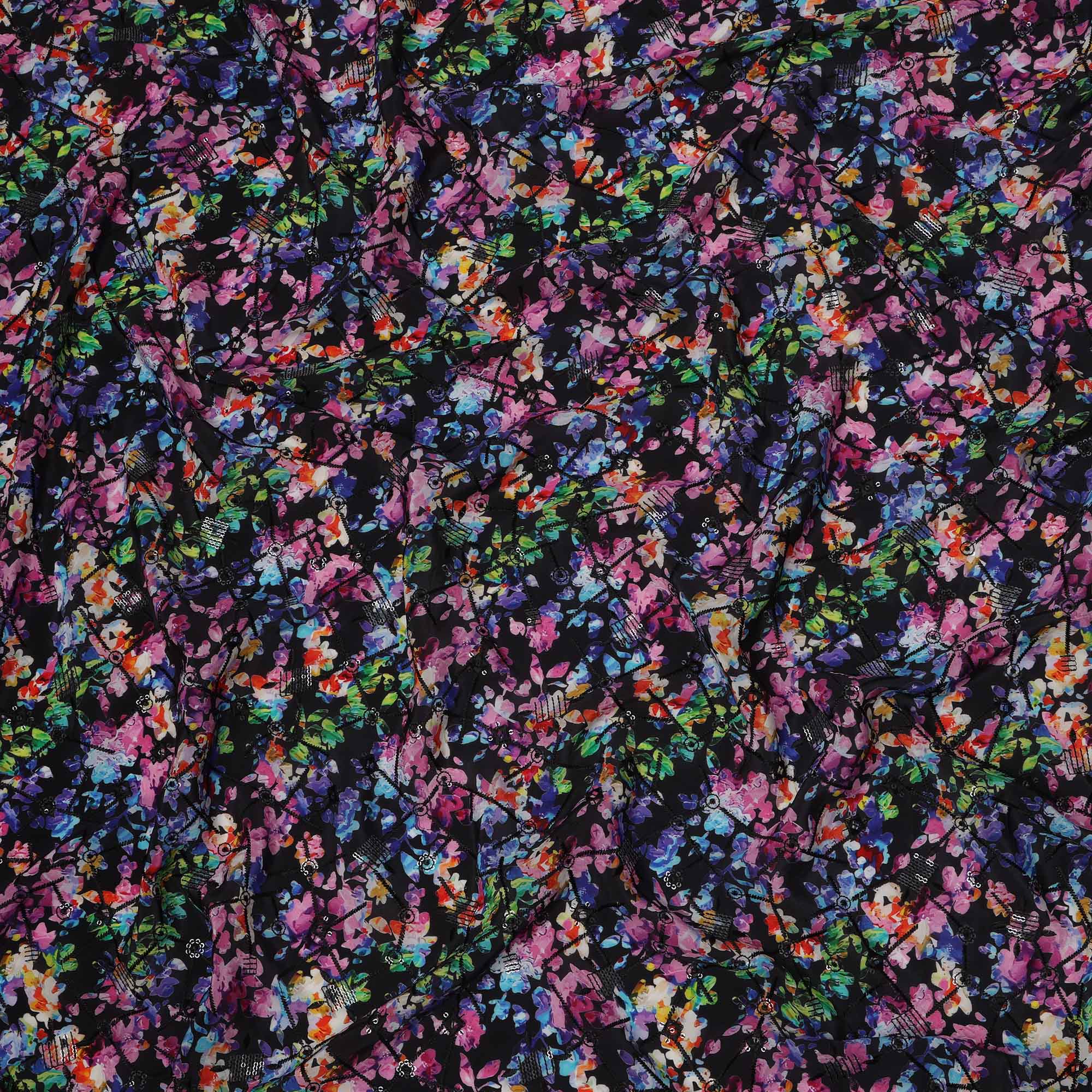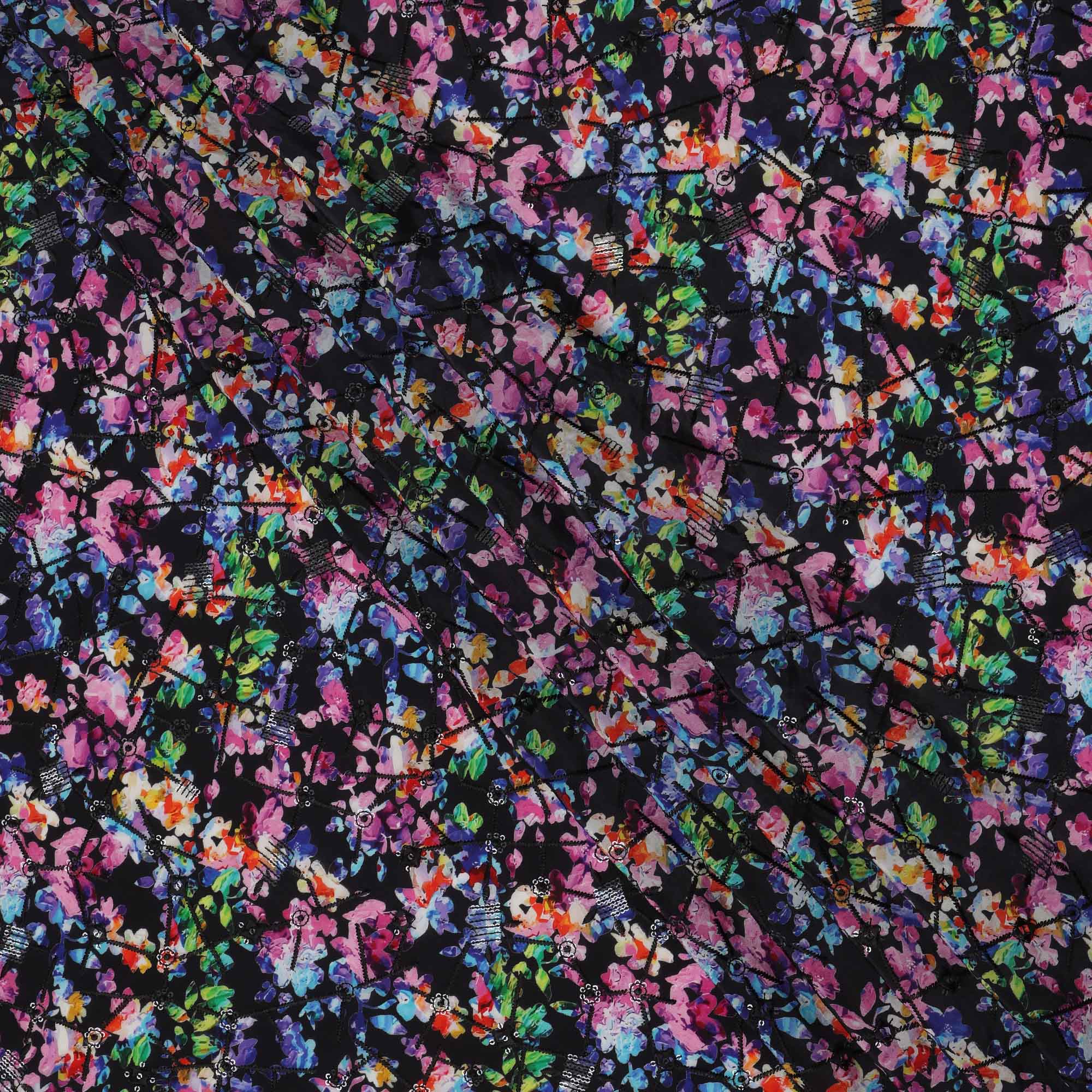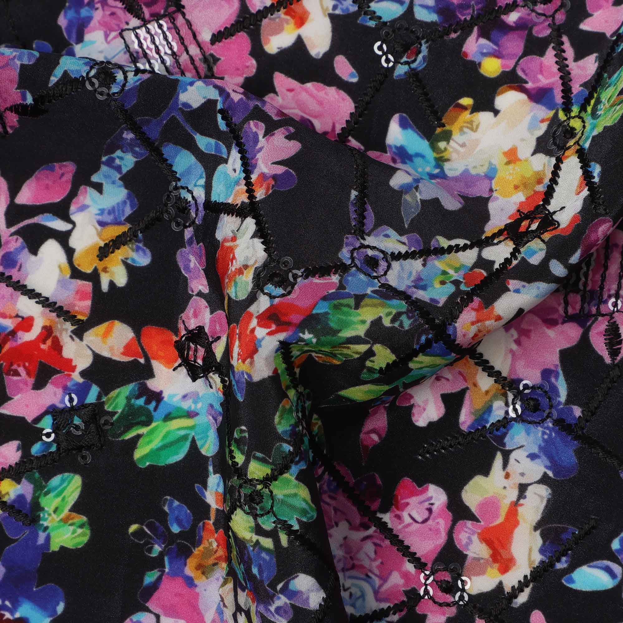 هذا القماش الرائع من كريب الفيسكوز ذو القاعدة السوداء، مزين بطباعة رقمية زاهية من زخارف نباتية وتجريدية متعددة الألوان، مما... اقرأ أكثر اقرأ أكثر