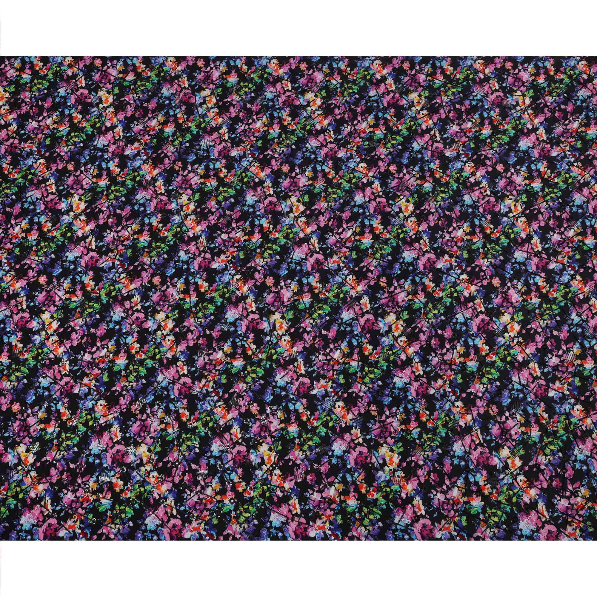 قماش كريب فيسكوز بطباعة رقمية تجريدية متعددة الألوان بقاعدة سوداء، عرض 110 سم، صنع في الهند - D23616