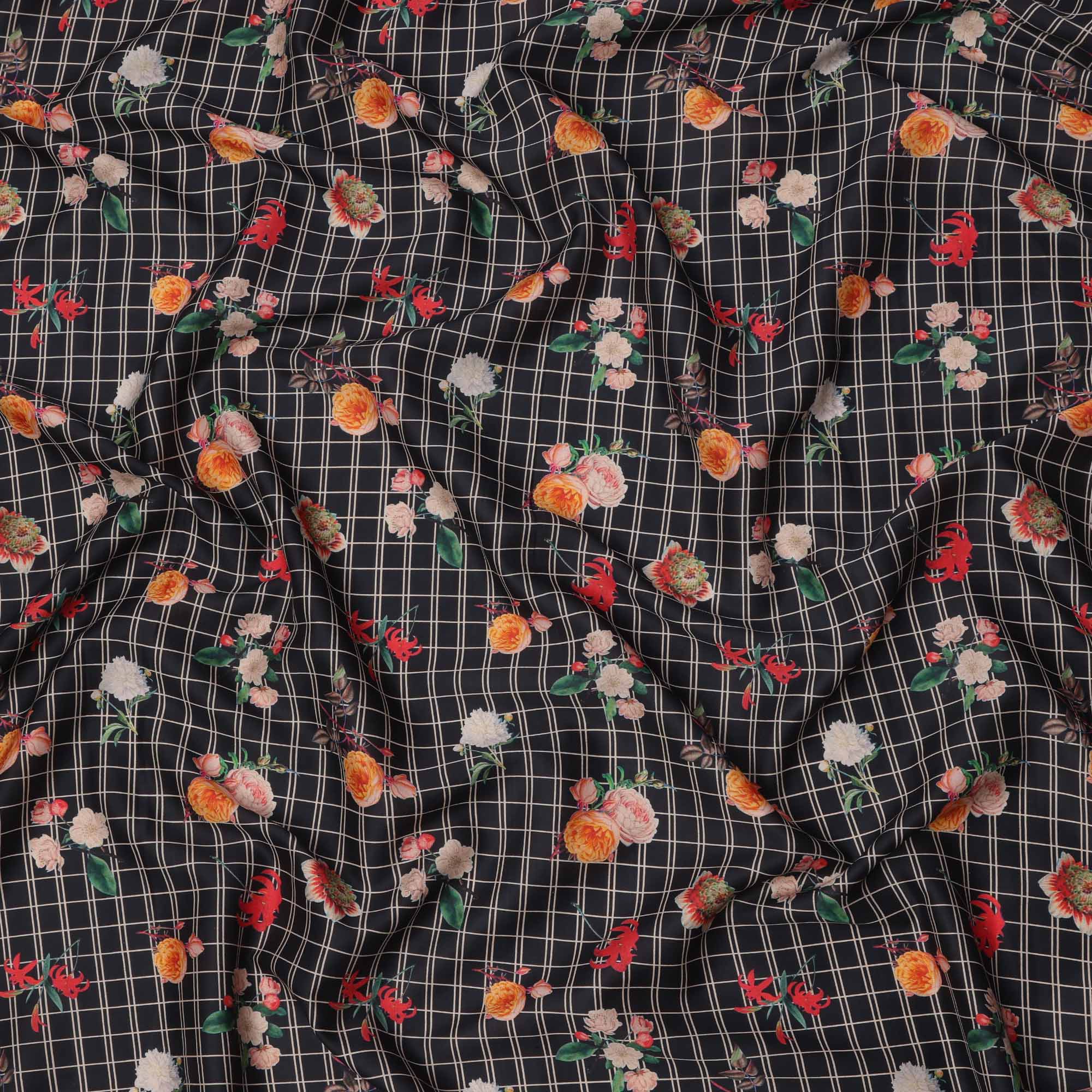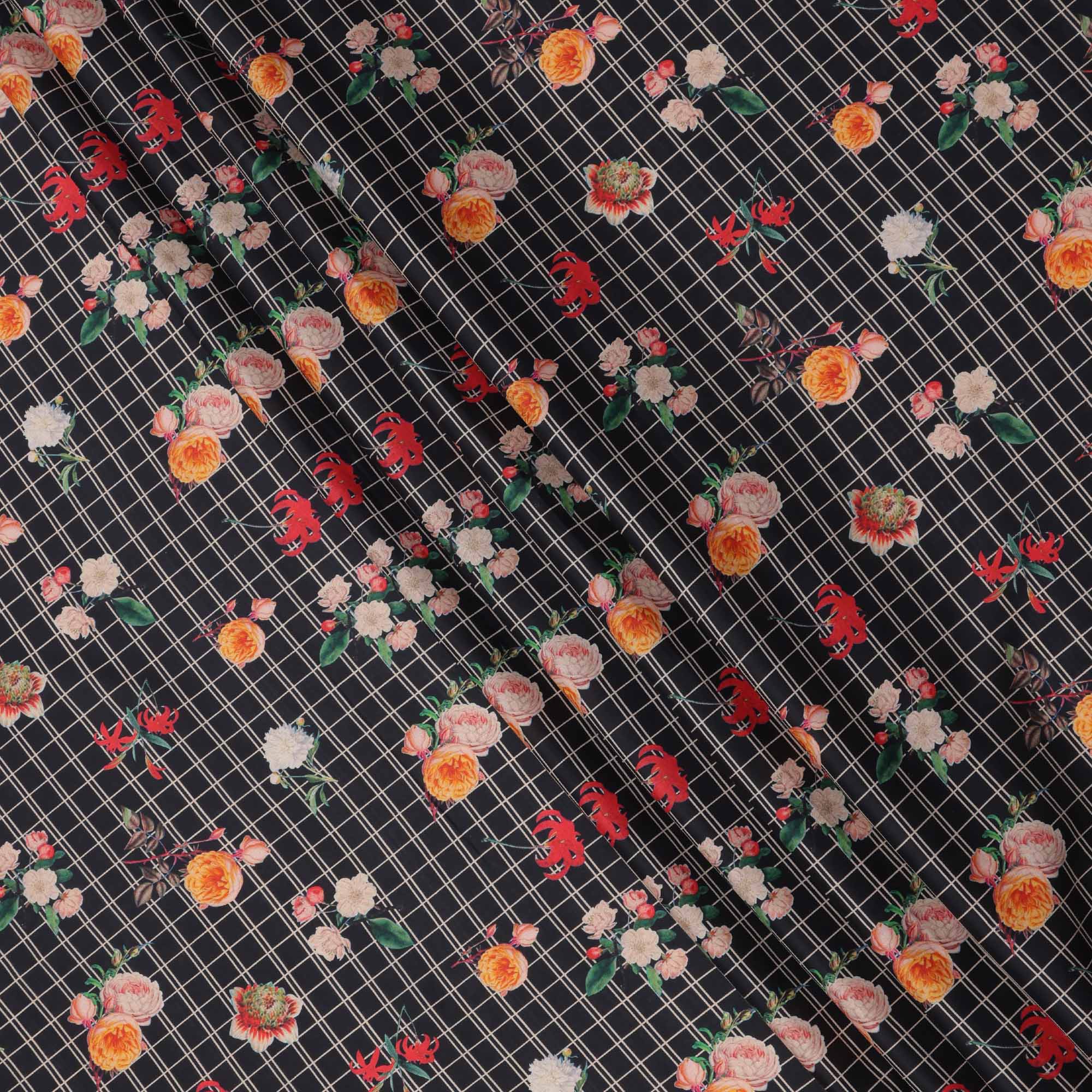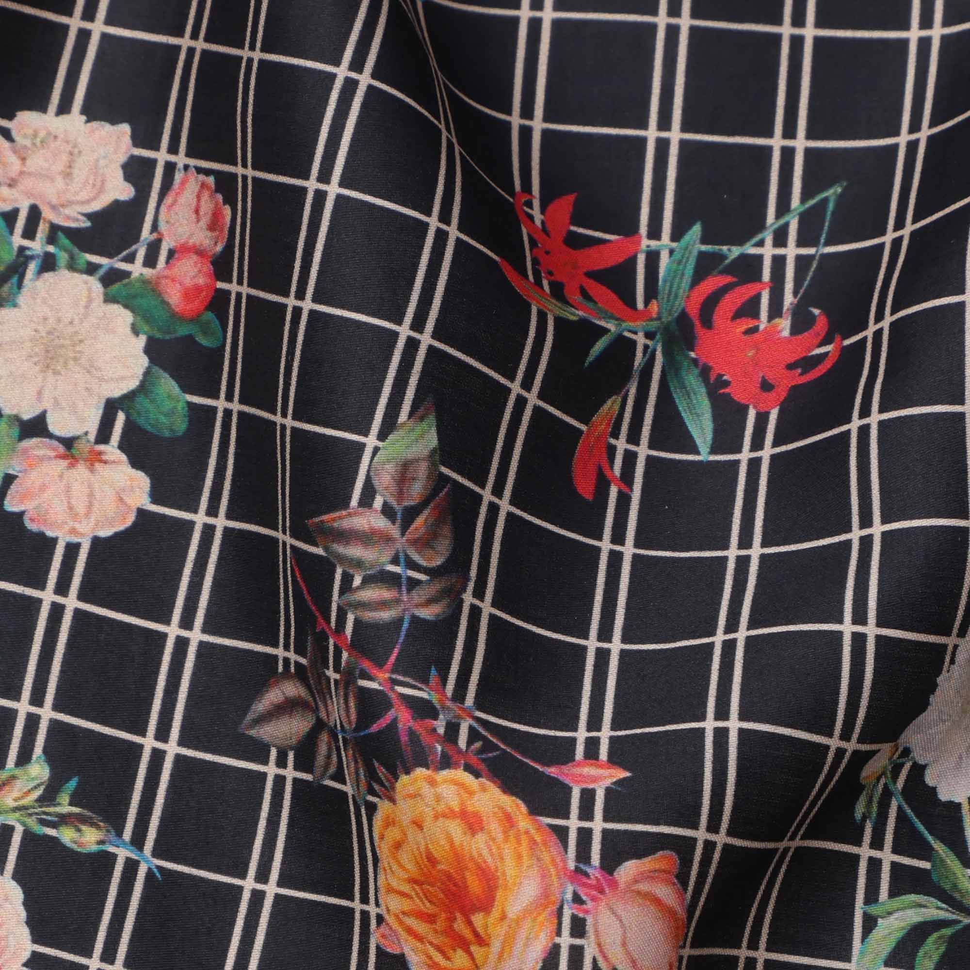 حسّني خزانة ملابسك مع هذا القماش القطني الأسود المزخرف بنقوش مربعات بيضاء وطبعات زهور زاهية. تخلق الخلفية السوداء العميقة تباينًا... اقرأ أكثر اقرأ أكثر