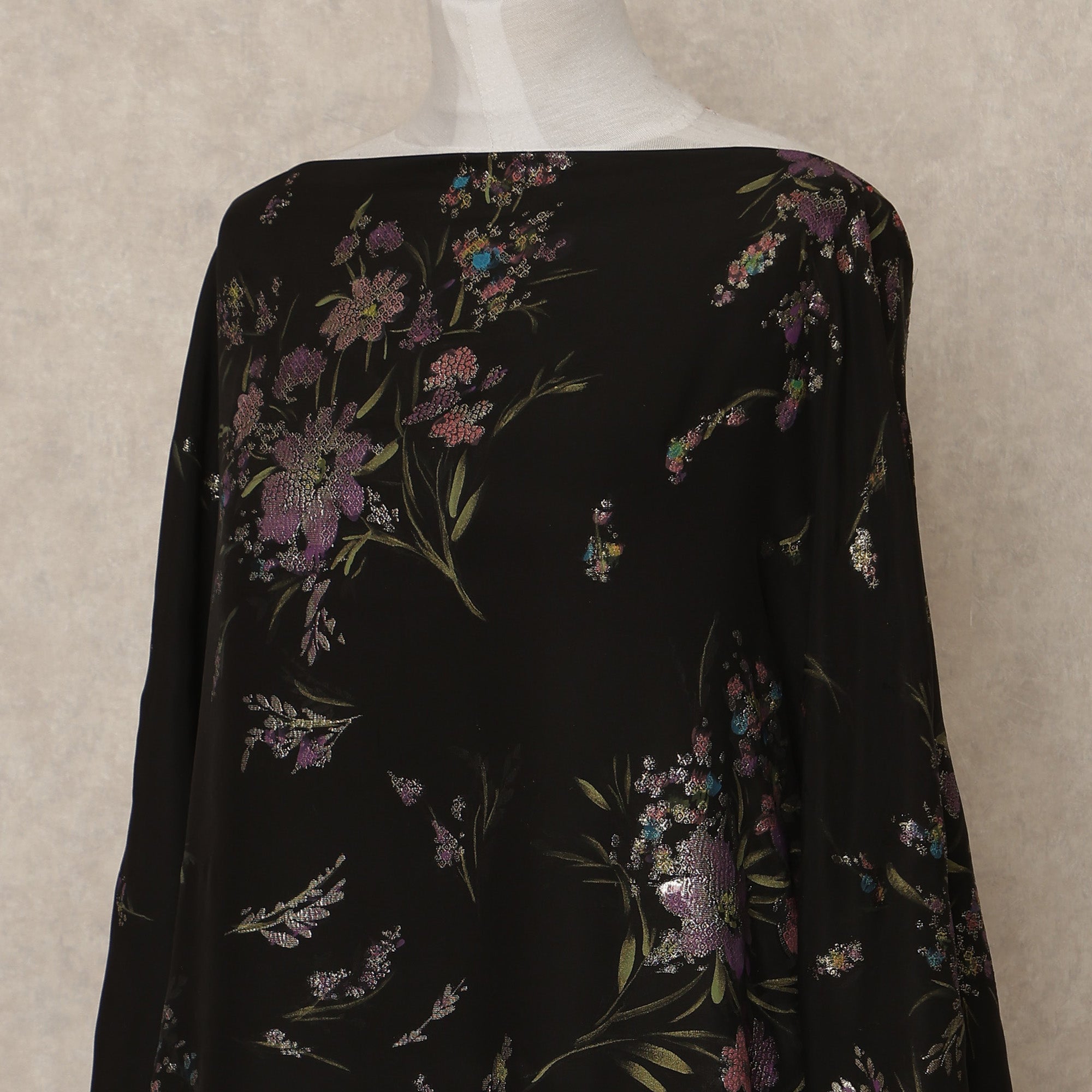 This premium pure silk satin fabric in a deep black shade features elegant multicolor floral motifs enhanced with refined metallic detailing, creating a striking contrast and sophisticated shimmer. Crafted in South Korea, this 3.5 meter piece with a generous 140 cms width offers ample fabric for designing evening gowns, dresses, sarees, blouses, scarves, and statement occasion wear. The smooth satin texture delivers a soft, fluid drape that enhances every silhouette, while the metallic accents add depth and a luxurious finish. Ideal for designers, boutiques, and sewing enthusiasts seeking bold elegance and premium quality for special and formal creations.