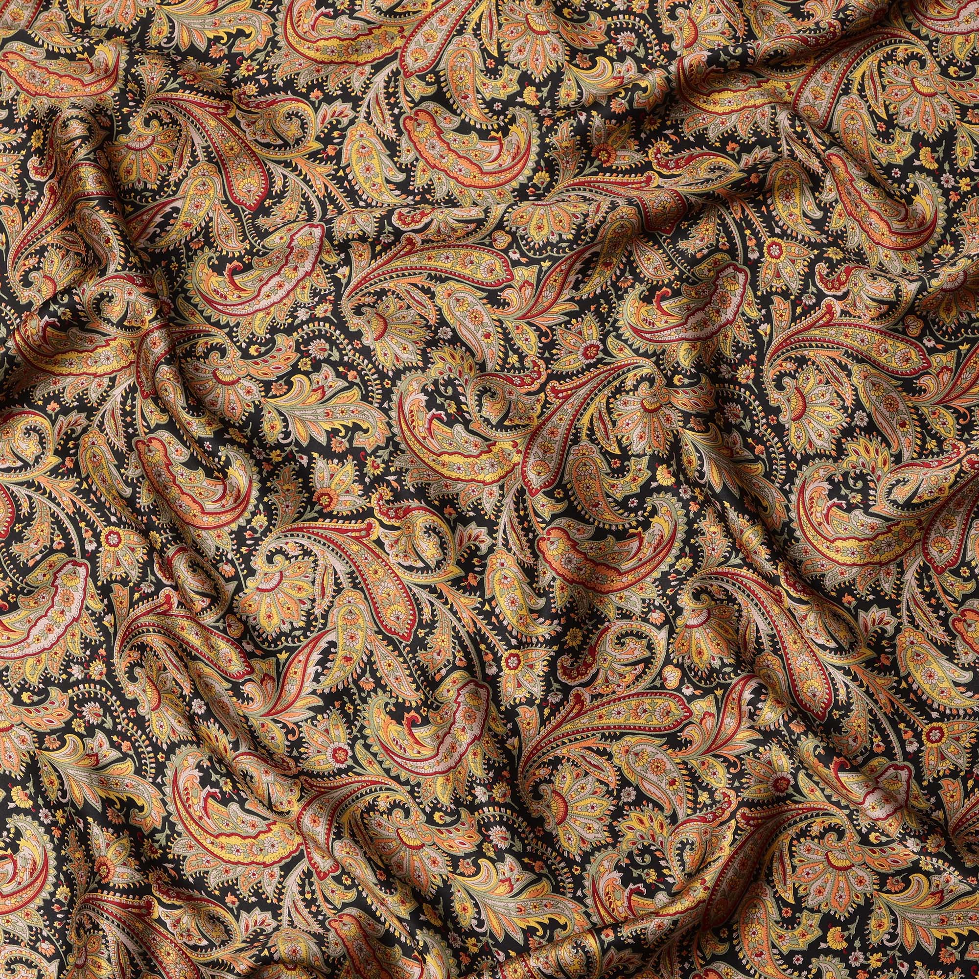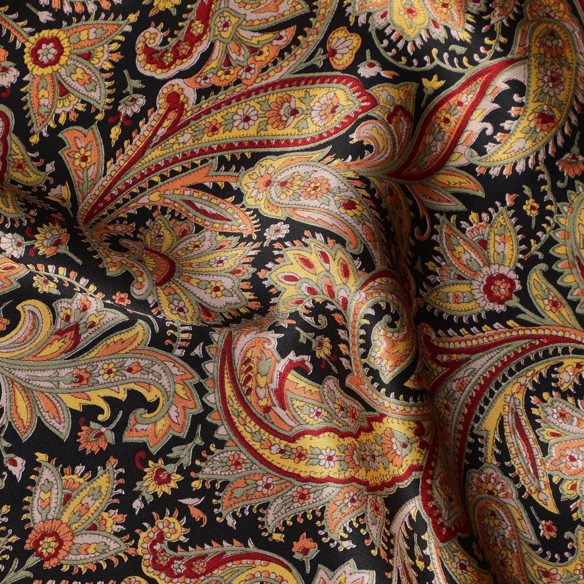 قاعدة من الساتان الحريري الأسود مع زخارف بيزلي نابضة بالحياة باللون الأحمر والذهبي والعاجي.