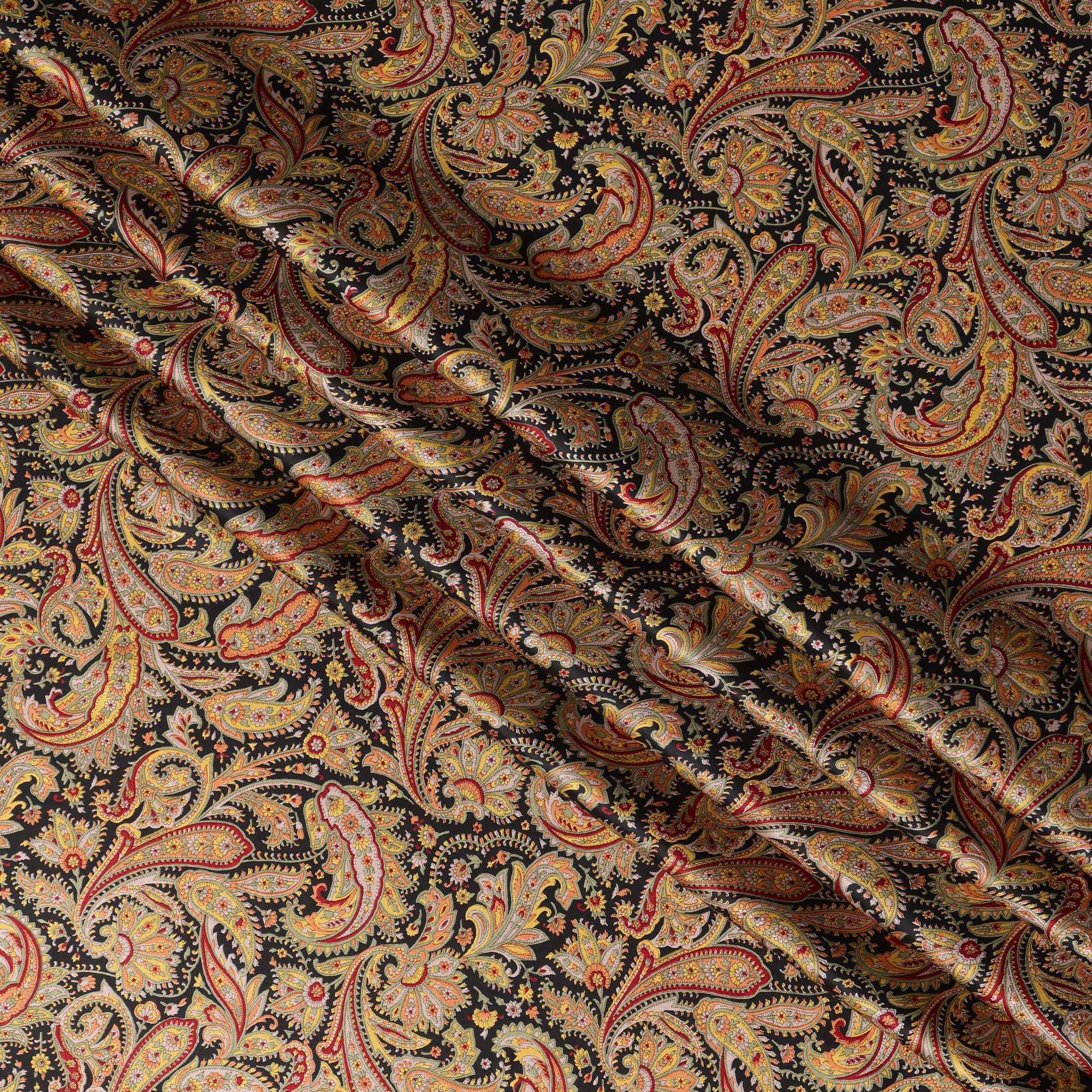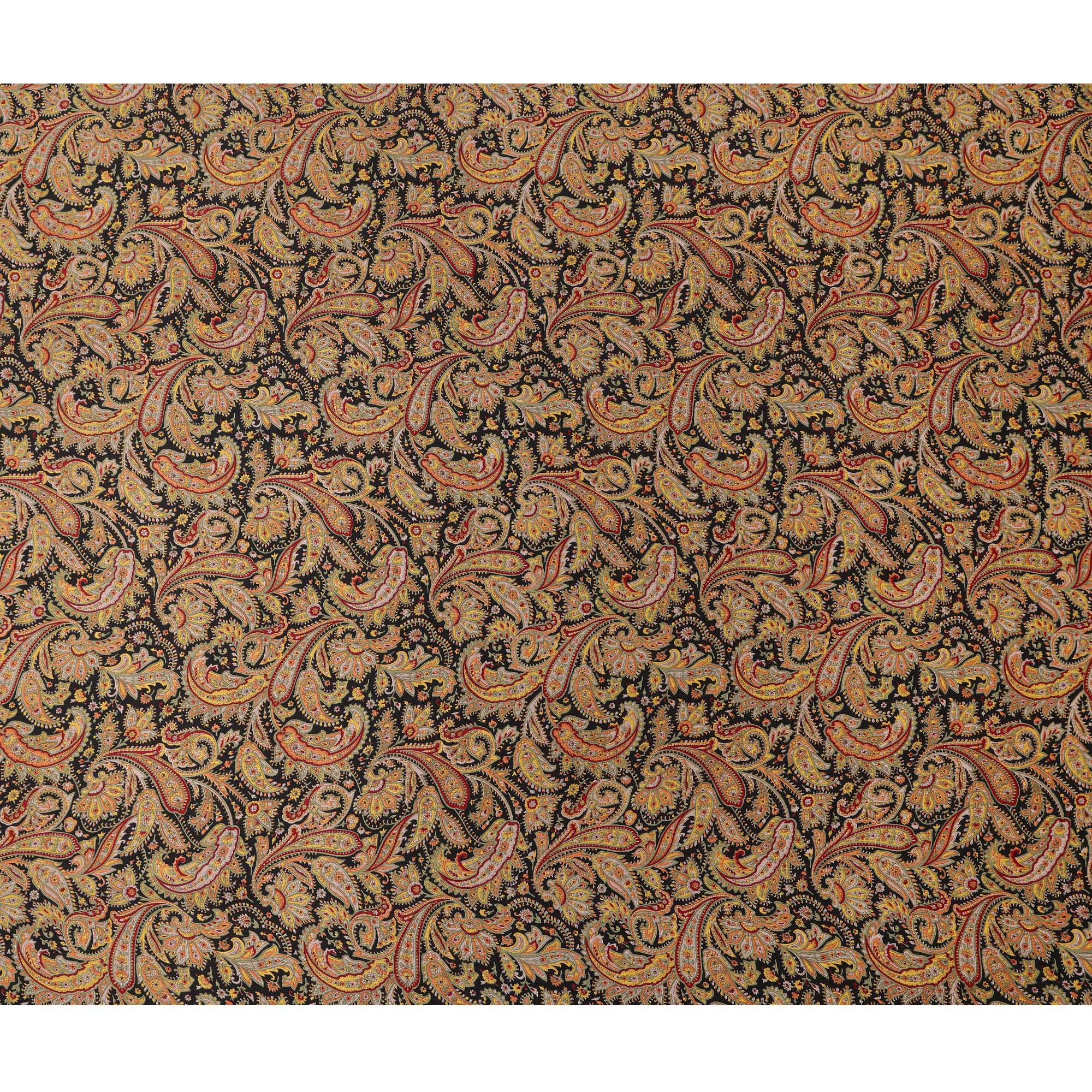 قماش حرير ساتان أسود متعدد الألوان بنقشة بيزلي بتصميم تقليدي مزخرف، عرض 110 سم، صنع في الهند - D23258