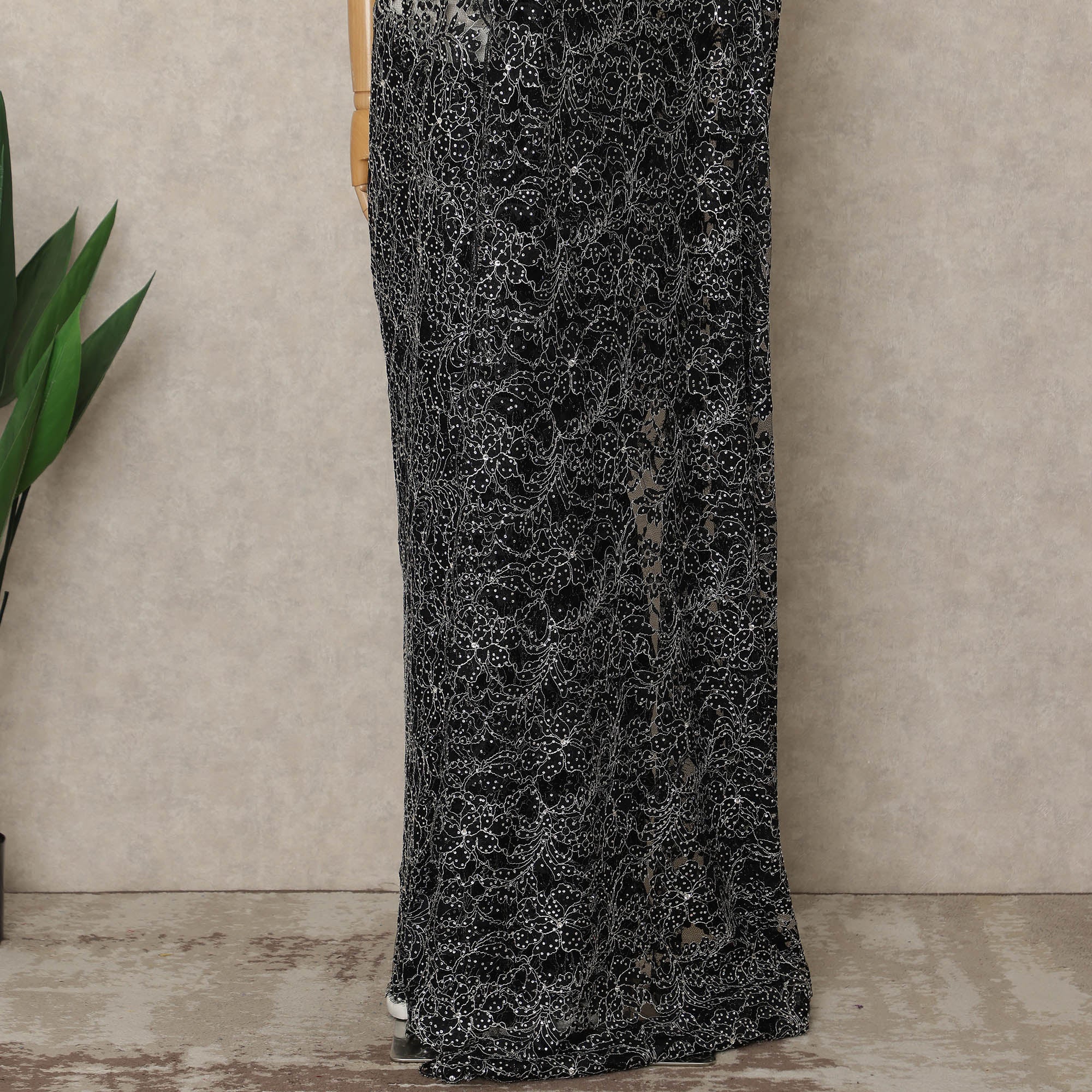 Add timeless elegance to your luxury wardrobe with this premium French Chantilly saree lace in a classic black color, exquisitely crafted in France to deliver unmatched sophistication and finesse. This refined lace showcases intricate Chantilly floral motifs delicately enhanced with subtle stone work, creating a graceful sparkle that elevates the depth of the black base. The fabric is lightweight, soft, and sheer, offering a fluid drape that beautifully contours the silhouette and enhances overall elegance. The rich black tone makes it a versatile and enduring choice for evening sarees, couture gowns, cocktail outfits, designer overlays, and statement occasion wear. This lace is available as a single piece of approximately 5.5 meters in length with a width of 110 cms, providing ample material for seamless draping and creative design applications. Blouse is not included. To preserve the delicate lace structure and stone embellishments, professional dry cleaning is recommended.