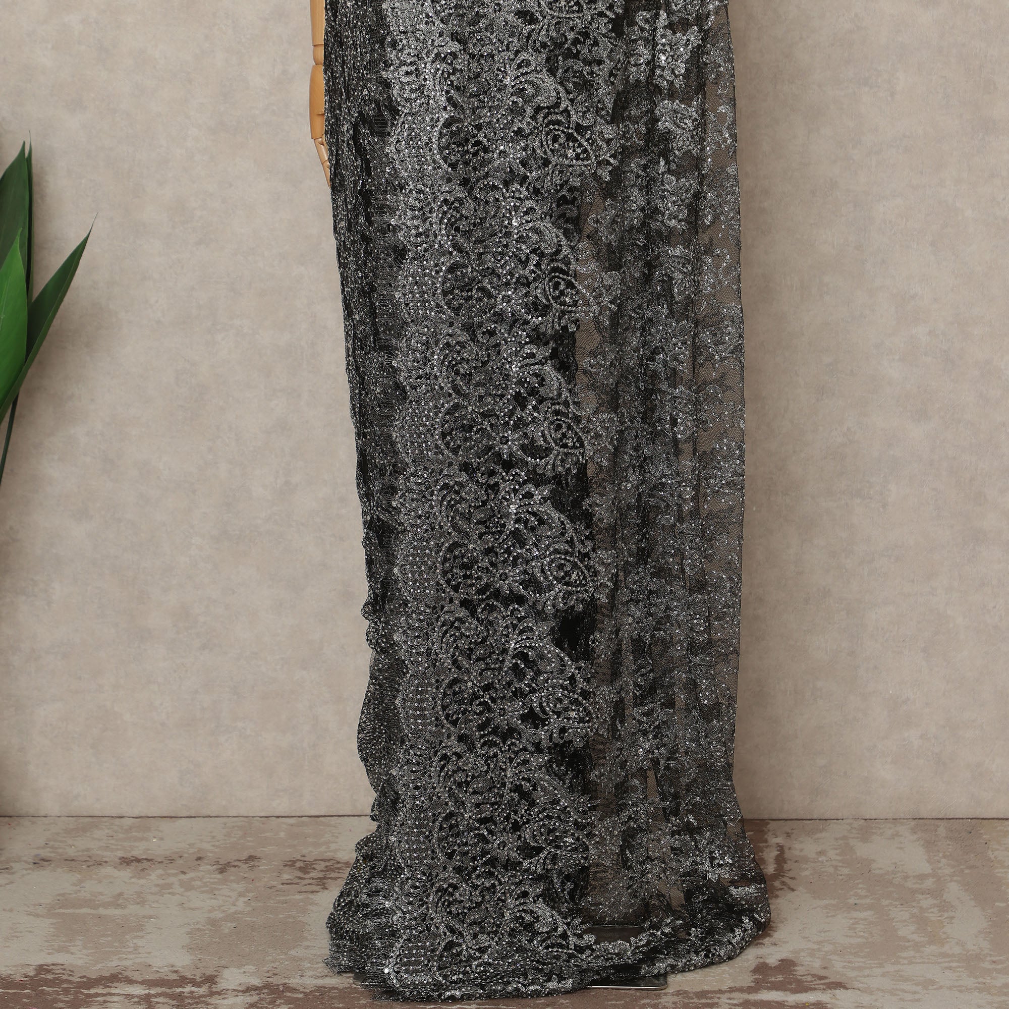 This black premium French metallic Chantilly saree lace with stonework is a striking blend of elegance and modern glamour. Crafted on a delicate sheer net base, the intricate Chantilly floral motifs are enriched with metallic threadwork and finely placed stone embellishments that create a refined, shimmering effect. The deep charcoal black tone adds dramatic depth while allowing the metallic highlights to sparkle beautifully under light, making it an exceptional choice for cocktail evenings, receptions, festive occasions, and couture celebrations. Designed and crafted in France, this lace reflects superior artistry and luxurious detailing. Measuring approximately 5.5 meters in length and 110 cms in width, it offers ample fabric for a graceful saree drape with fluid movement and sophisticated appeal. Blouse not included.
