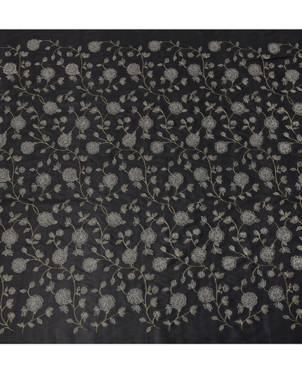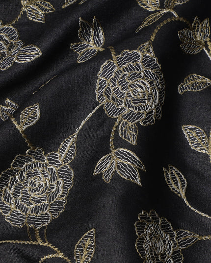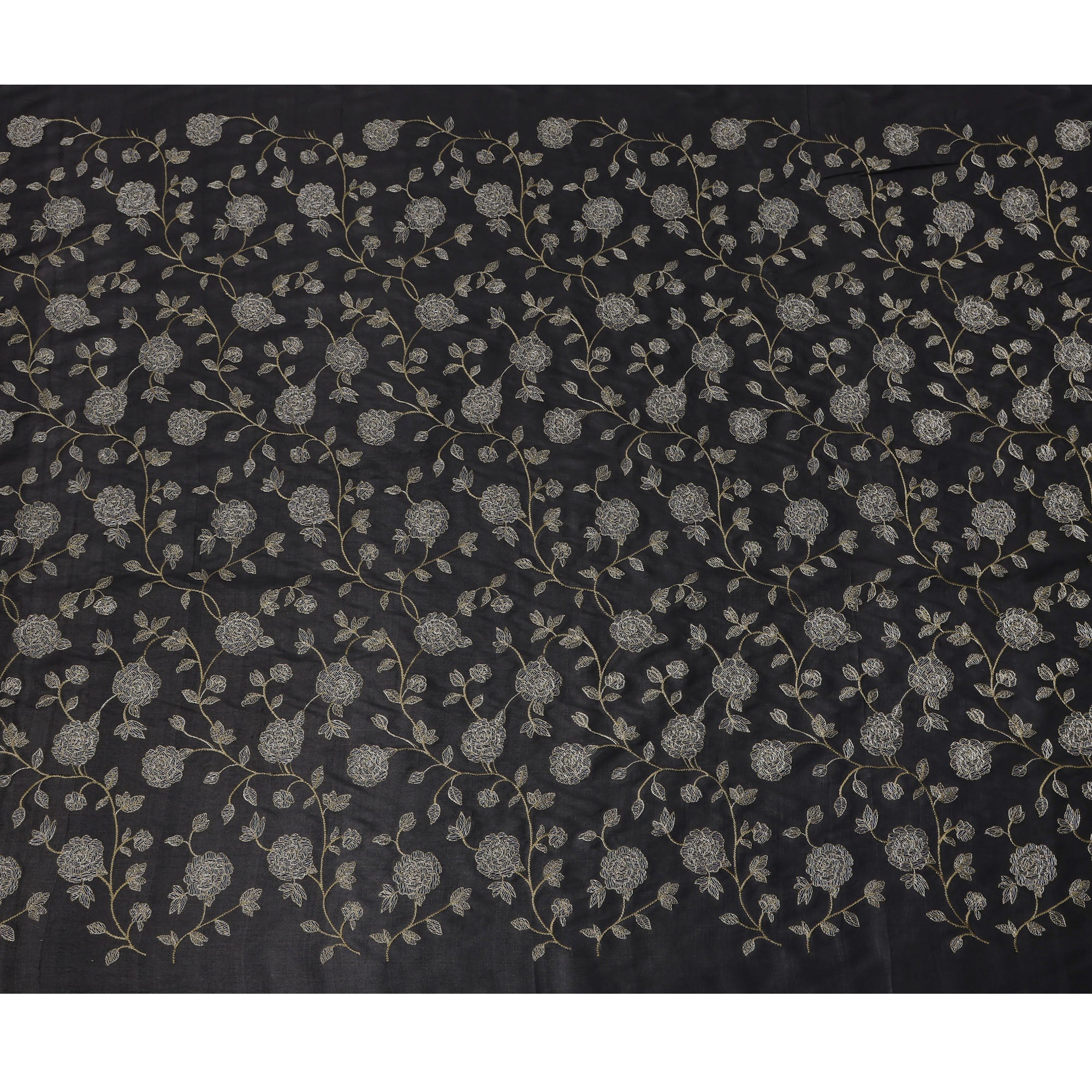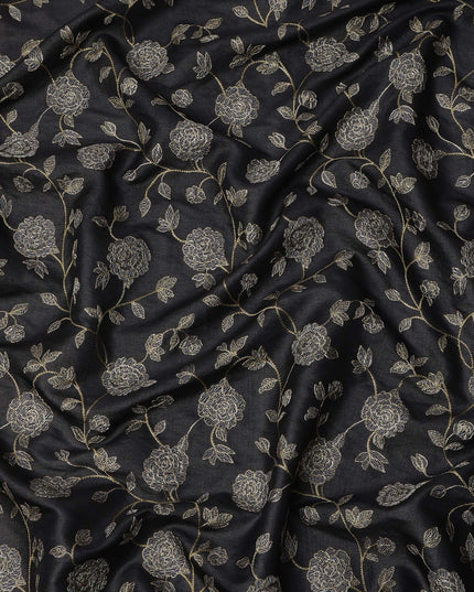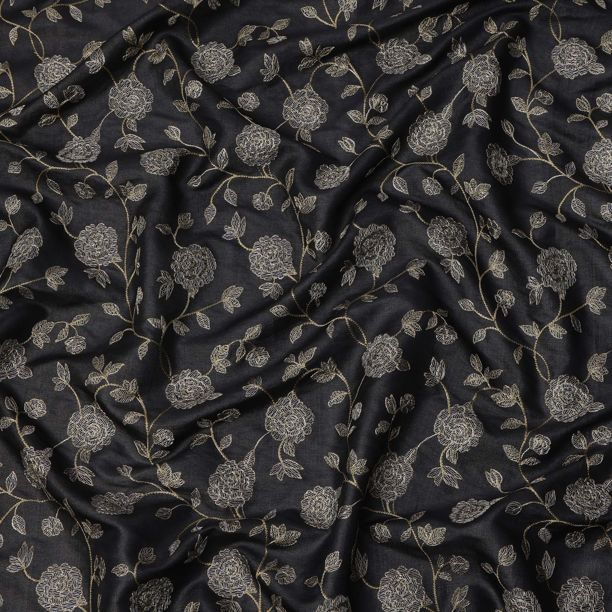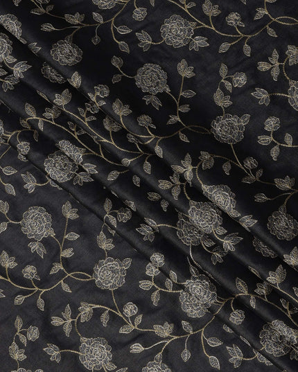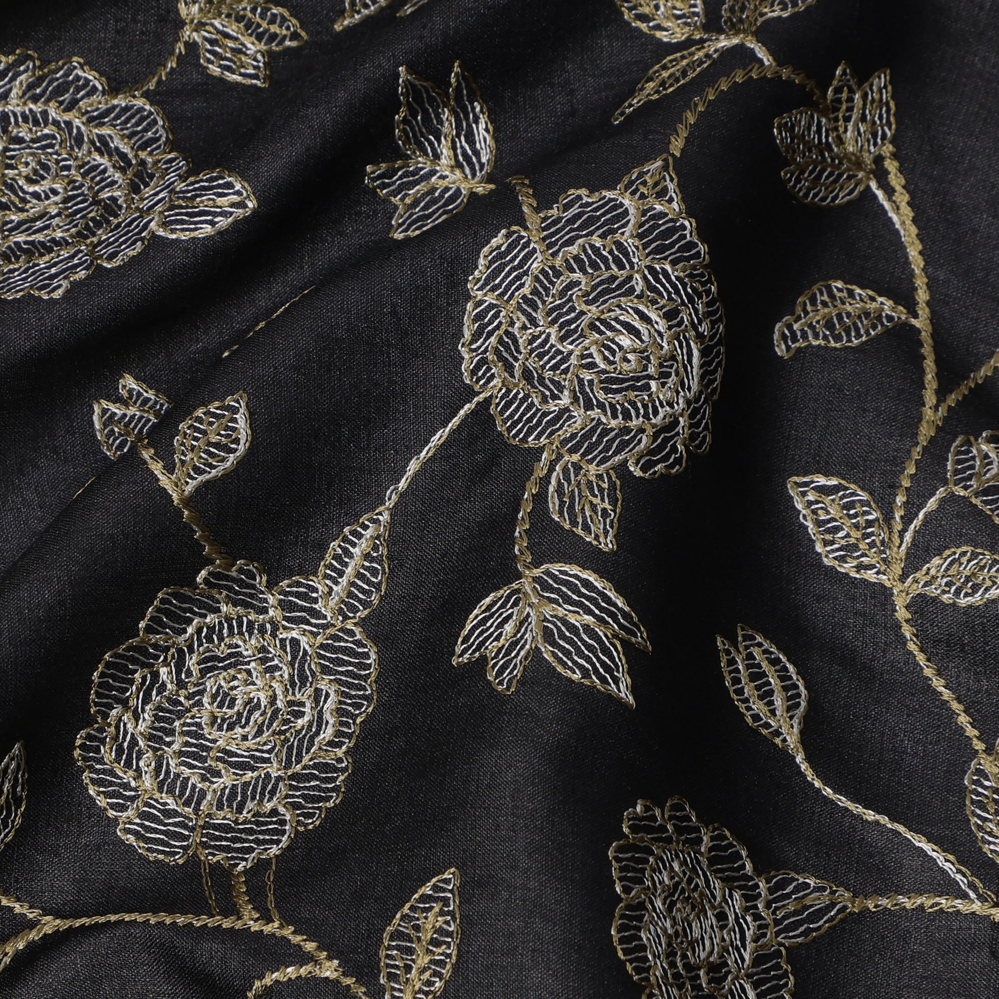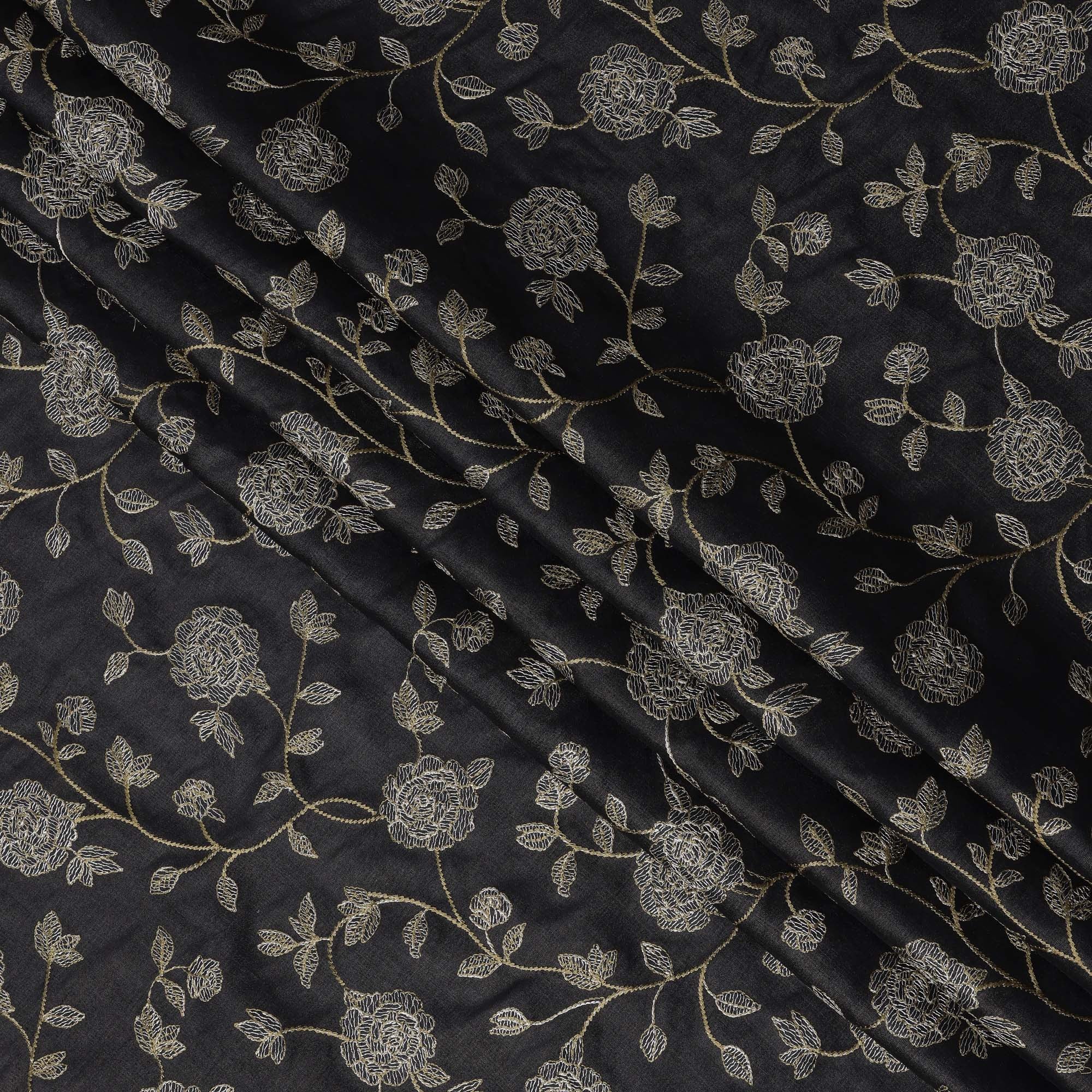 قماش حرير توسار مطرز بزهرة الكرمة السوداء مع تفاصيل خيط بيج، 110 سم، الهند - D23381