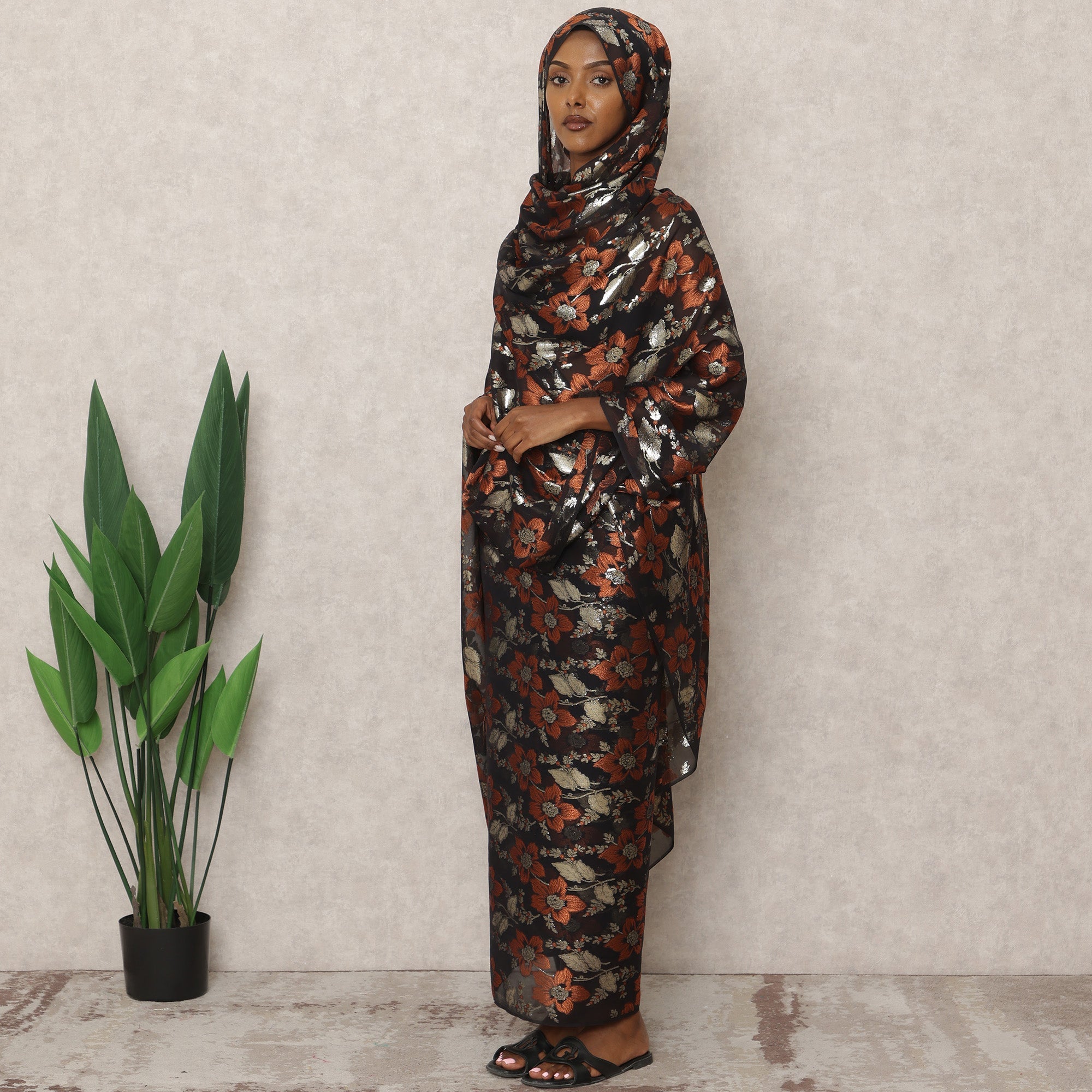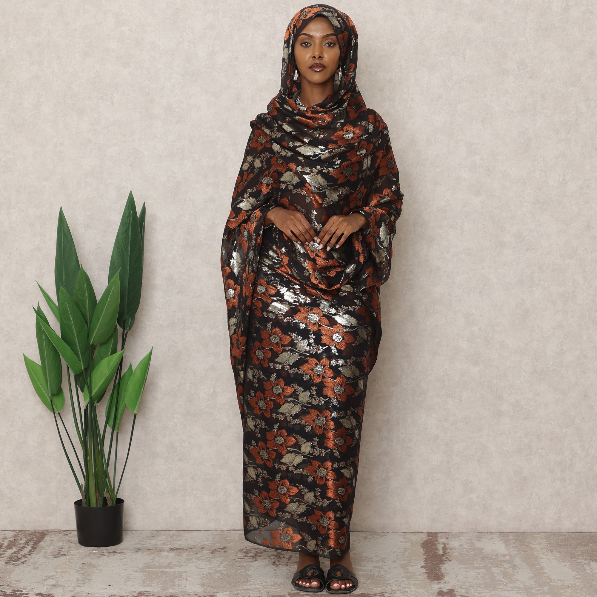 ثوب سوداني تقليدي أسود، مصنوع من قماش شيفون حرير نقي بطول 4.5 متر وقماش لوركس معدني مزهر، عرض 140 سم، صنع في كوريا الجنوبية - D24496