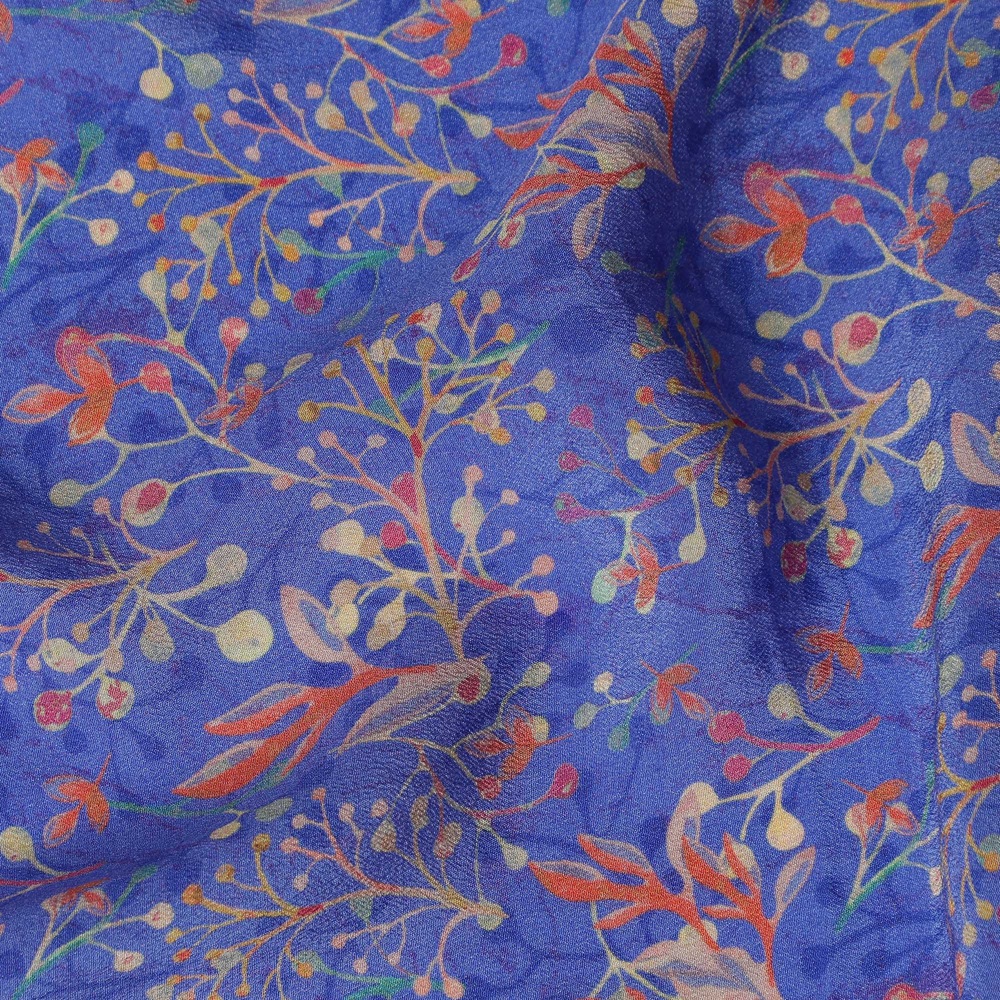 This premium pure silk crepe fabric features a rich blue base beautifully highlighted with delicate multicolor floral and branch-inspired prints that create a refined and artistic look. Crafted from pure silk crepe in India, the fabric has a soft, lightly textured surface with an elegant matte finish that drapes effortlessly and flows with natural grace. With a width of 110 cms, it is perfectly suited for designing sophisticated dresses, sarees, blouses, tunics, skirts, scarves, and high-end fusion wear. Lightweight, breathable, and gentle on the skin, this fabric offers exceptional comfort while maintaining a luxurious feel. Its vibrant color palette combined with premium silk quality makes it ideal for festive creations, designer outfits, and exclusive custom tailoring projects.