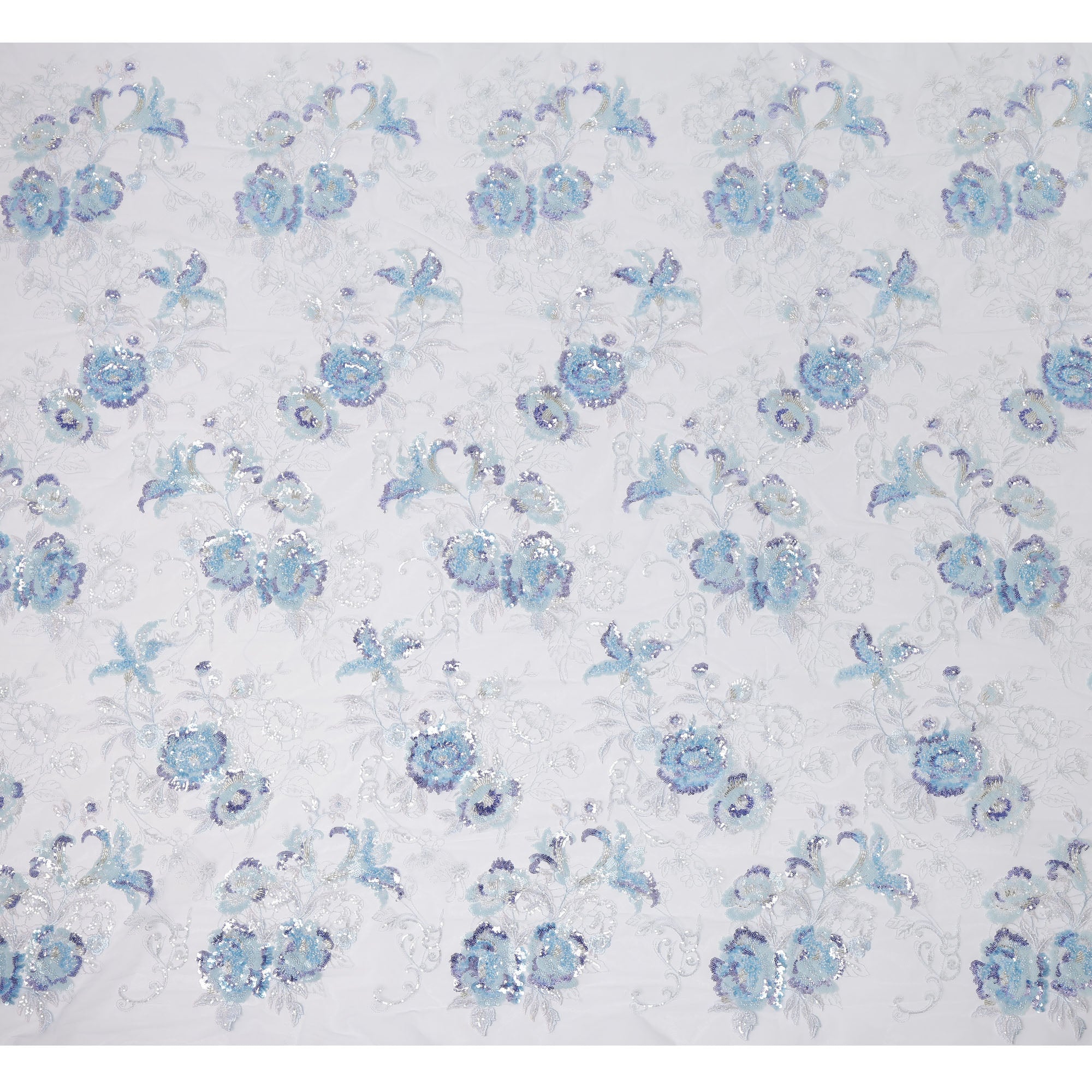 Blue multi-tone nylon tulle with floral sequin and thread embroidery