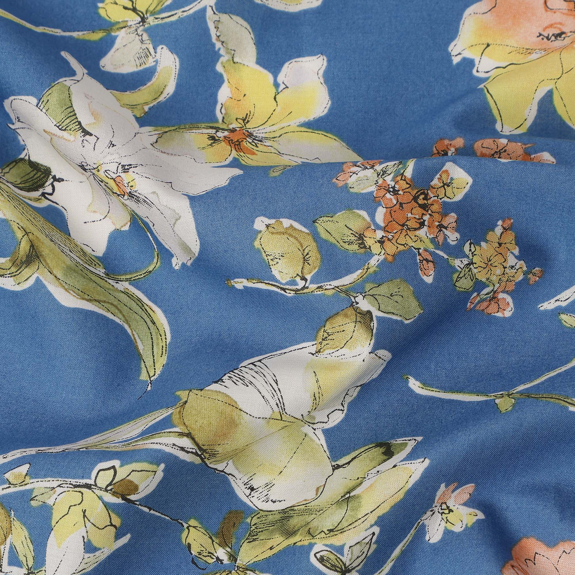 This Blue Multicolor Botanical Floral Print Cotton Lawn Fabric captures the freshness of a blooming garden, featuring a vibrant blue base adorned with intricately illustrated flowers in shades of white, peach, orange, and soft green. The delicately sketched vines and blossoms add a graceful, nature-inspired charm, while the premium Japanese cotton lawn weave ensures exceptional breathability, a feather-light feel, and a smooth, elegant drape perfect for dresses, kurtis, tops, shirts, and breezy summer wear. Its refined finish and durable structure provide long-lasting comfort and versatility, making it ideal for both casual styling and designer creations. Perfect for creators and fashion enthusiasts who shop online for superior-quality textiles, this fabric seamlessly blends artistry, craftsmanship, and sophistication in every meter.
