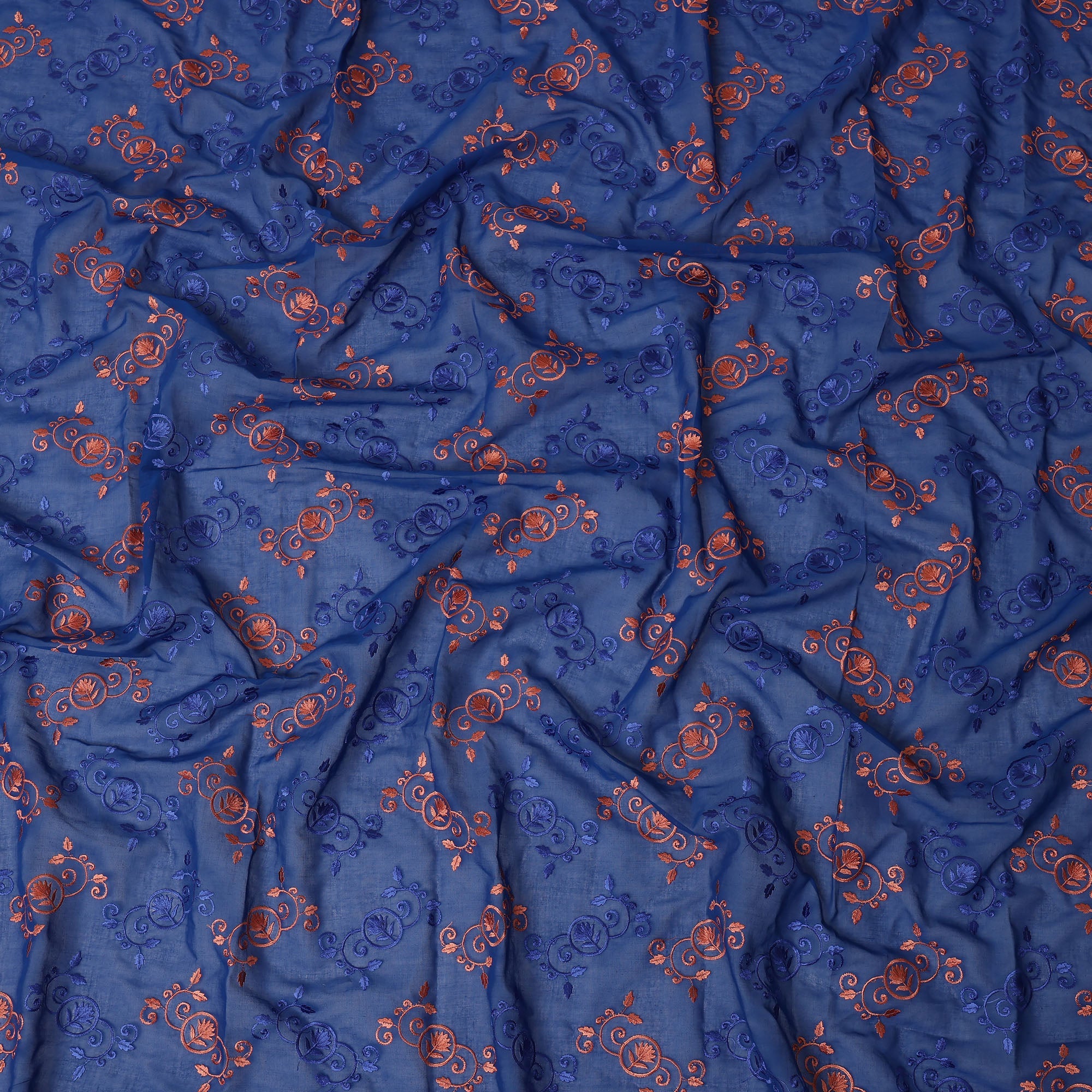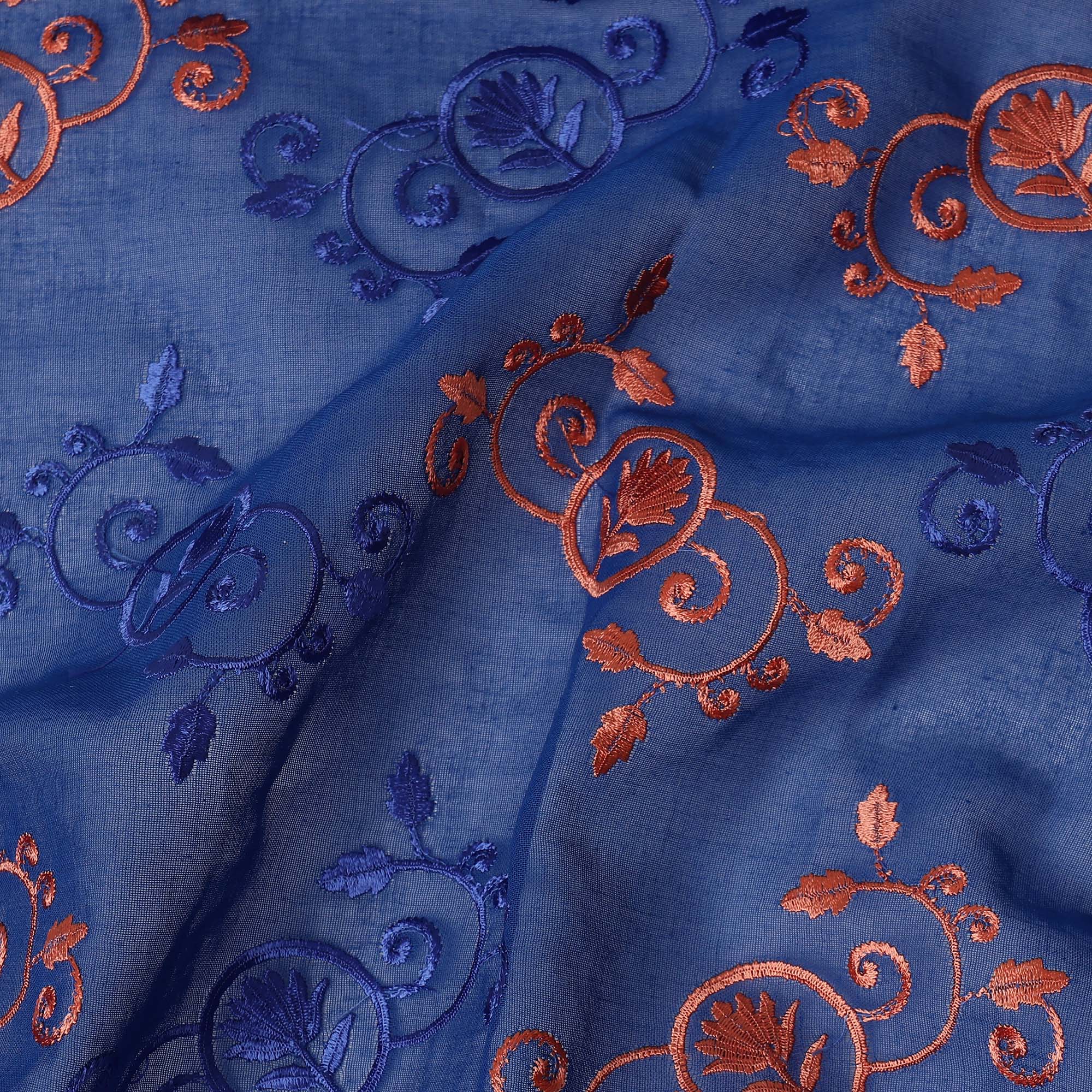 Rich blue base with intricate copper and royal blue embroidered floral motifs