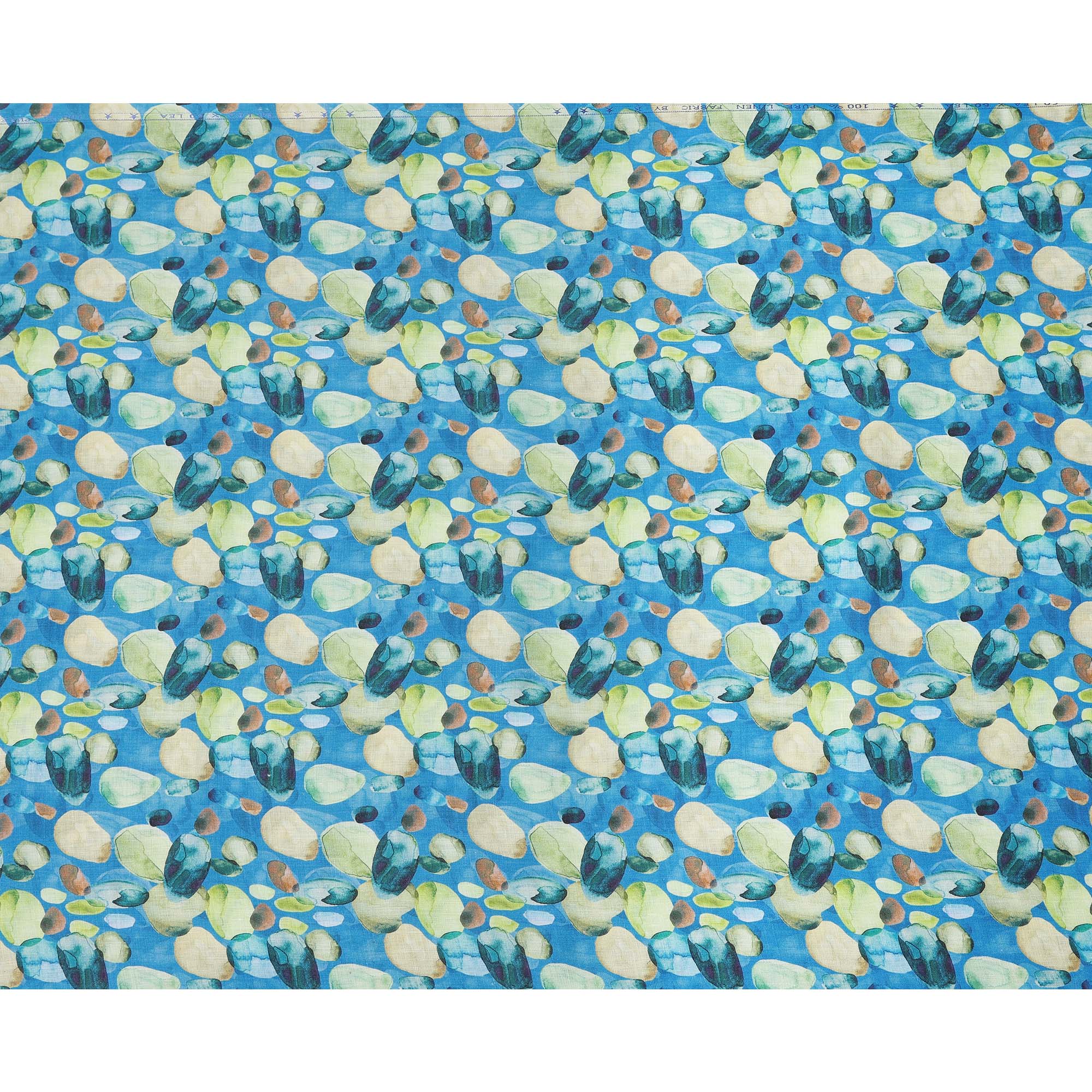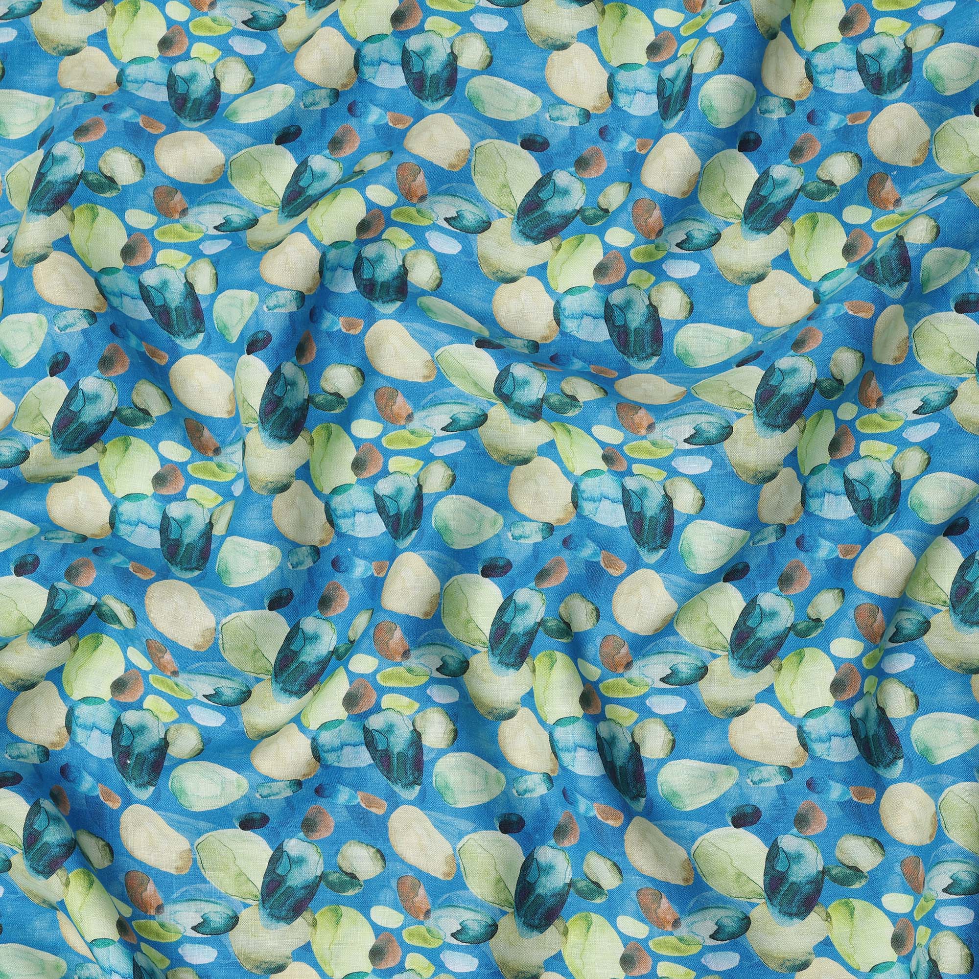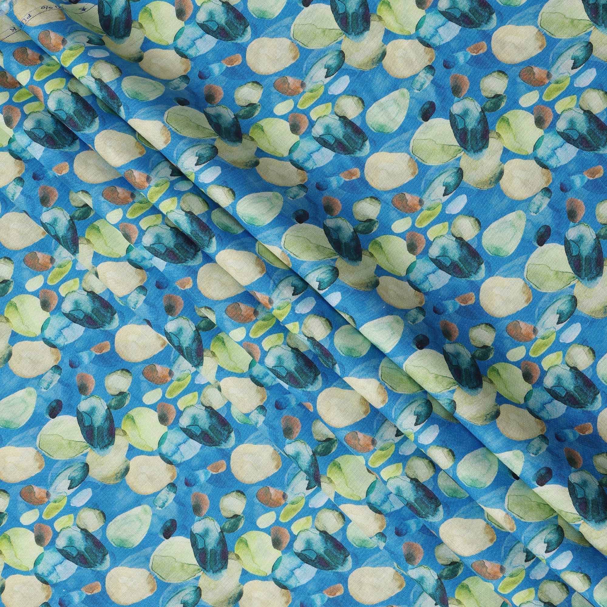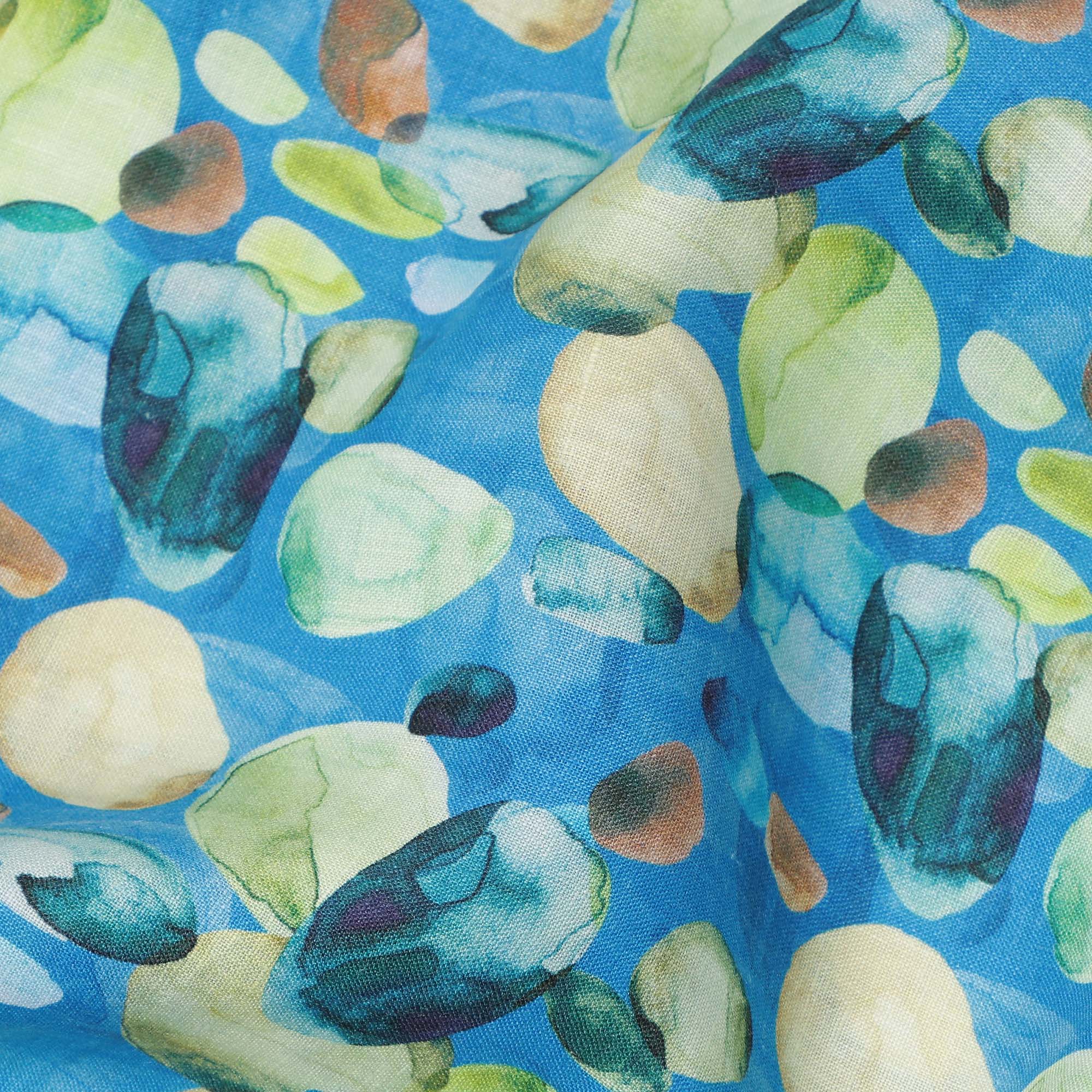 قماش كتان أزرق خالص مطبوع عليه زهور تجريدية بتصميم متعدد الألوان الأخضر والبيج، عرض 140 سم، صنع في الهند - D25073