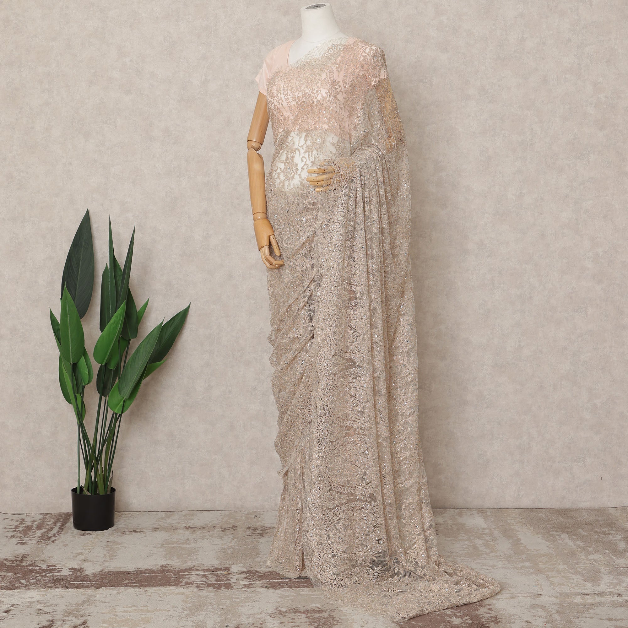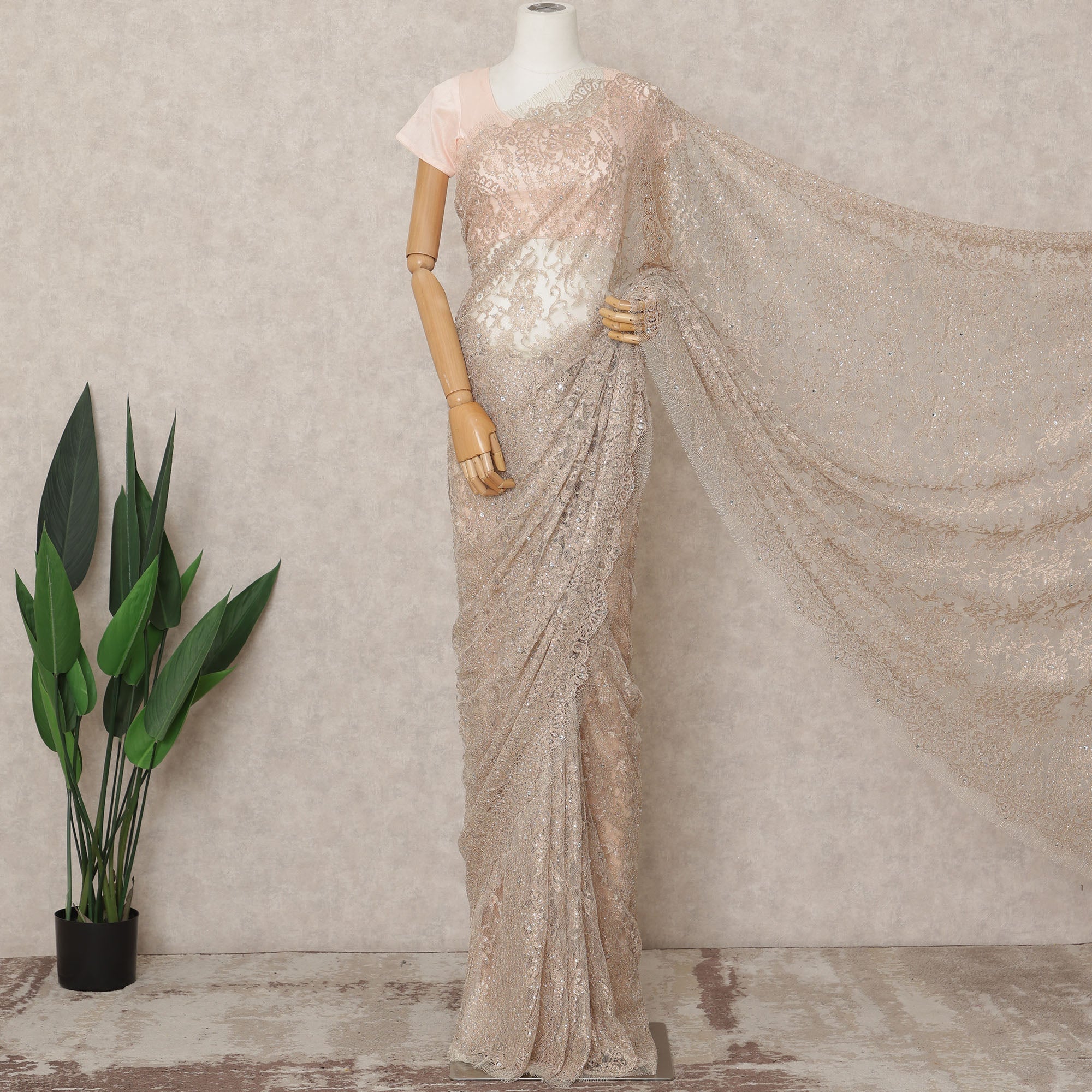 زيّني لحظاتكِ الخاصة بأناقة ناعمة مع هذا الساري المعدني الفاخر من الدانتيل الشانتيلي بلون الخوخ، وهو ستارة فرنسية الصنع رائعة... اقرأ أكثر اقرأ أكثر