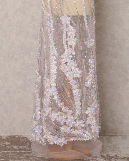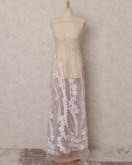 قماش نايلون تول مطرز بنقشة زهور ثلاثية الأبعاد باللون الوردي الفاتح مع ترتر، 3.5 متر، 135 سم، الهند - D22354