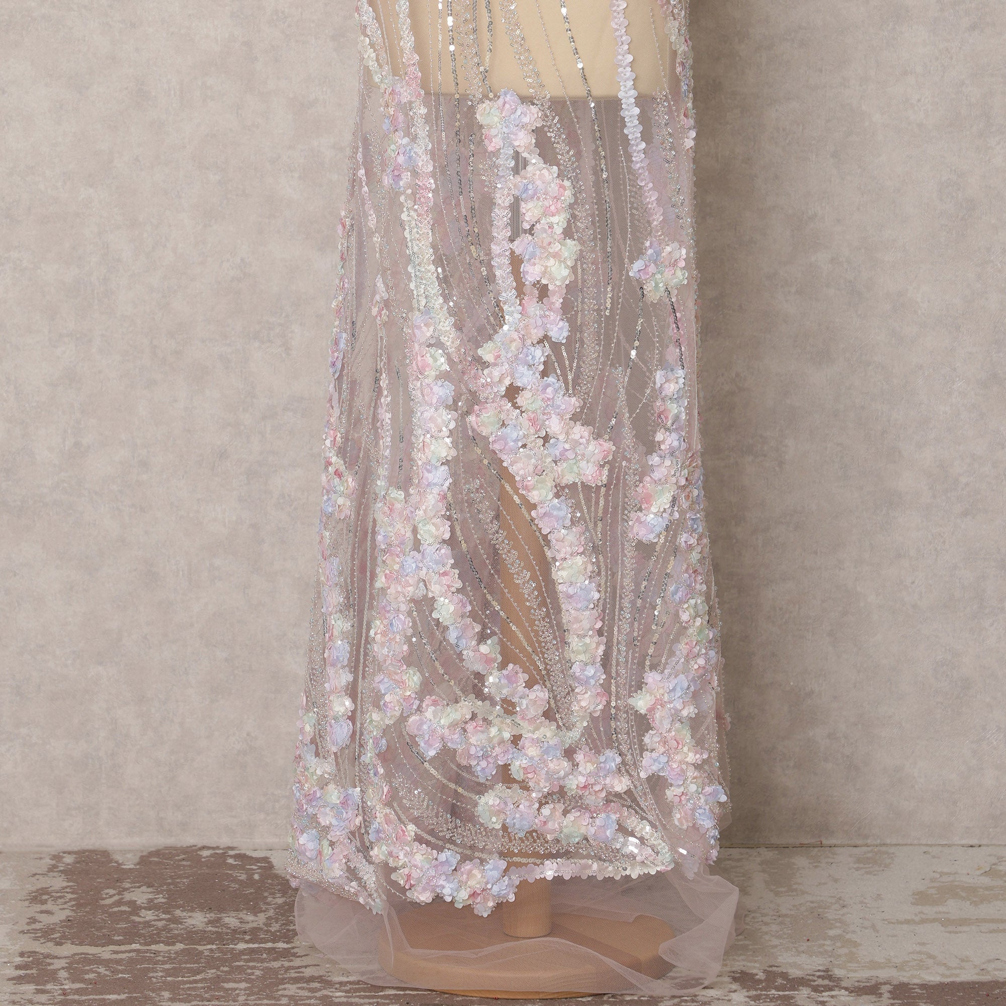 استمتعي بالفخامة مع هذا القماش المصنوع من التول النايلوني الوردي، والمُزين بتطريزات زهرية ثلاثية الأبعاد مُتقنة وزخارف ترتر لامعة. صُنع هذا القماش بإتقان، بعرض 135 سم، وهو مُصمم خصيصًا للأزياء الراقية، وفساتين الزفاف، والفساتين الراقية. تُضفي قاعدة التول الناعمة لمسةً من الانسيابية الرقيقة، بينما تُضفي الزخارف الزهرية المطرزة يدويًا والخرز الرقيق عمقًا ورقيًا. مثالي للمصممين الذين يبحثون عن فساتين سهرة أنيقة، أو ساري، أو طبقات مُلفتة. يُعزز نسيجه الشفاف جاذبيته متعددة الاستخدامات، مما يجعل تنسيقه مع طبقات أمرًا في غاية السهولة. يُعد هذا القماش قطعةً أساسيةً لإبداعات الموضة العصرية، فهو يضمن جودةً فائقةً مع لمسةٍ من الأناقة.