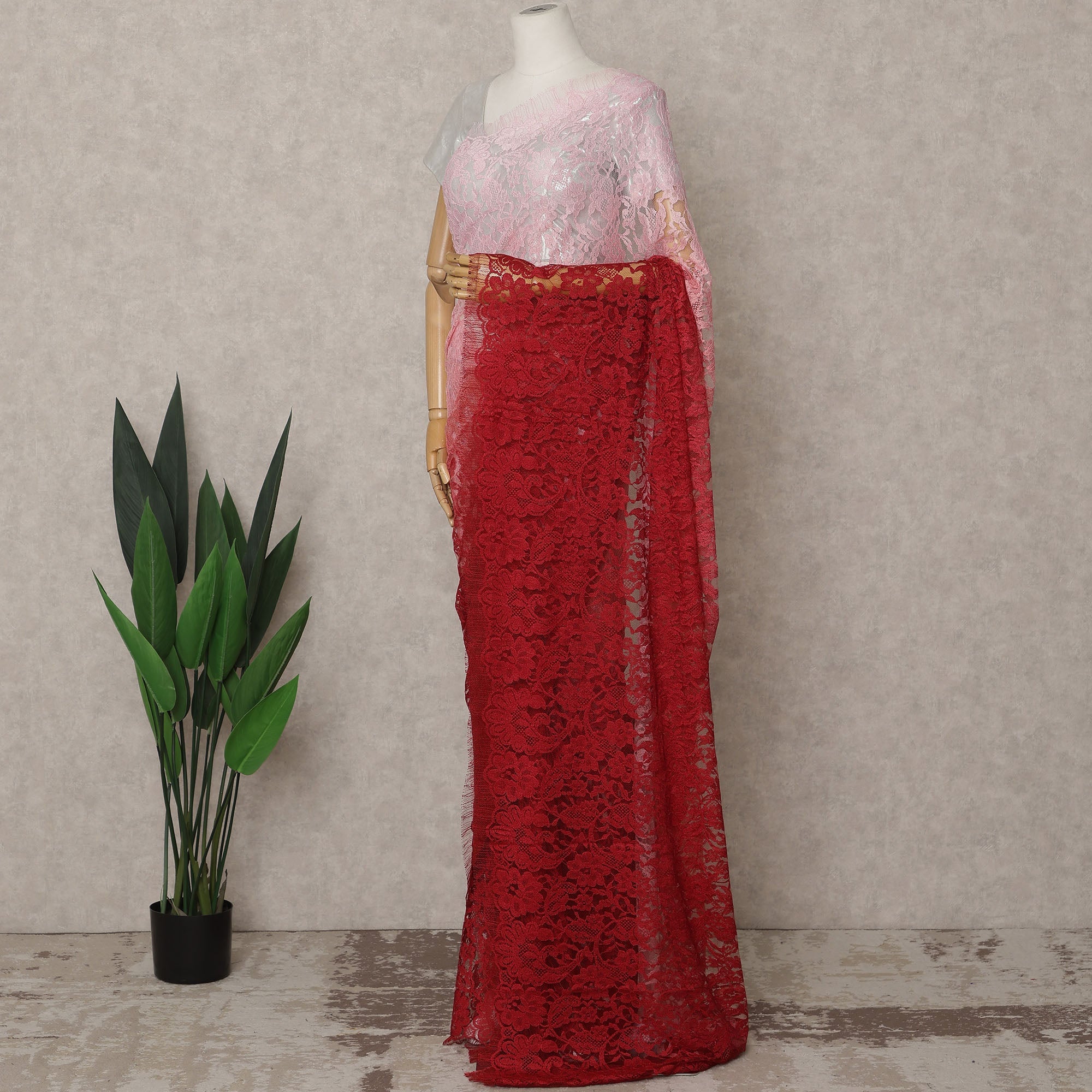 Blush Pink and Red Premium French Ombre Chantilly Lace Saree – 5.5 Meters Length, 110 Cms Width, Crafted in France-D26097
