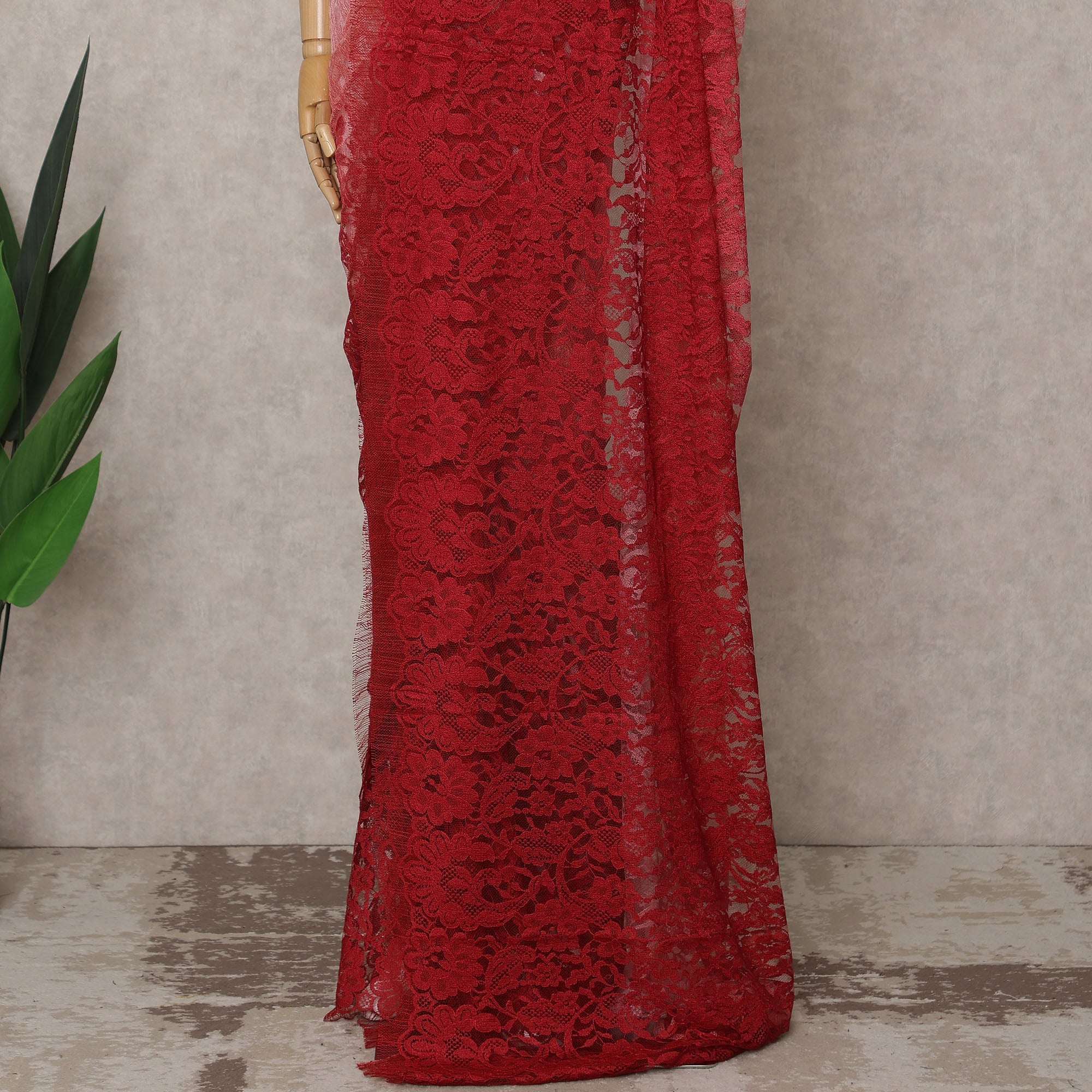 Radiate elegance and sophistication with this Blush Pink and Red Premium French Ombre Chantilly Lace Saree, an exquisite creation that beautifully blends the romance of pink hues with the vibrancy of red tones. Expertly crafted in France, this saree features intricate floral Chantilly lace with a graceful ombre gradient that transitions seamlessly from soft blush pink to rich crimson red, offering a modern yet timeless aesthetic. The delicate lace fabric drapes effortlessly, highlighting feminine grace and adding an air of refinement to every occasion. With a width of 110 cms and a 5.5-meter length, it allows ample fabric for elegant pleating and stylish pallu draping, making it ideal for weddings, festive gatherings, or evening soirées. Lightweight and breathable, the saree offers all-day comfort without compromising its luxurious look. A perfect fusion of French craftsmanship and traditional elegance, it’s a must-have statement piece for every wardrobe. Care Instructions: Dry clean only to maintain the delicate lace texture. Blouse not included.